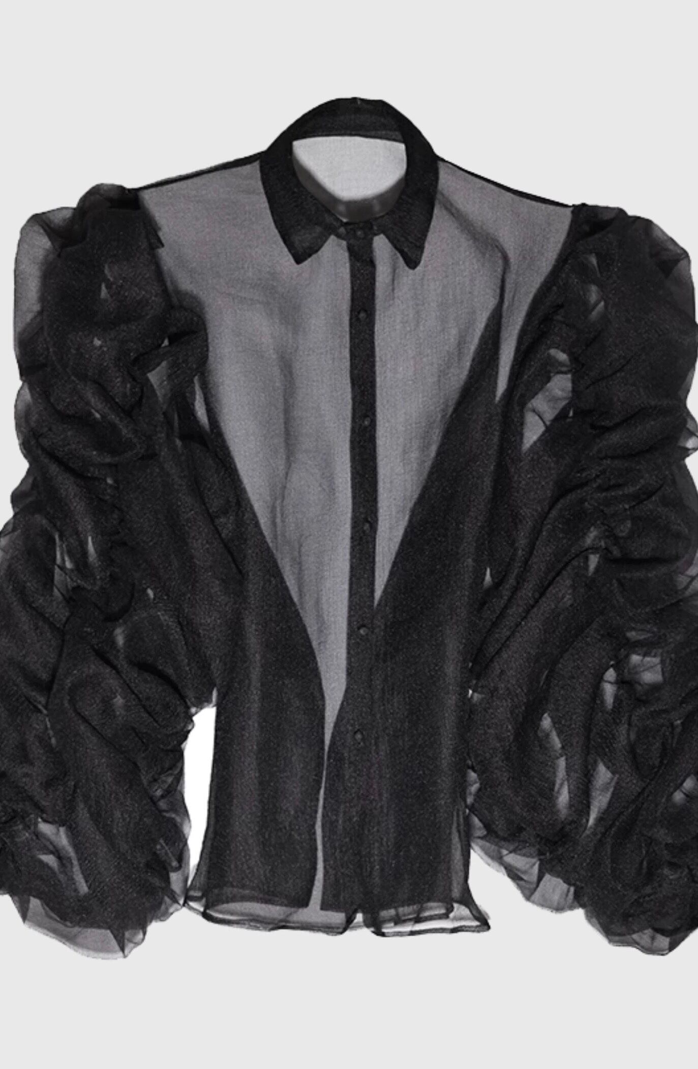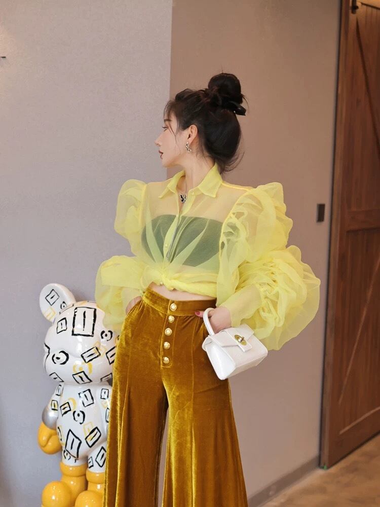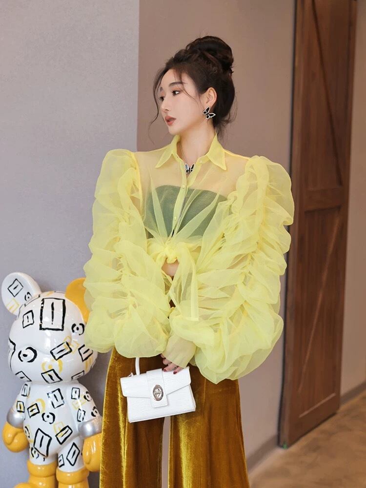 ブラウス 黄色 フリル ガーリー エレガント セクシー 黒 ブラック シースルー トップス