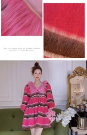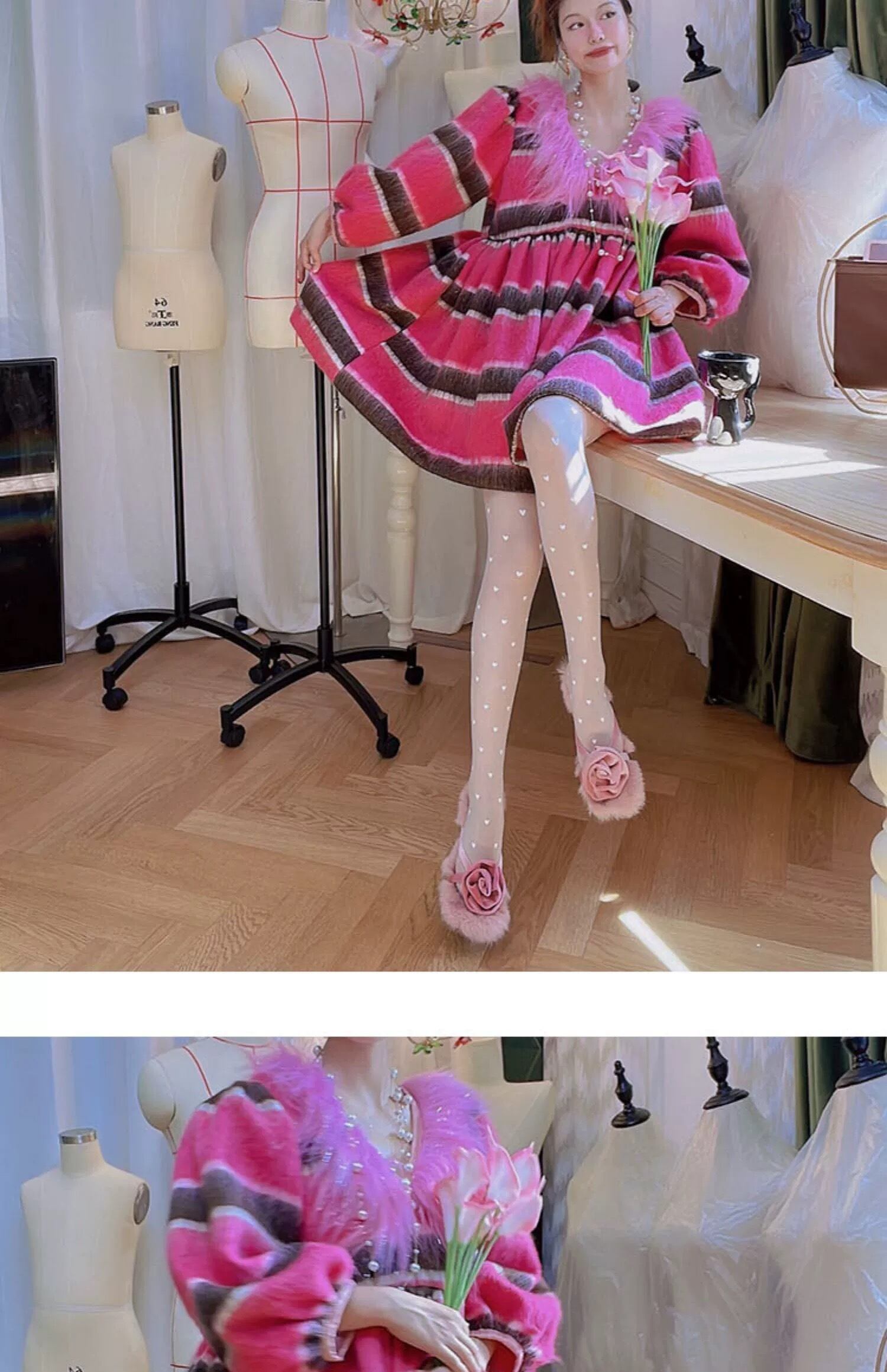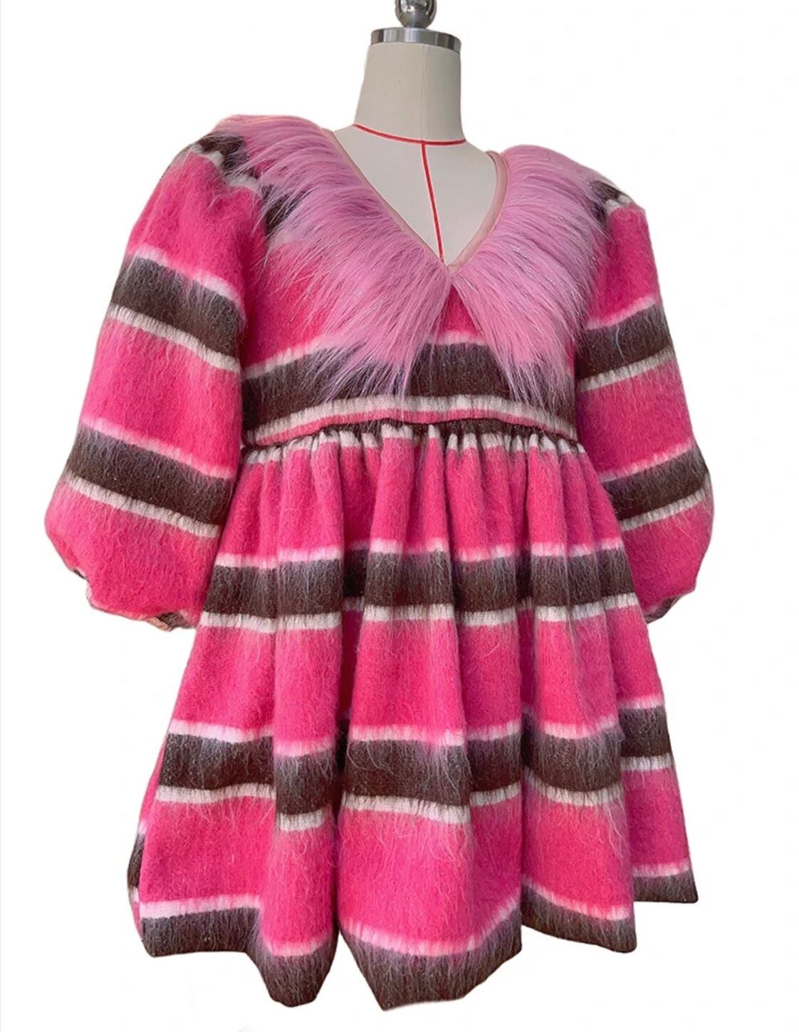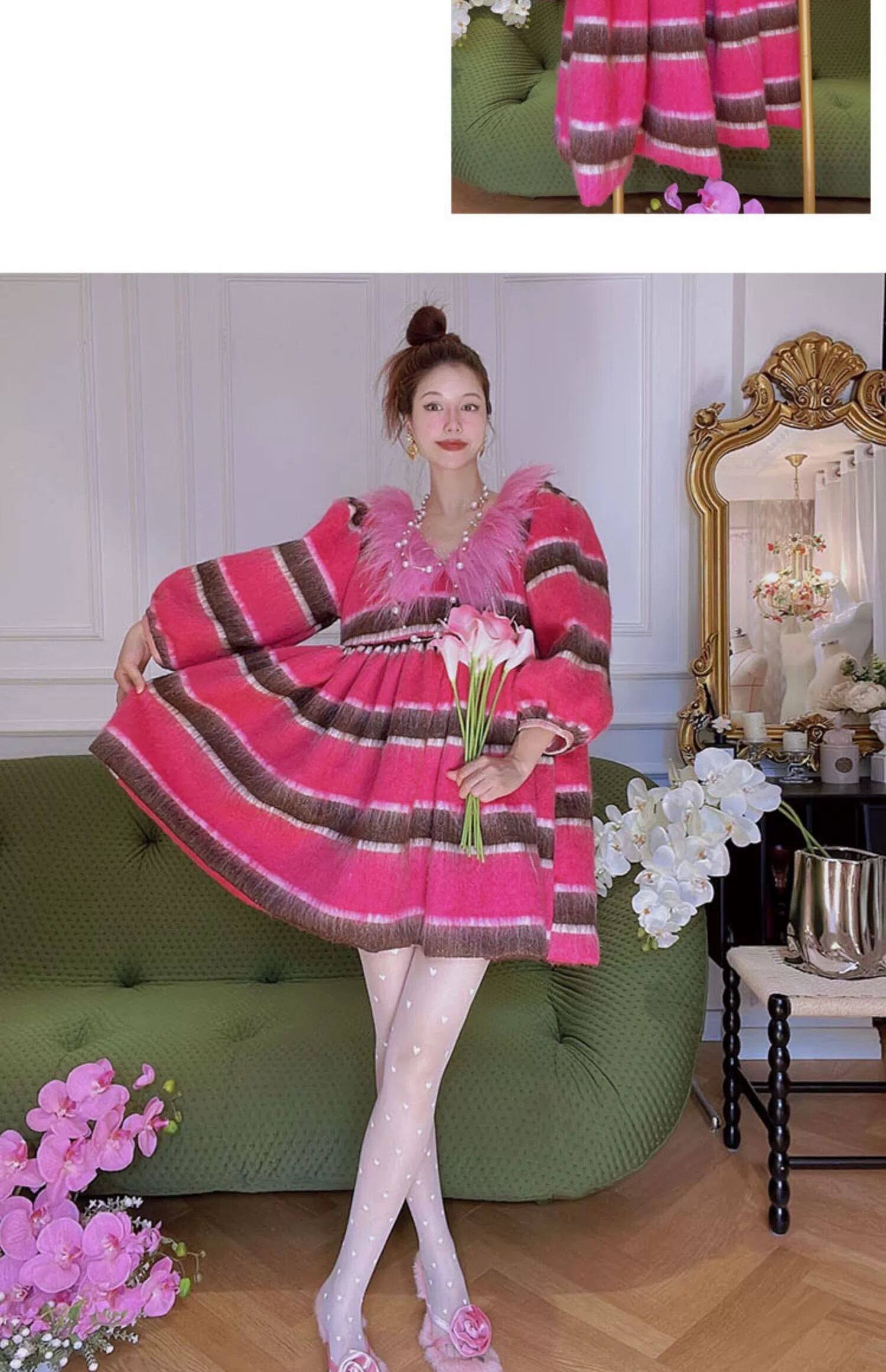 ワンピース ピンク ガーリー ゆったり ボーダー リボン ファー 襟 チェック XL ブラウス チュニック