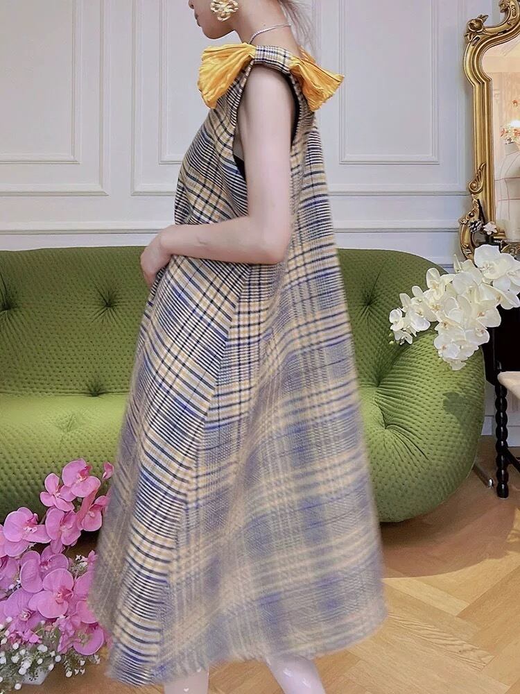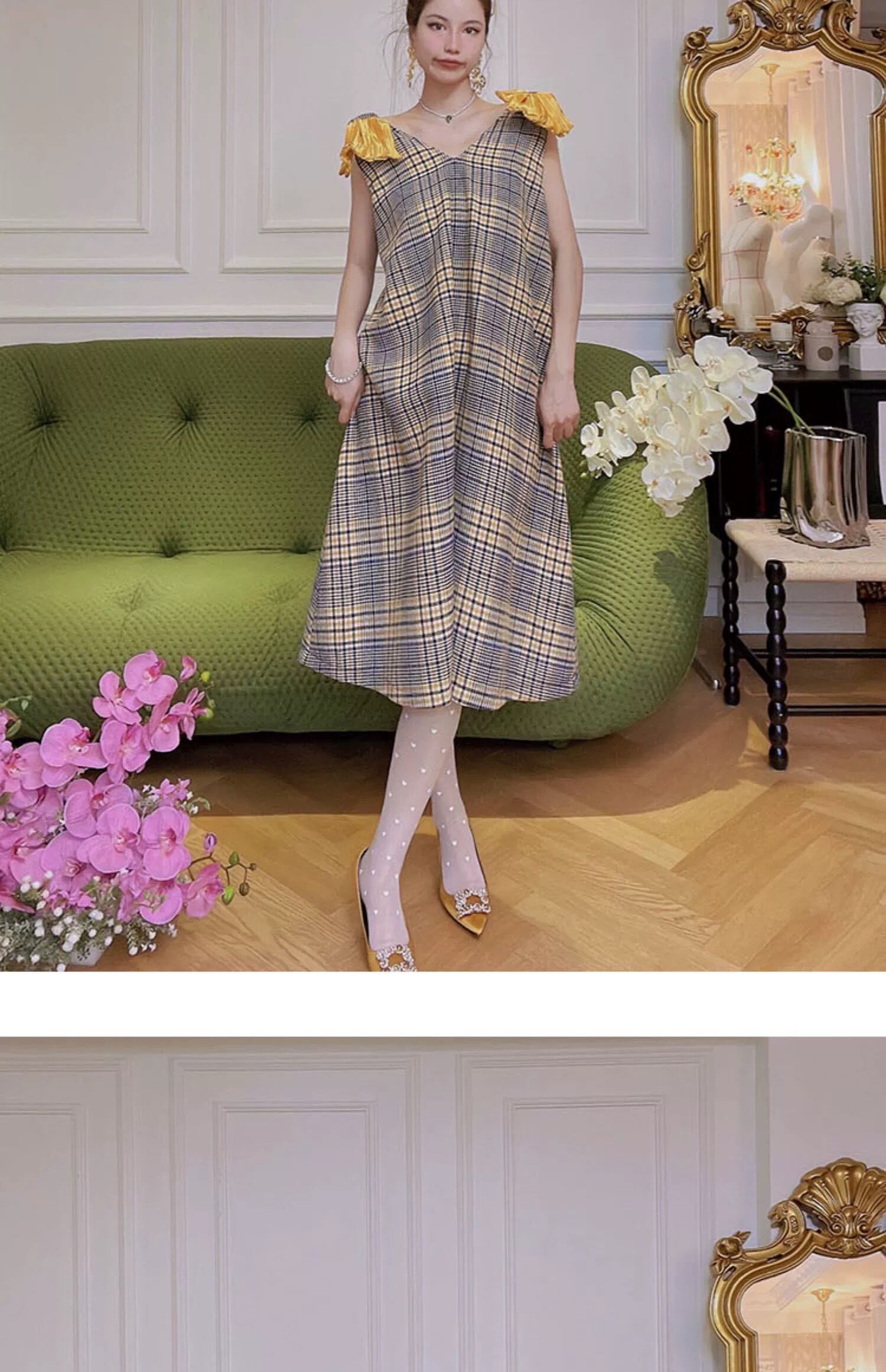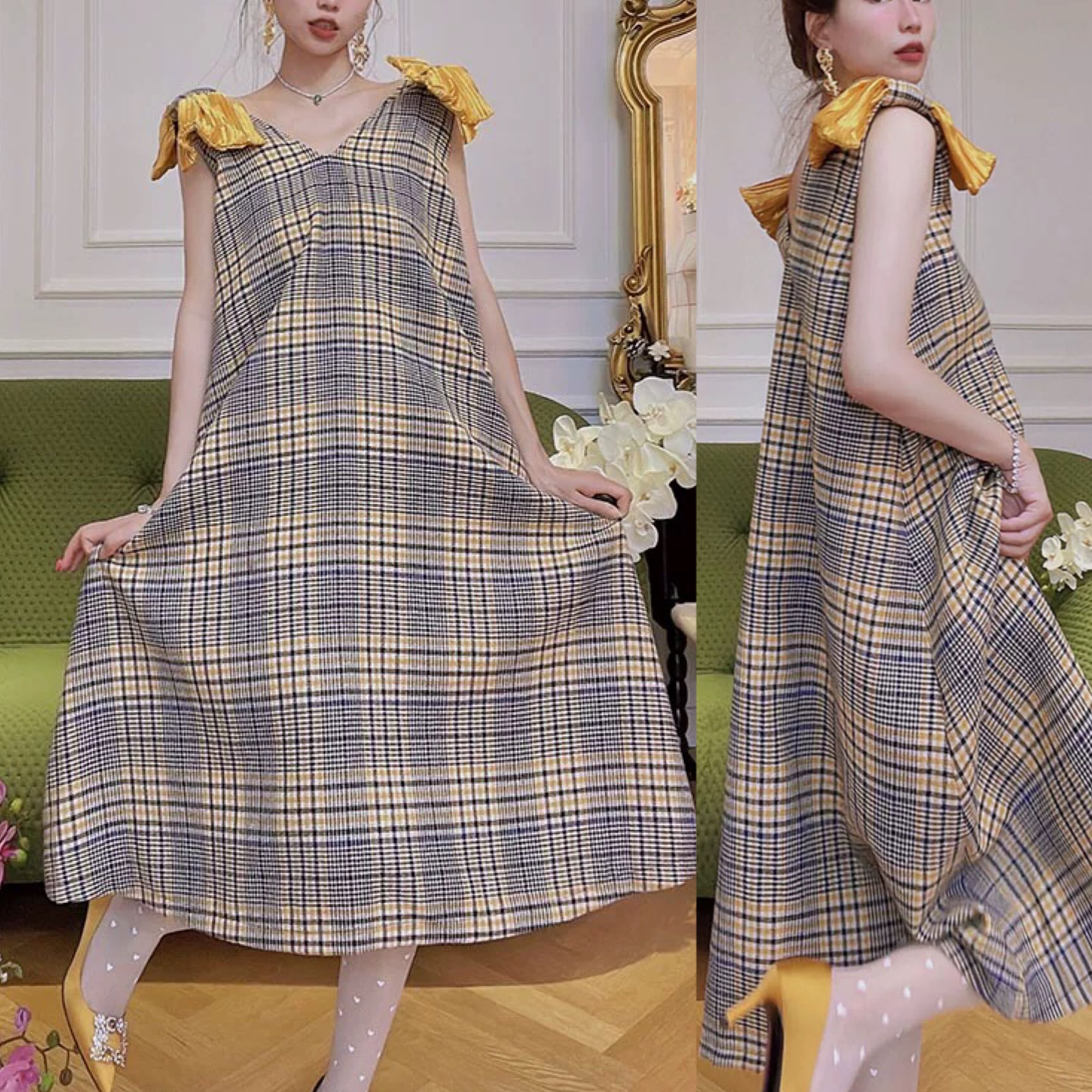 黄色 リボン チェック ガーリー ワンピース スカート ブラウス リボン XL