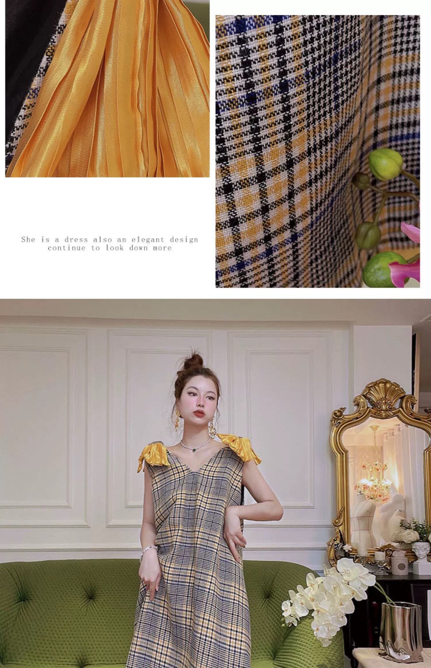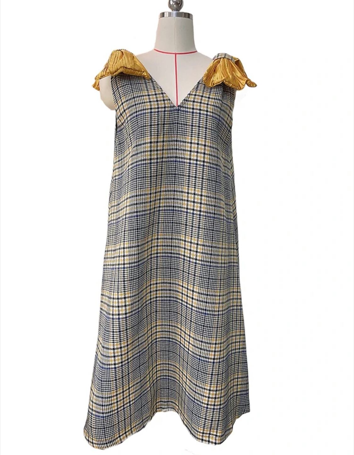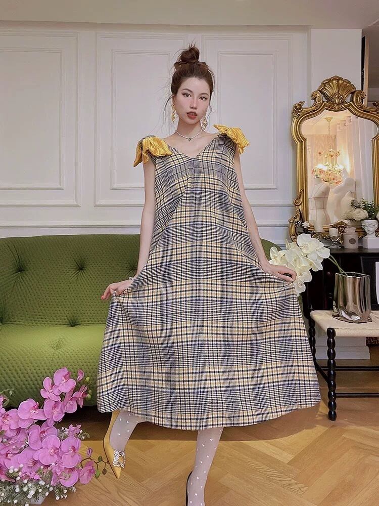 黄色 リボン チェック ガーリー ワンピース スカート ブラウス リボン XL