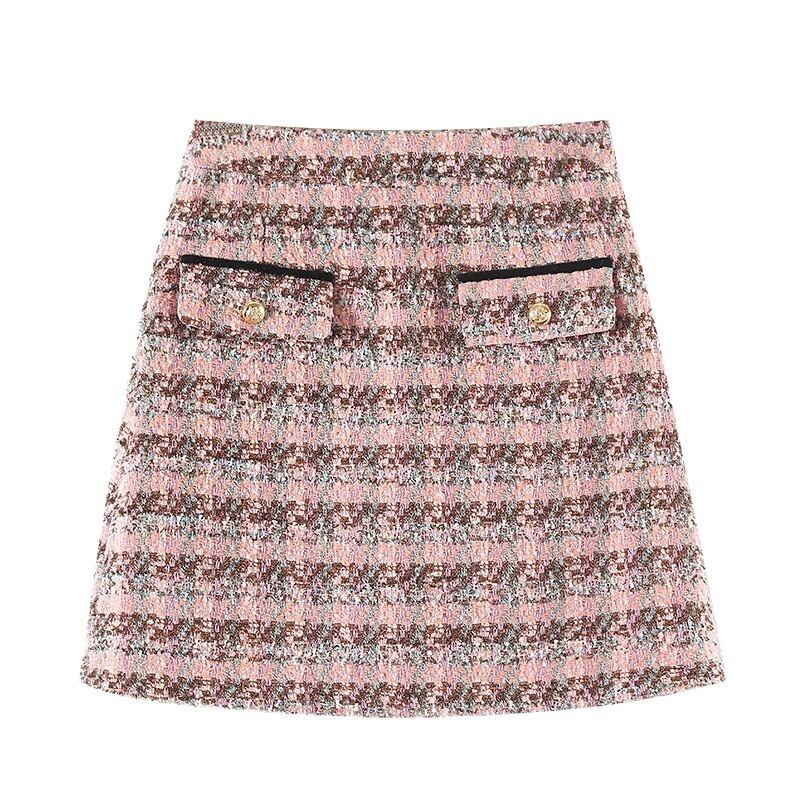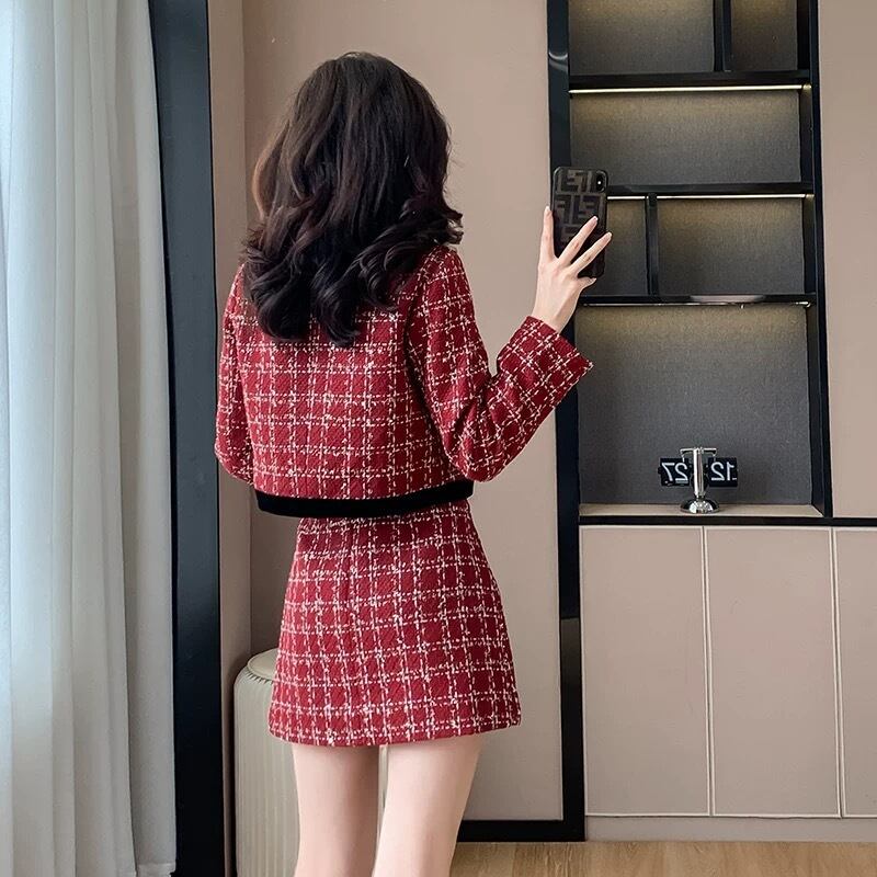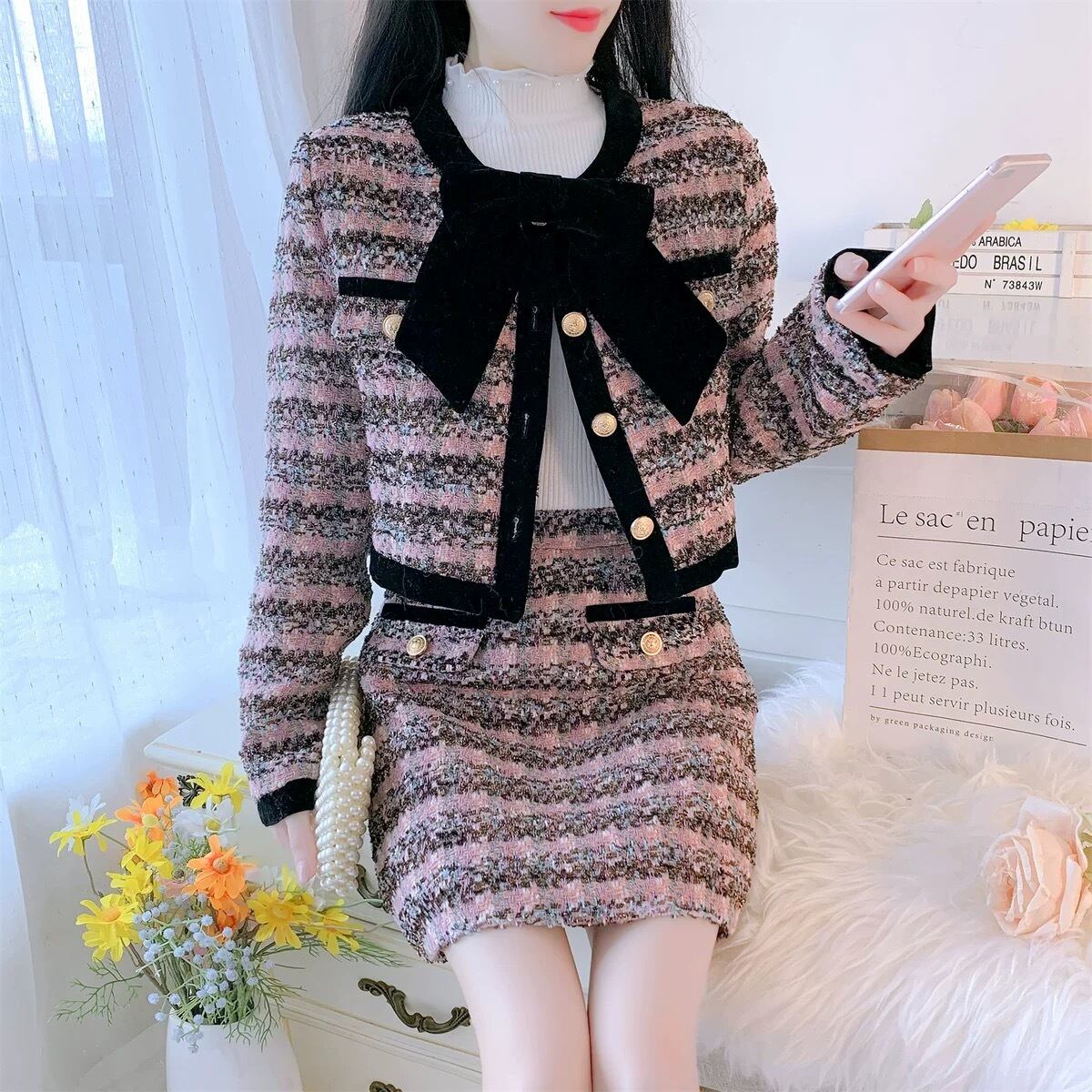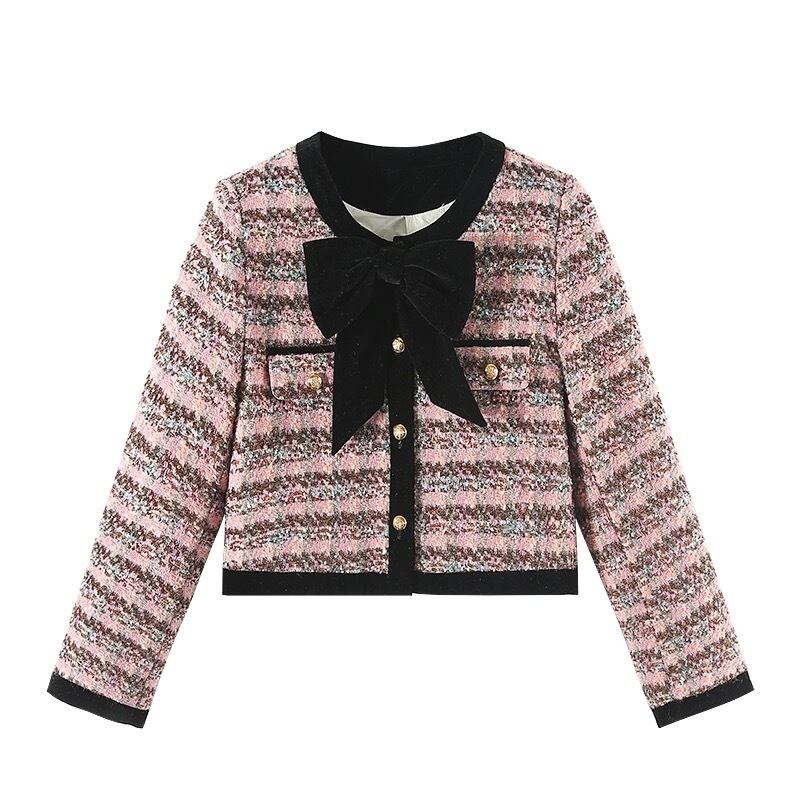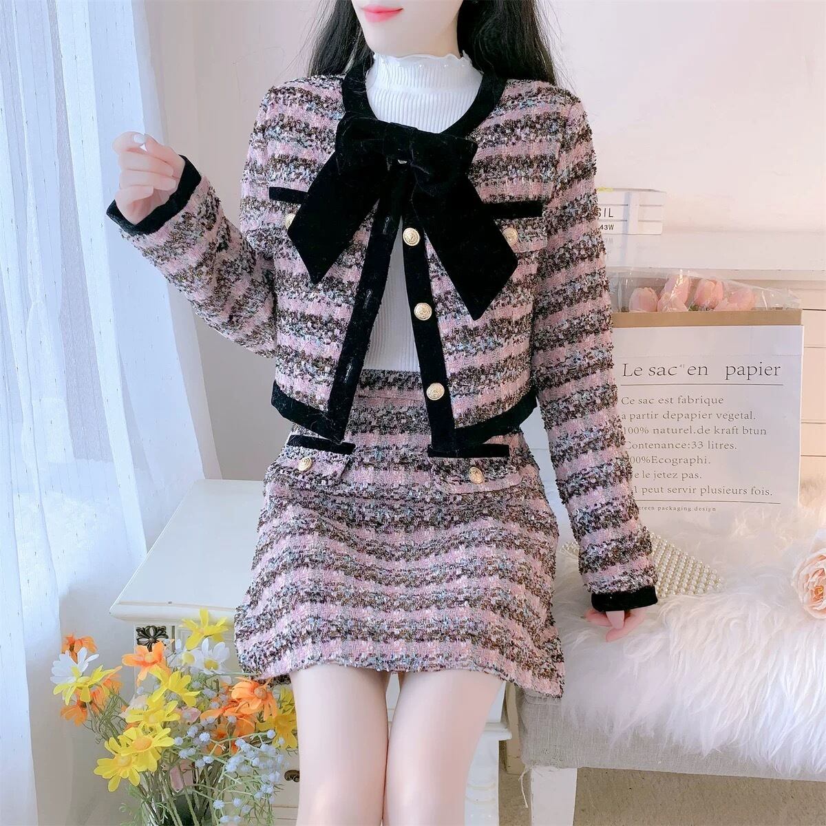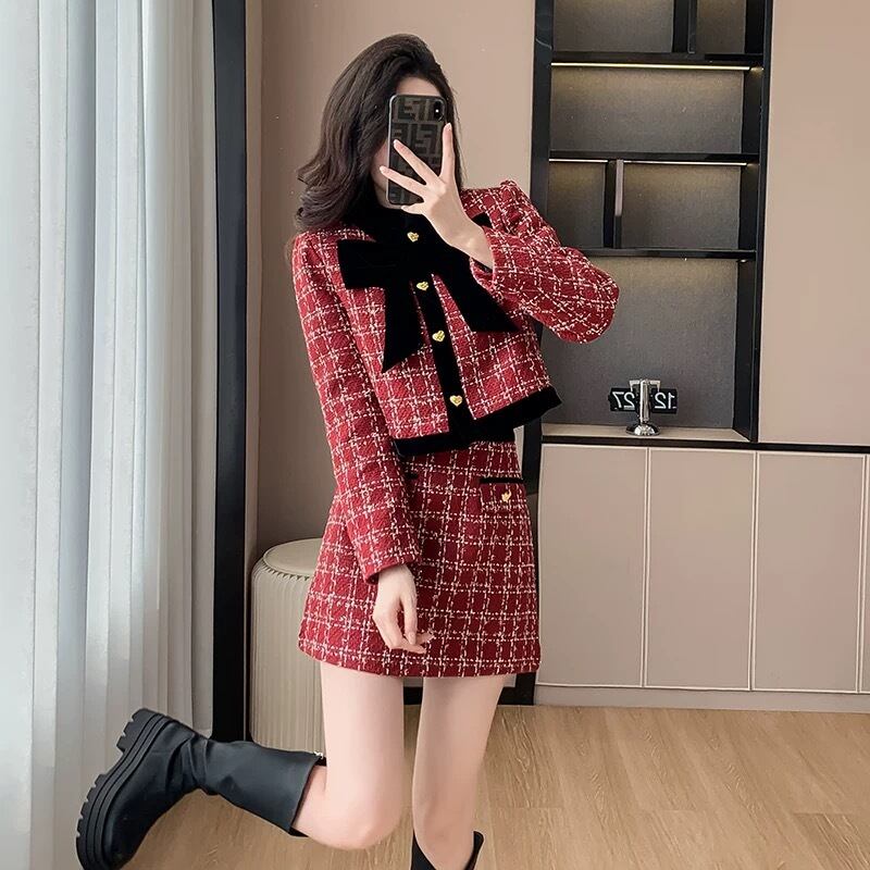 【セットアップ】ツーピース ジャケット スカート チェック ピンク 赤 リボン スーツ エレガント ツイード ミニスカート ガーリー 可愛い