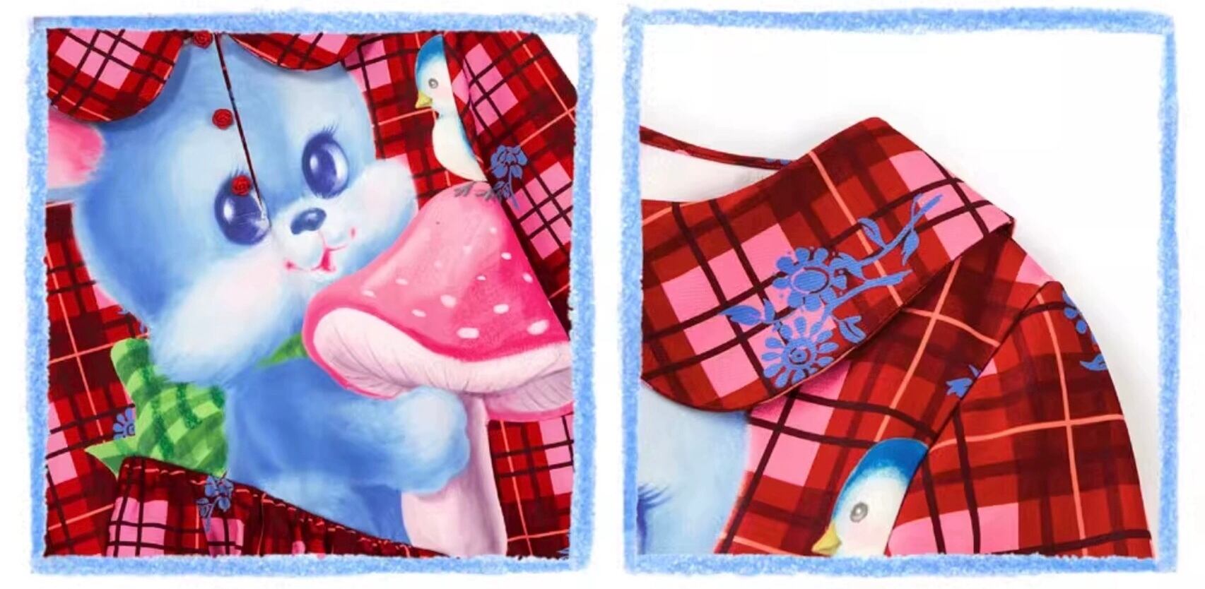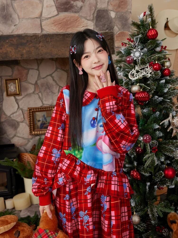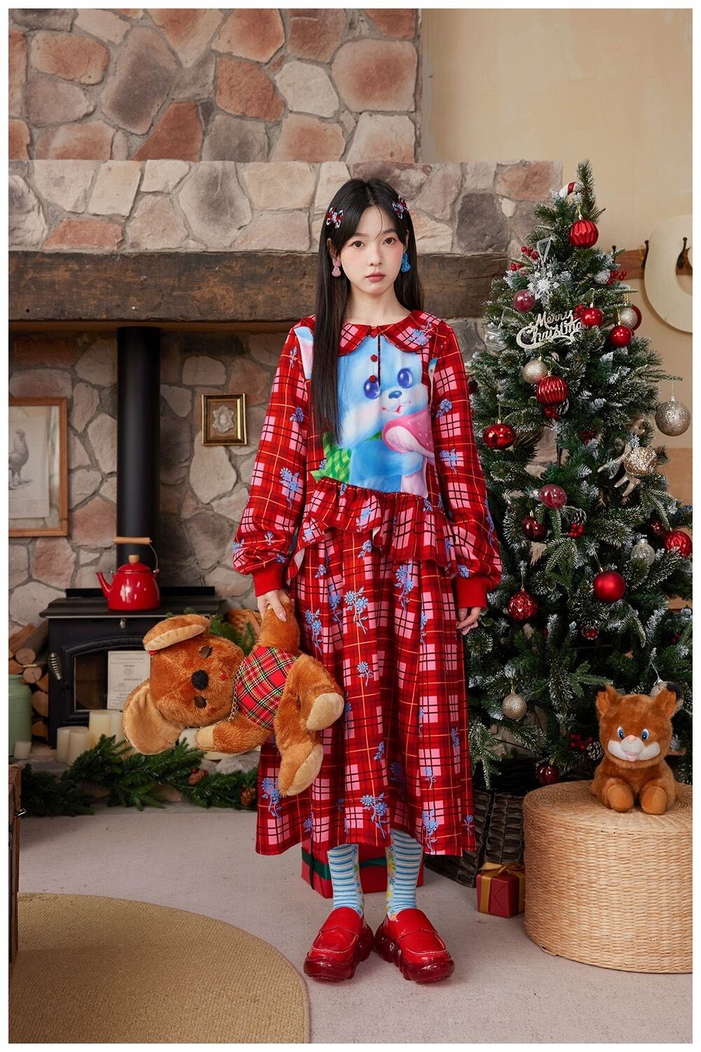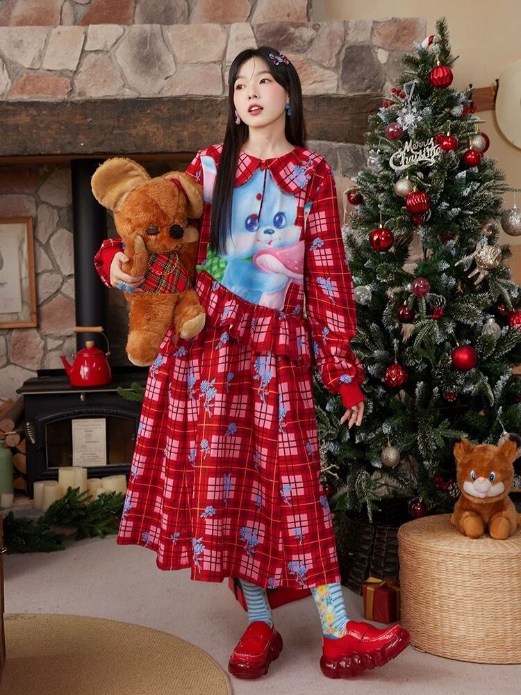 ワンピース 赤 チェック ガーリー ゆったり マキシ ロング うさぎ 水色 原宿