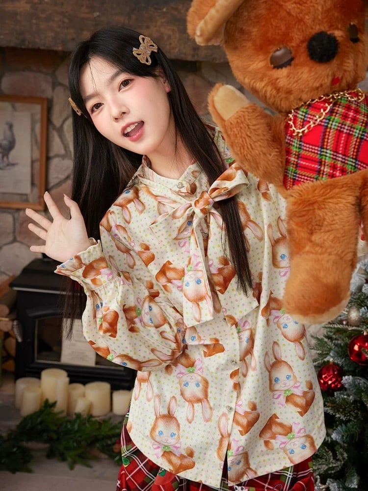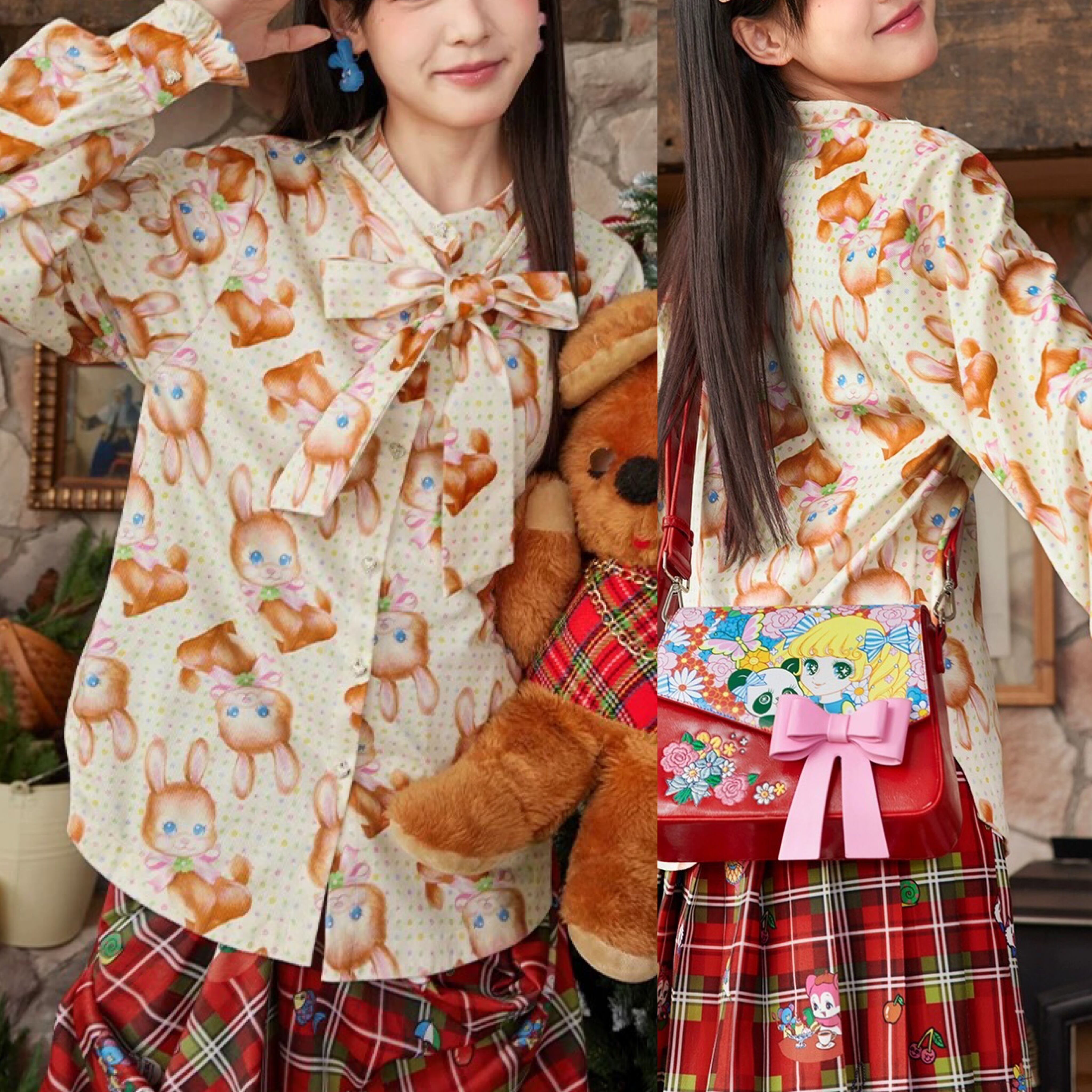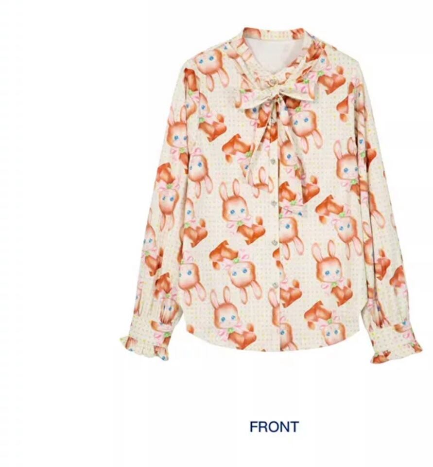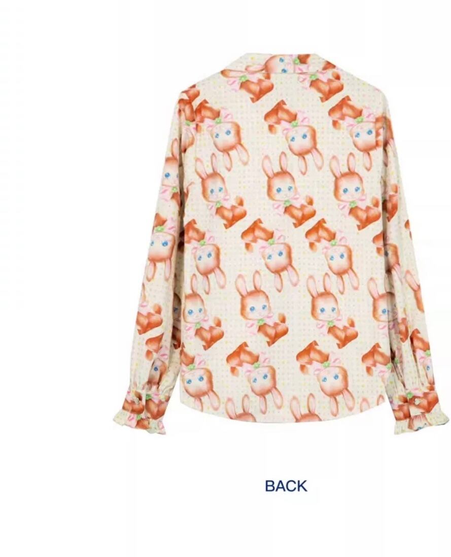 ブラウス オレンジ 茶色 黄色 うさぎ アニマル チェック トップス シャツ ガーリー 原宿