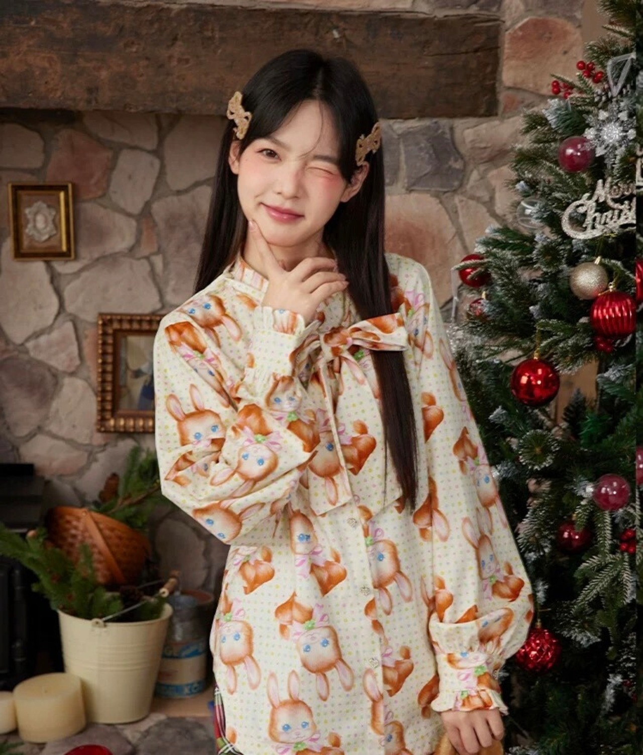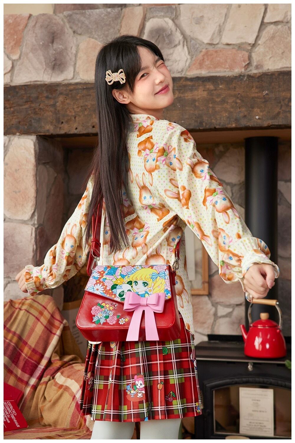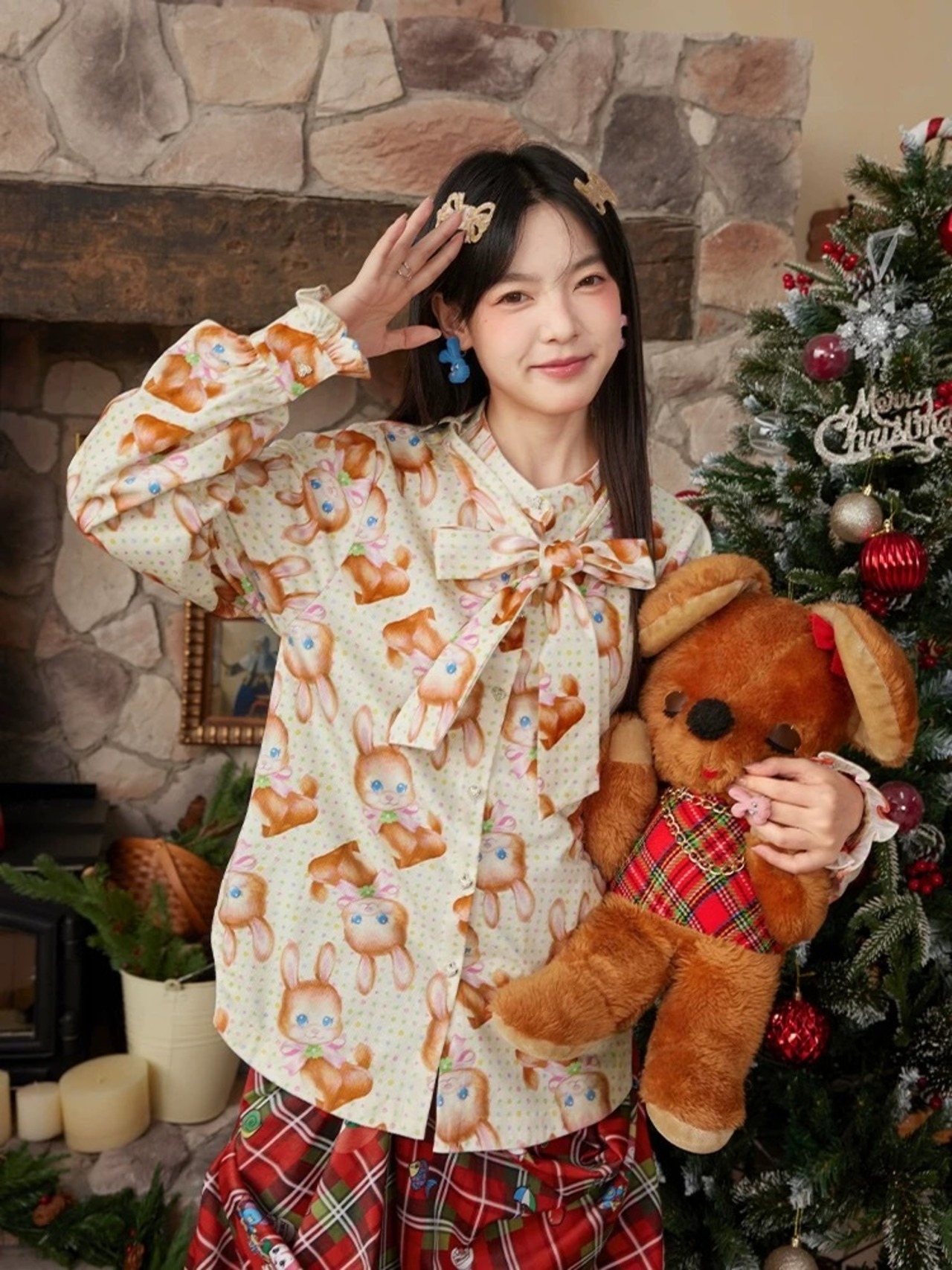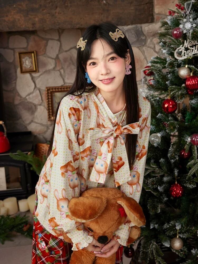ブラウス オレンジ 茶色 黄色 うさぎ アニマル チェック トップス シャツ ガーリー 原宿