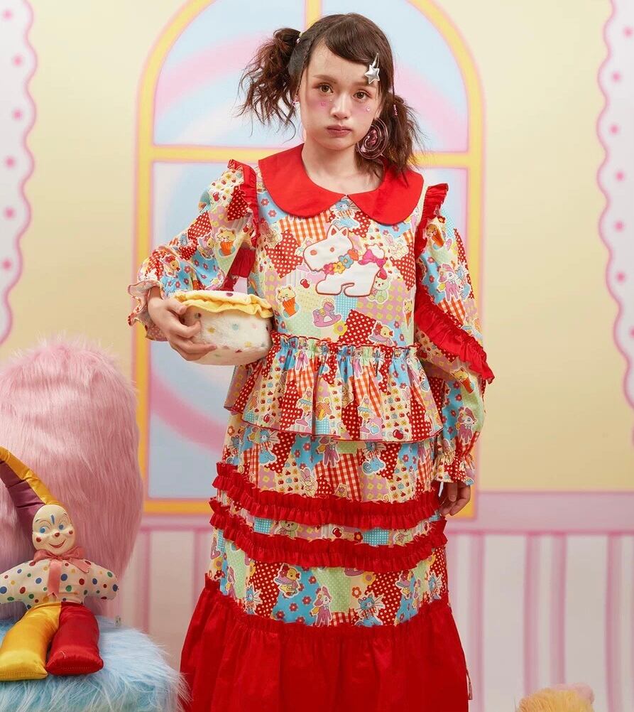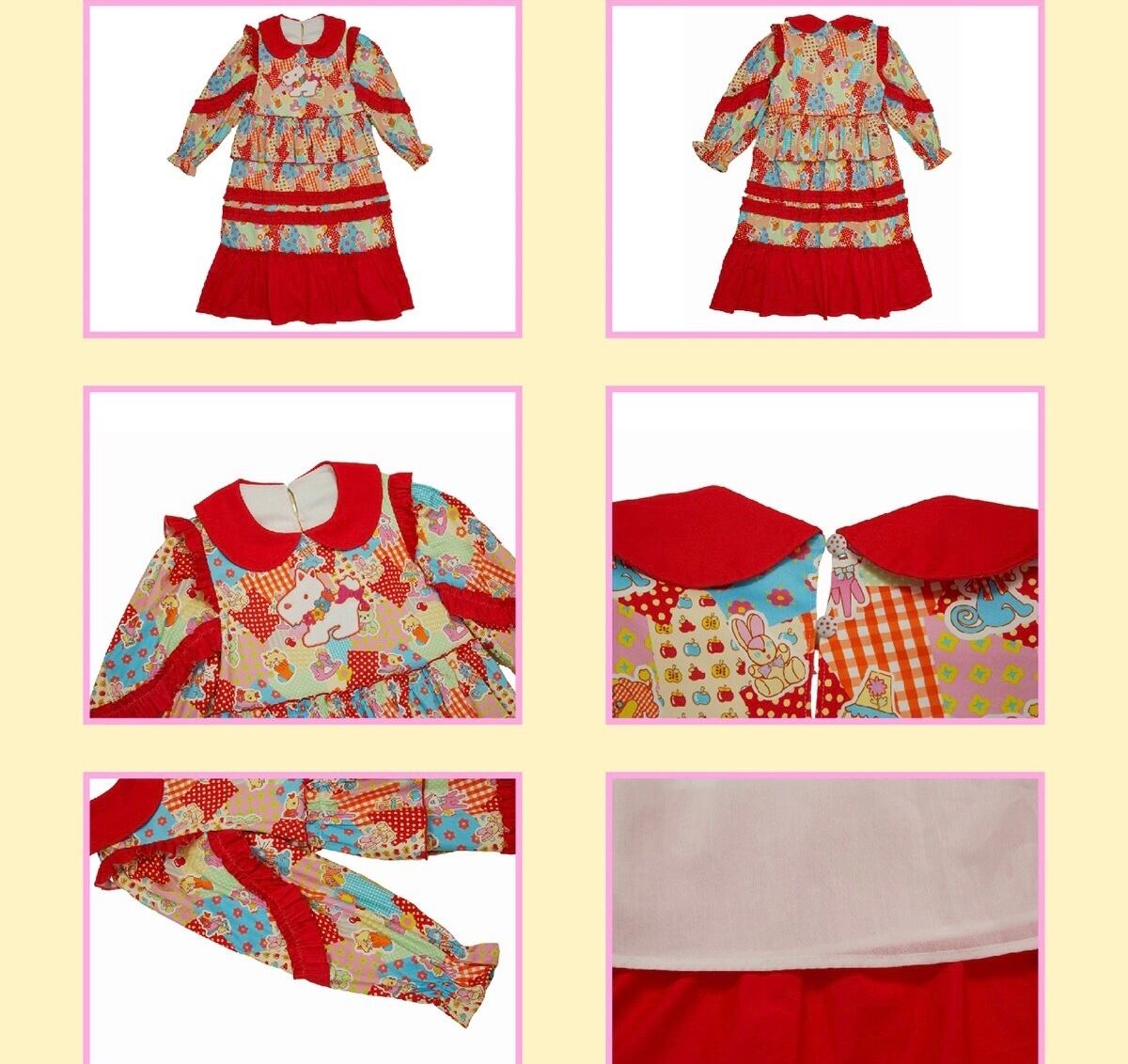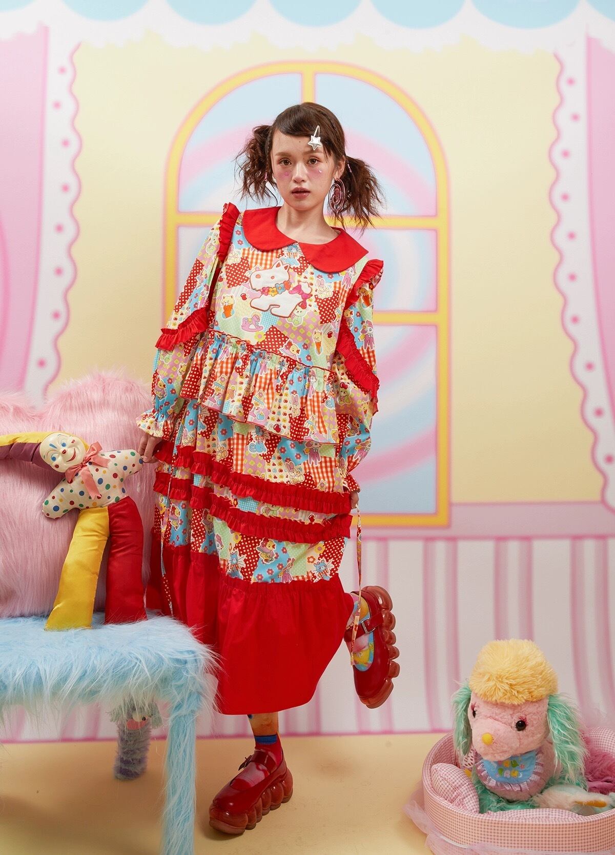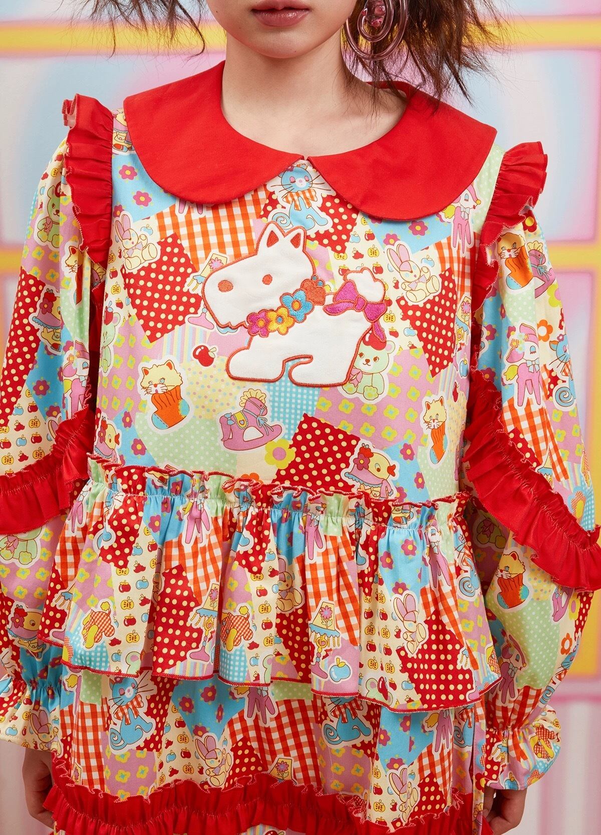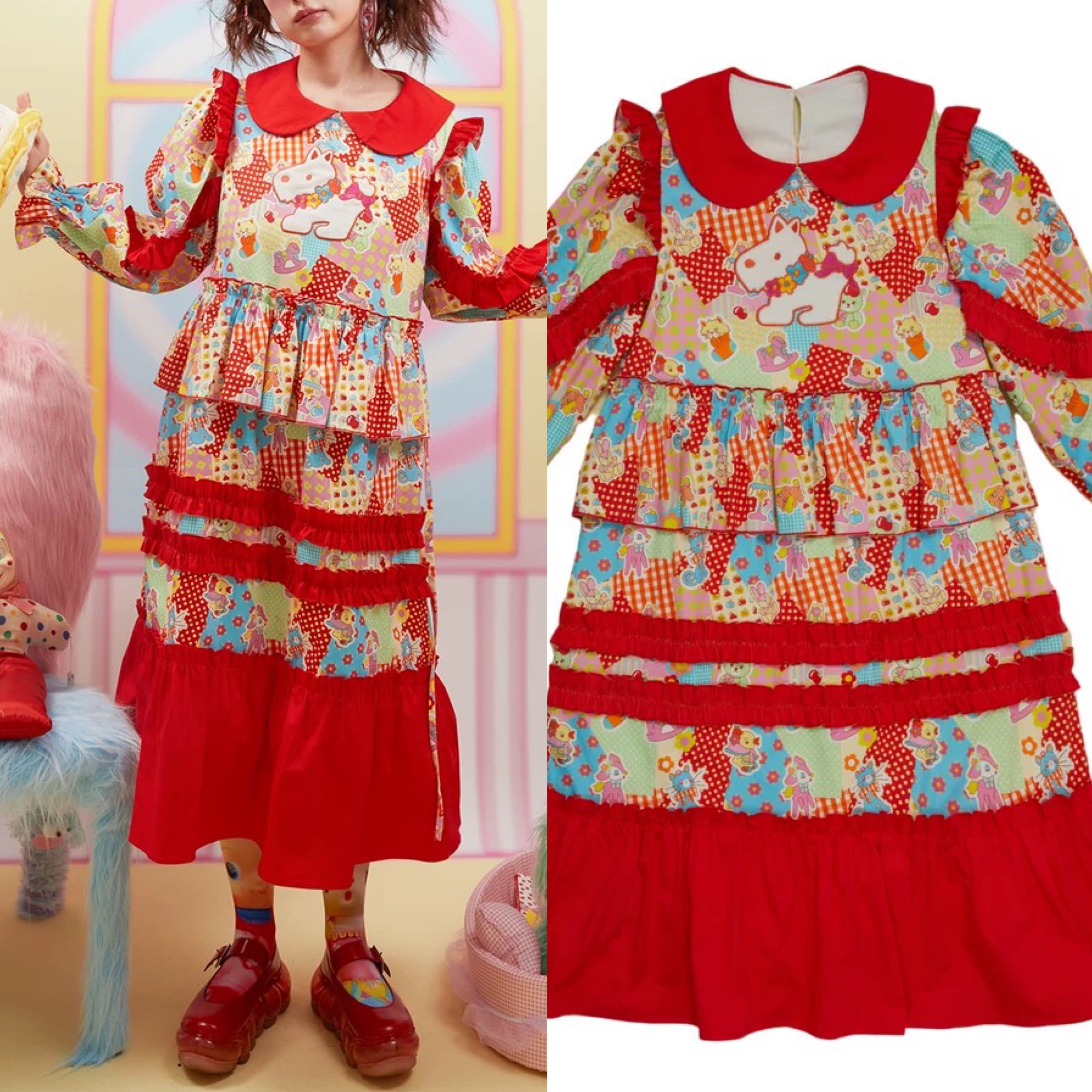 赤 ゆったり ワンピース マキシ 丸襟 ブラウス ロング 原宿 ガーリー カラフル パッチワーク 水色 犬