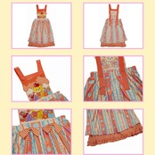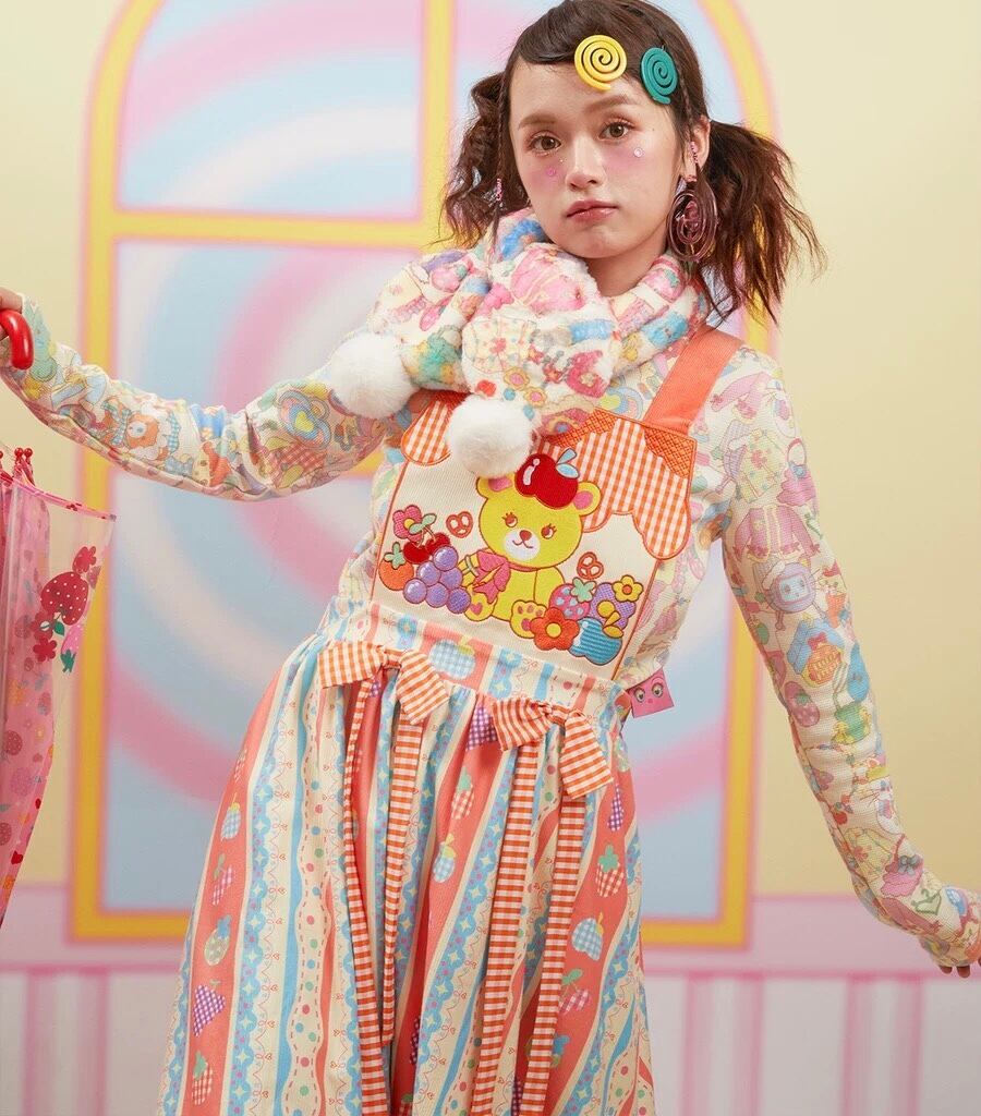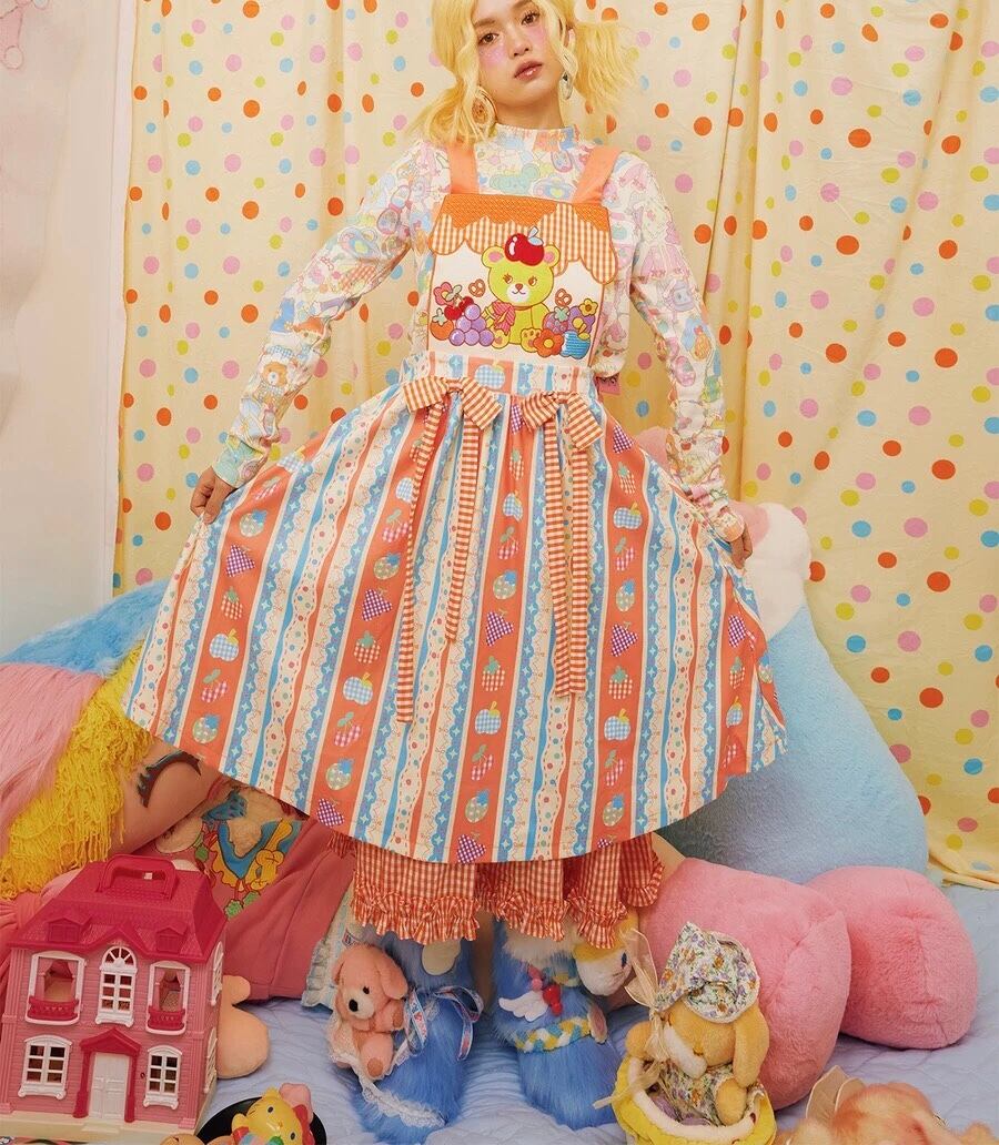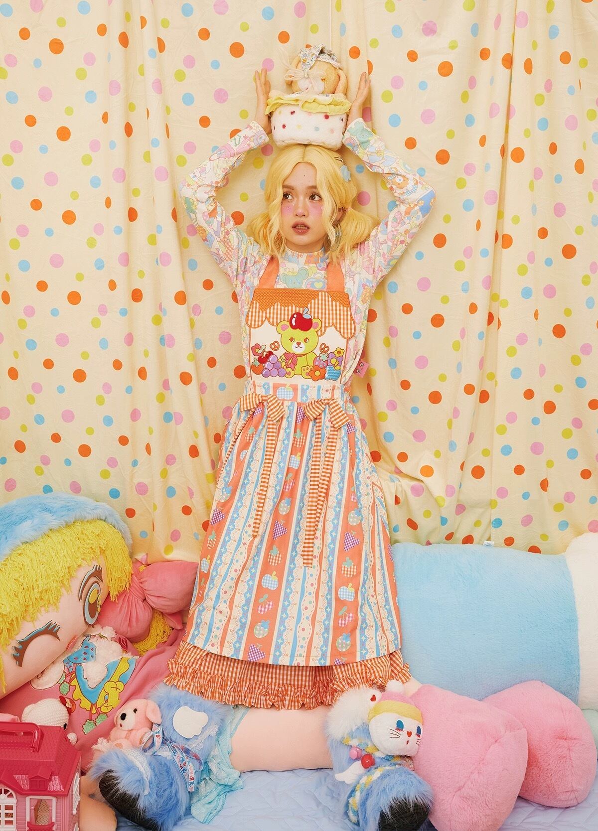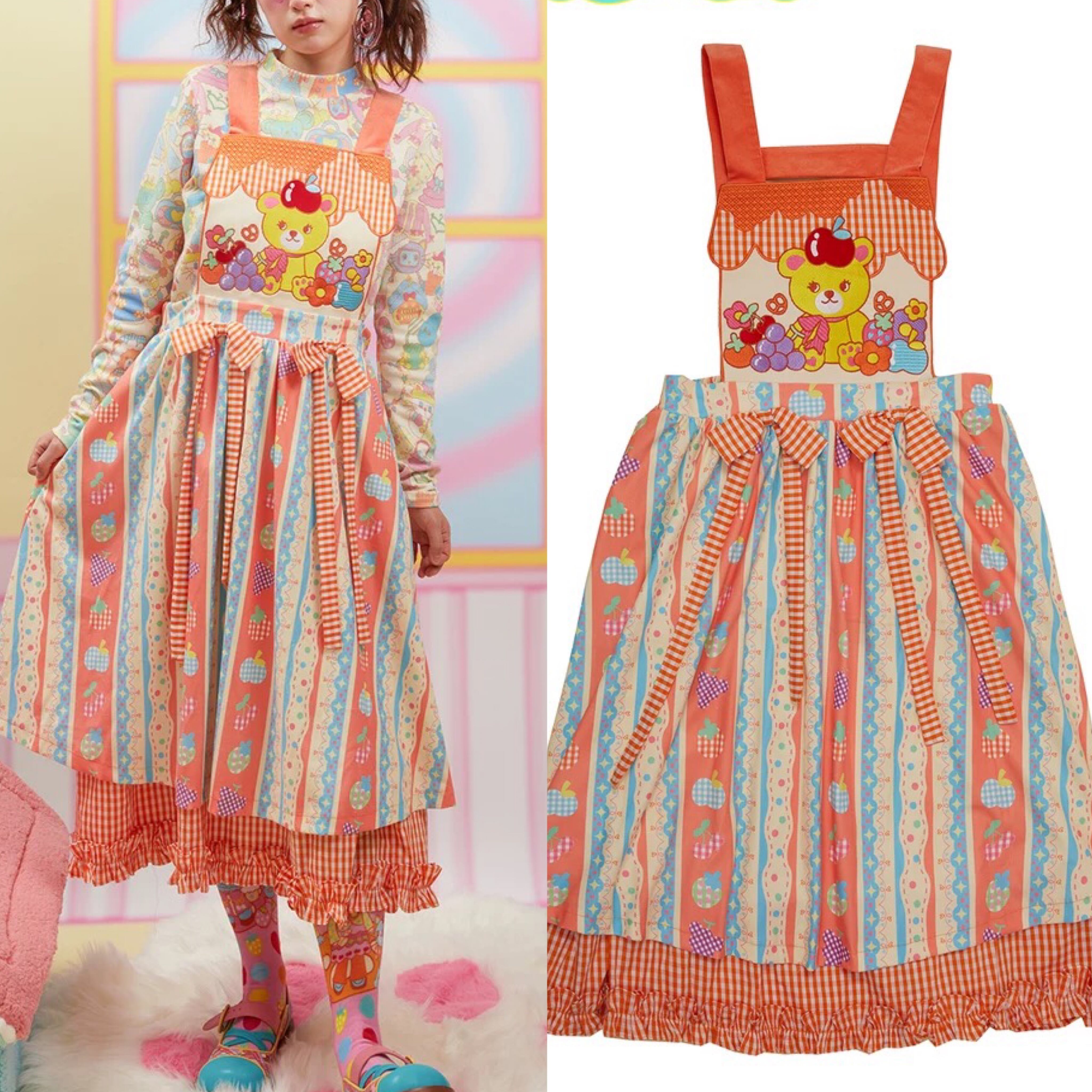 ワンピース エプロン ガーリー オレンジ チェック リボン 水色 カラフル レインボー 可愛い 原宿 マキシ ブラウス スカート パッチワーク