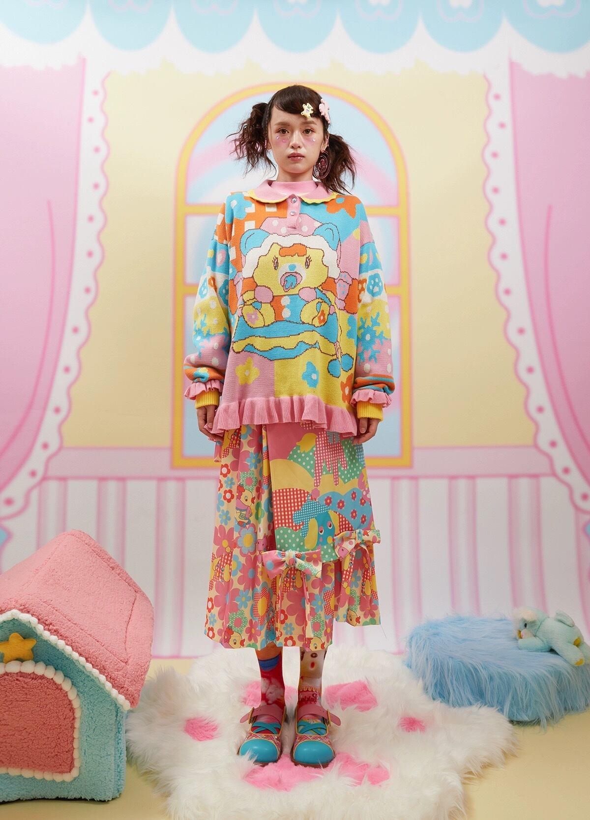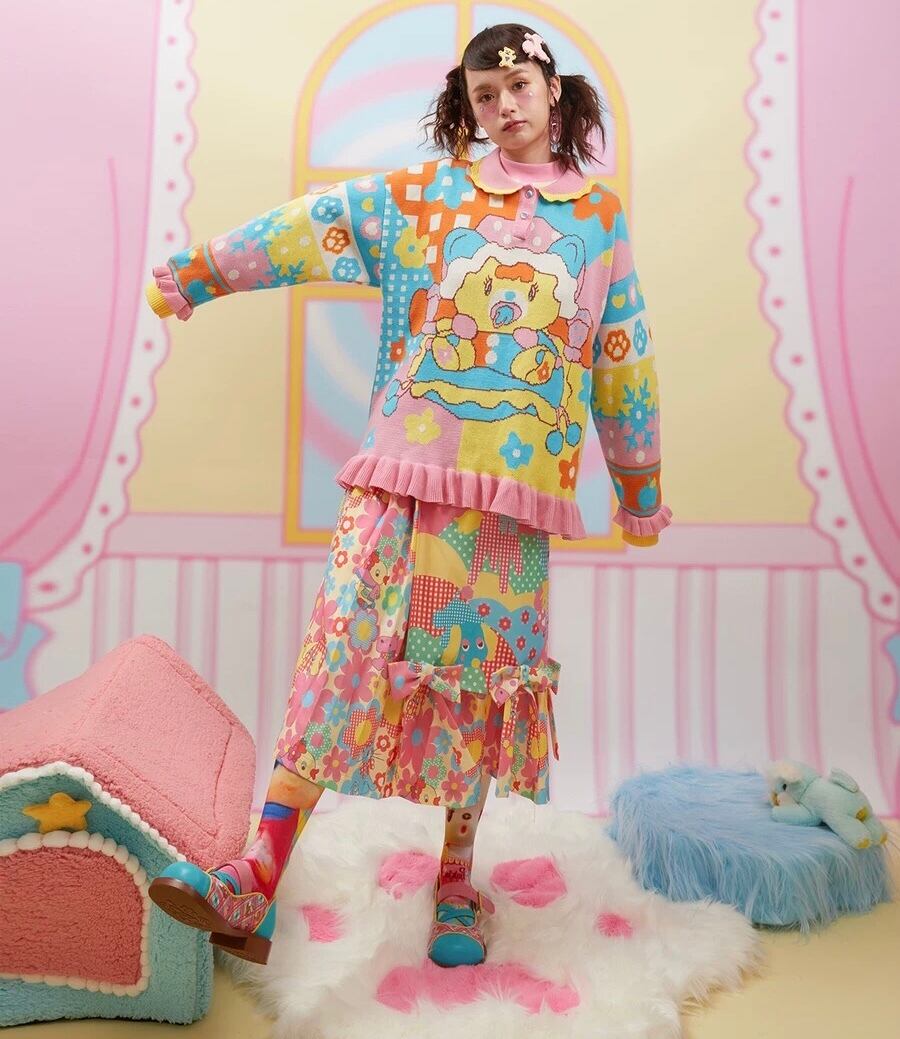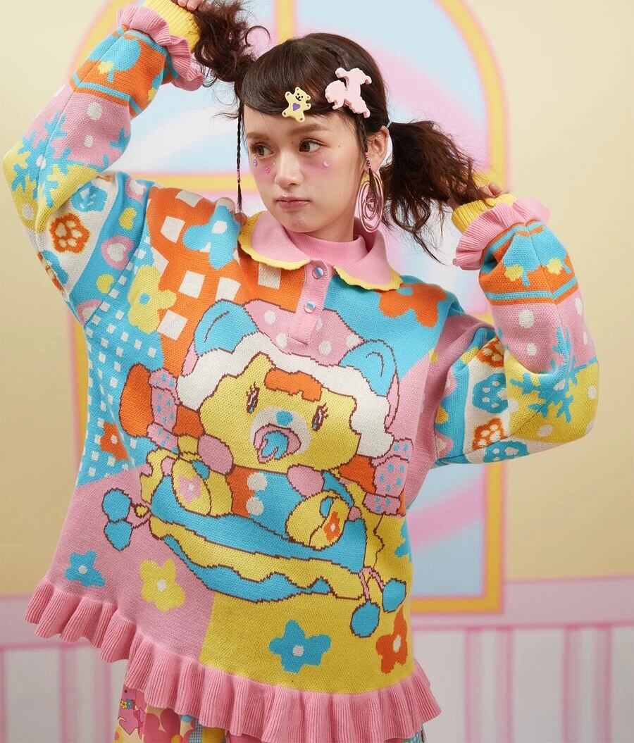 水色 セーター ガーリー チェック 可愛い トップス ニット カーディガン ブラウス ピンク くま 水色 黄色 パッチワーク 原宿 ガーリー ロリータ 緑