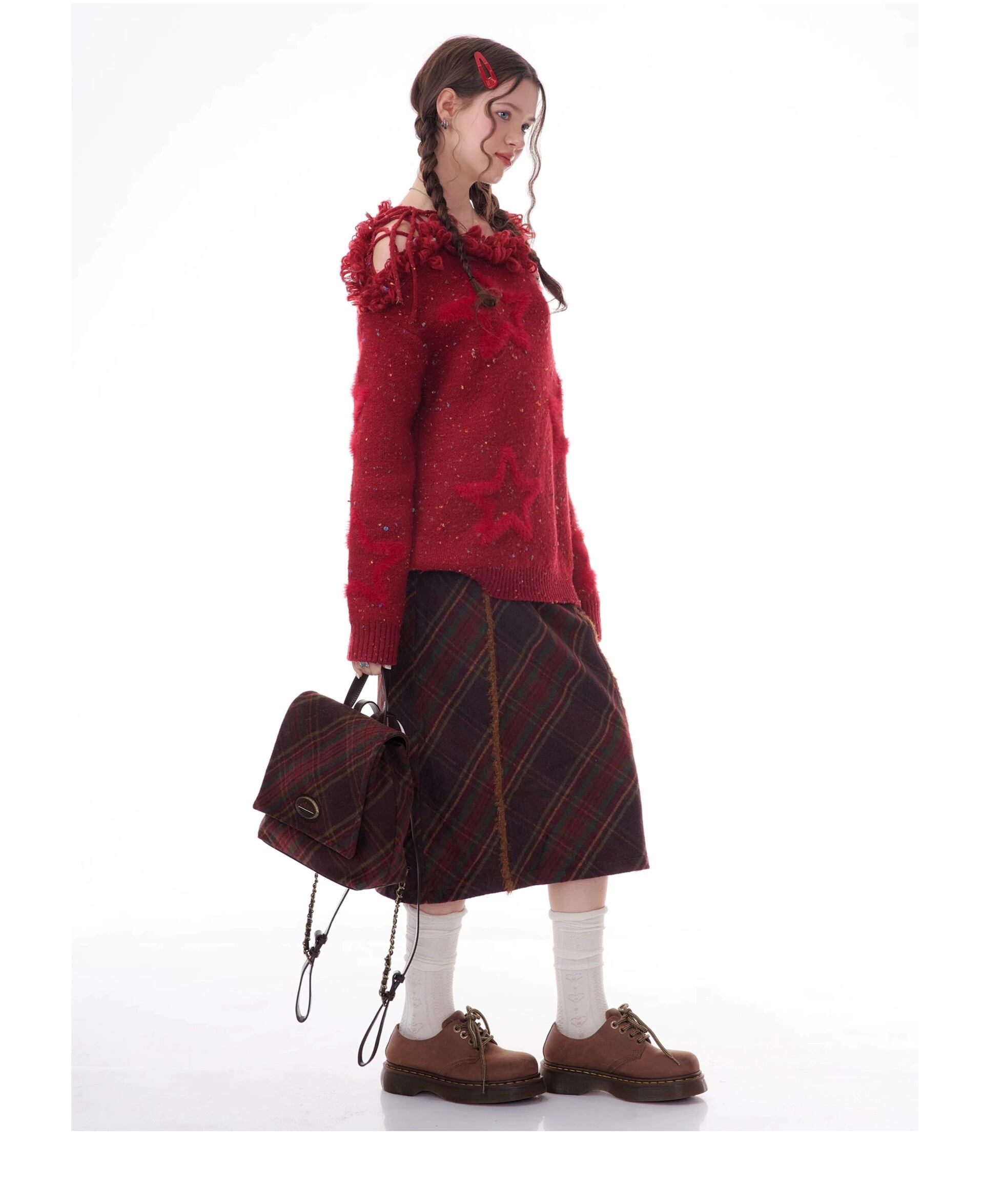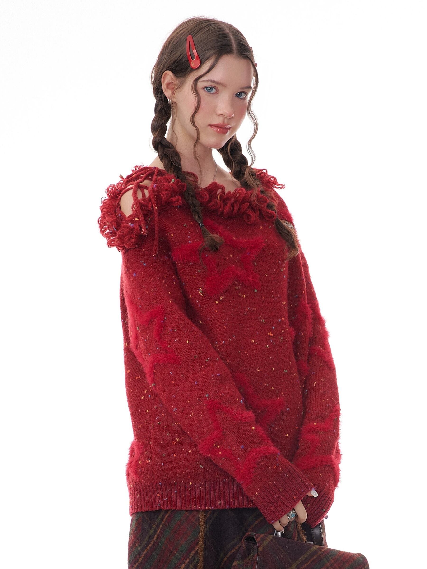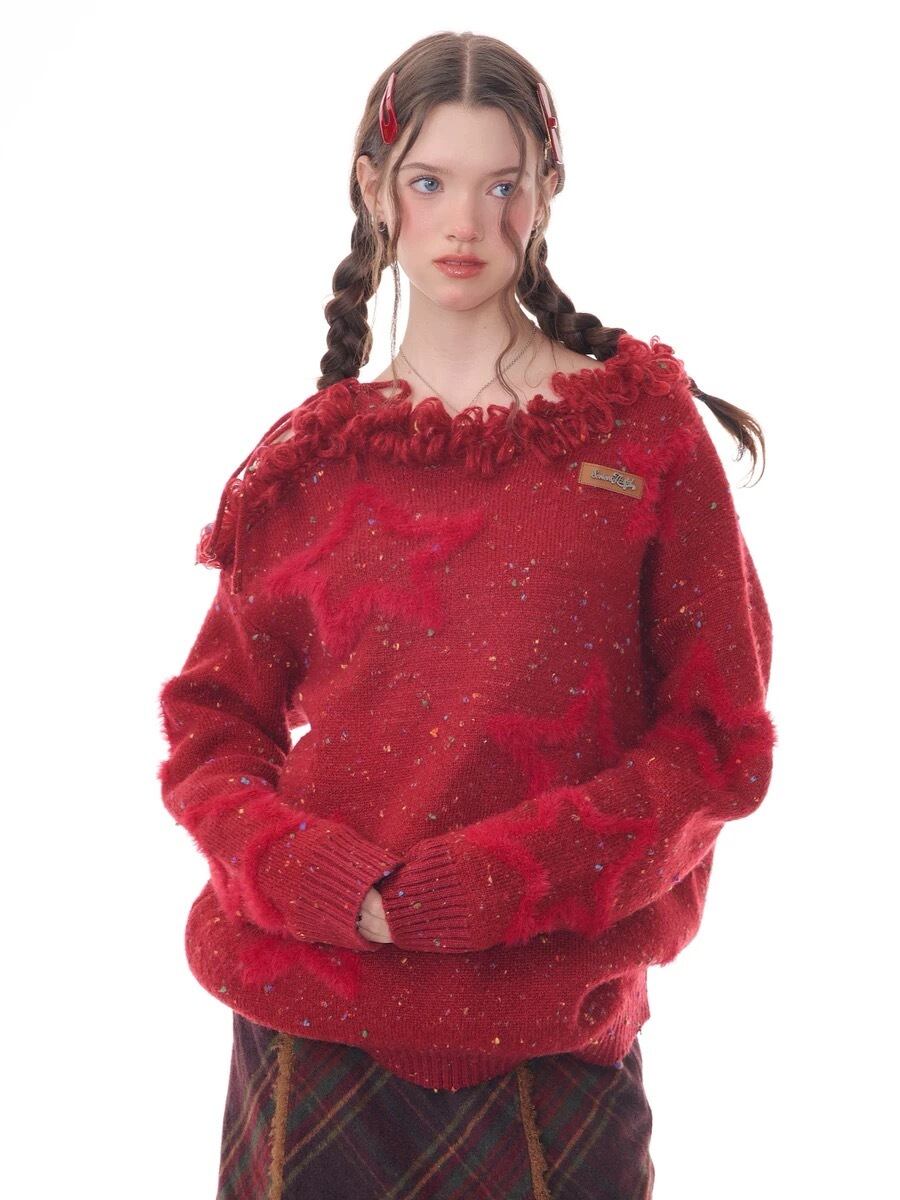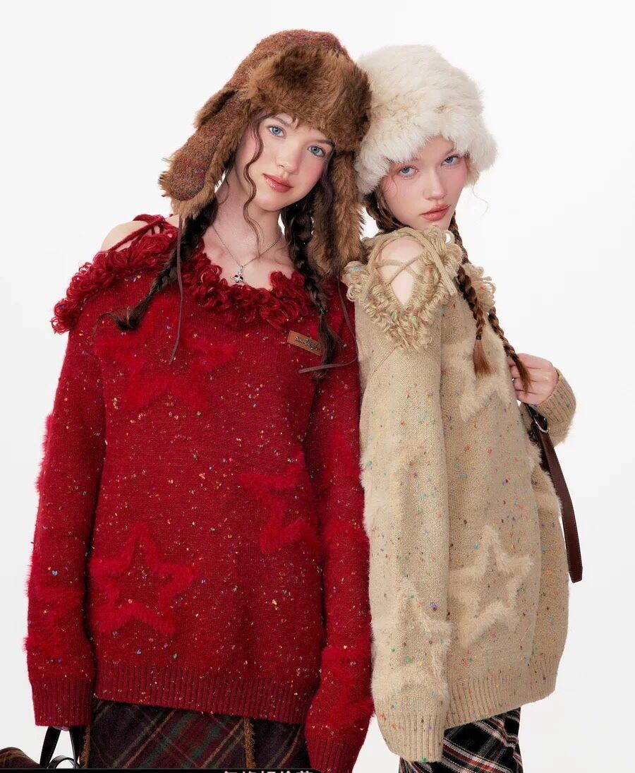 赤 ベージュ 星 ニット セーター カーディガン ゆったり オフショルダー リボン アウター トップス 水玉 原宿