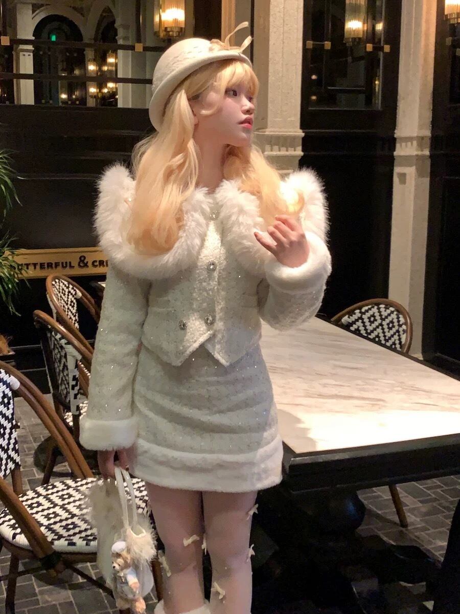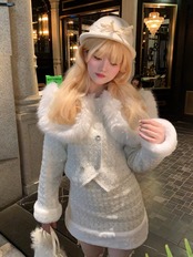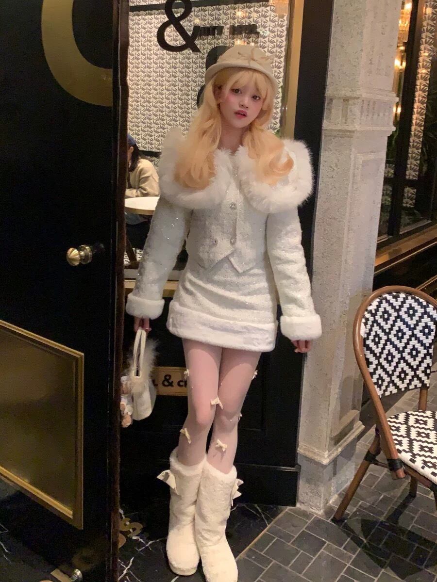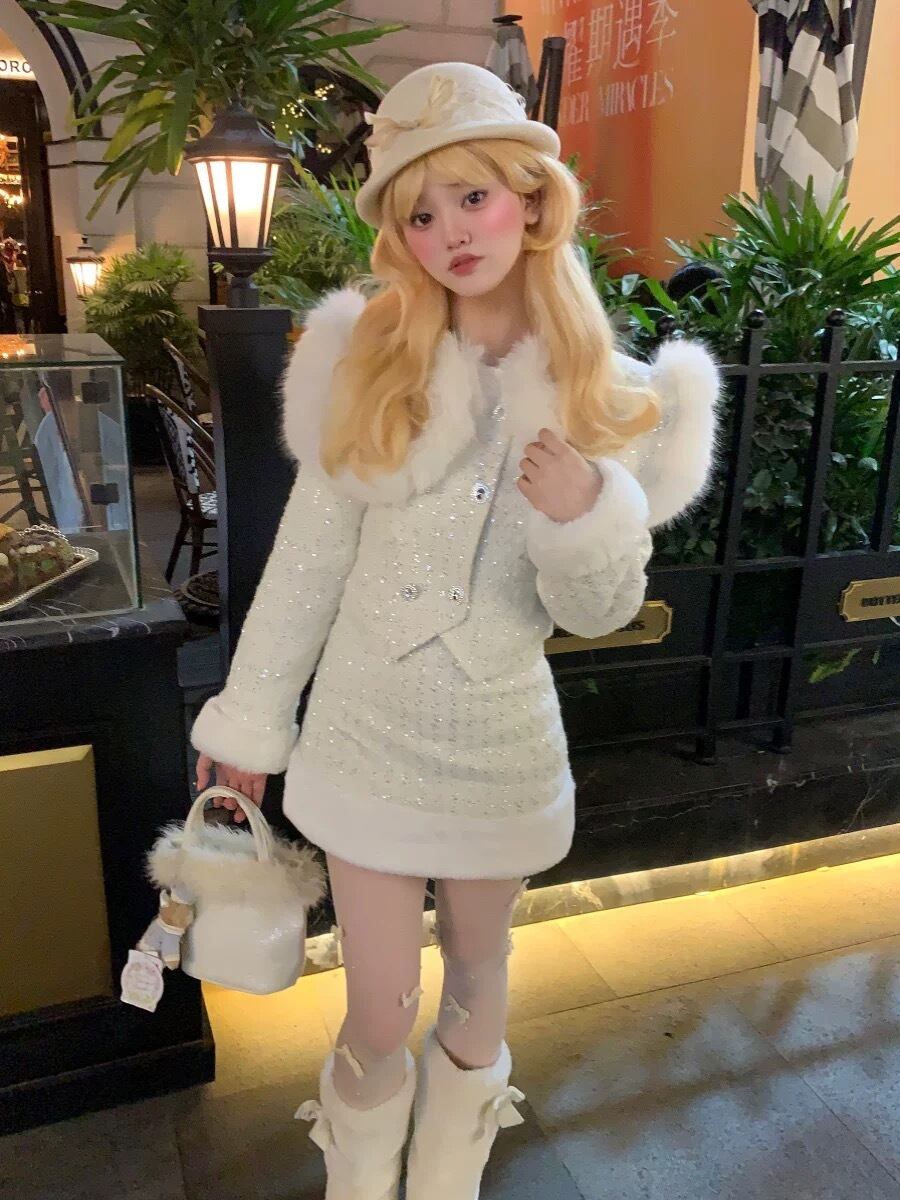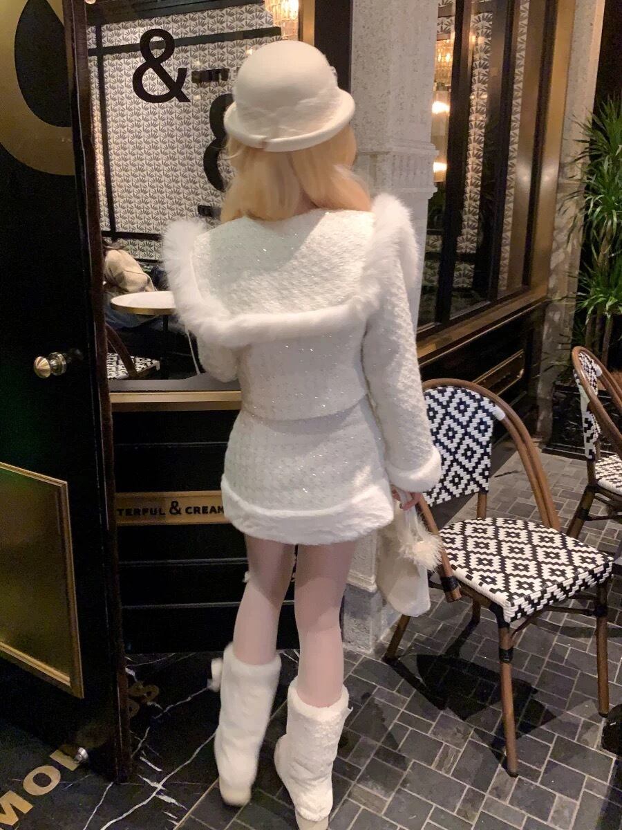 【セットアップ】スカート ジャケット アウター カーディガン ブラウス ファー 白 ホワイト ミニスカート ガーリー 原宿 衣装 スーツ 丸襟 お嬢様
