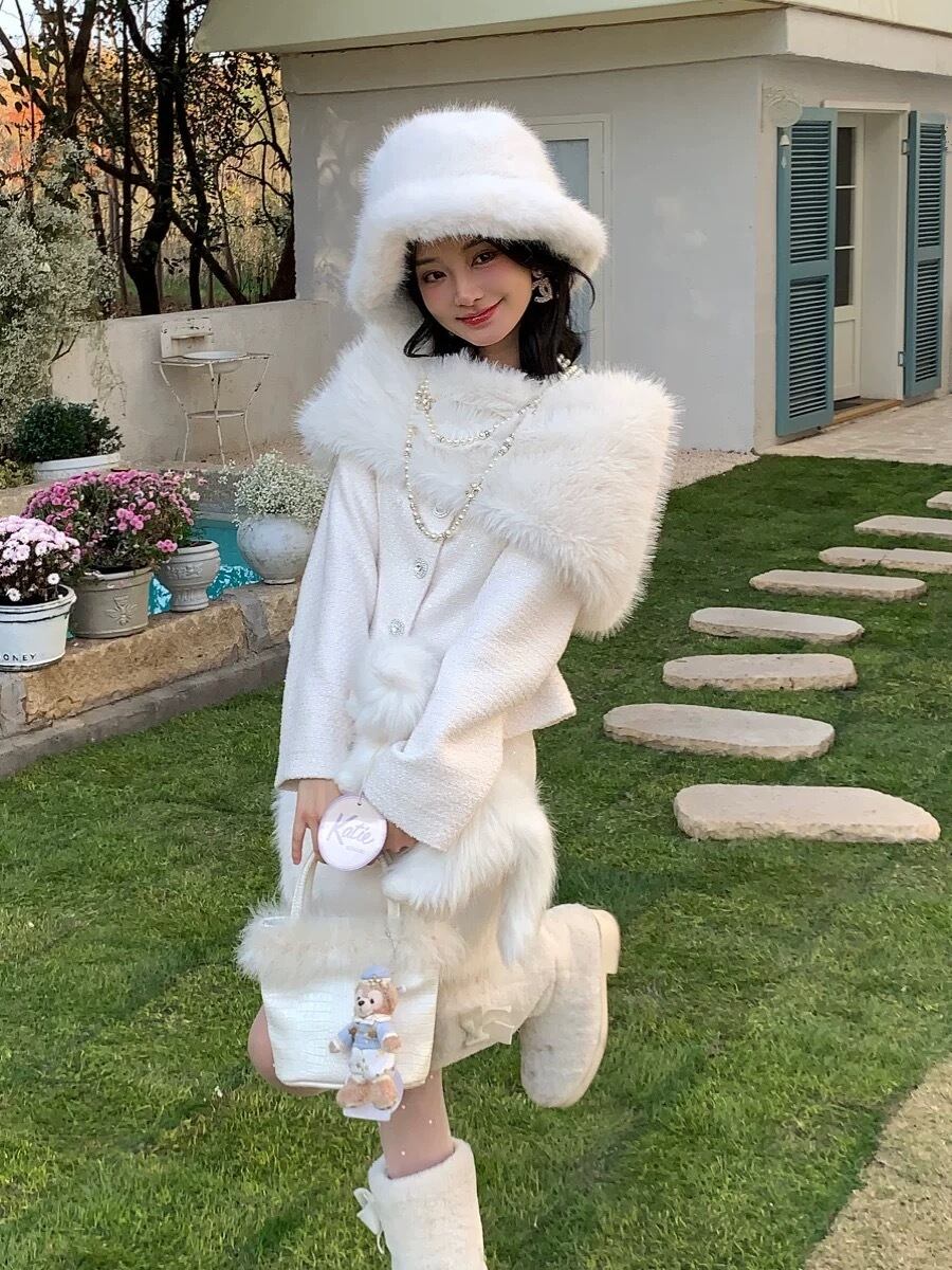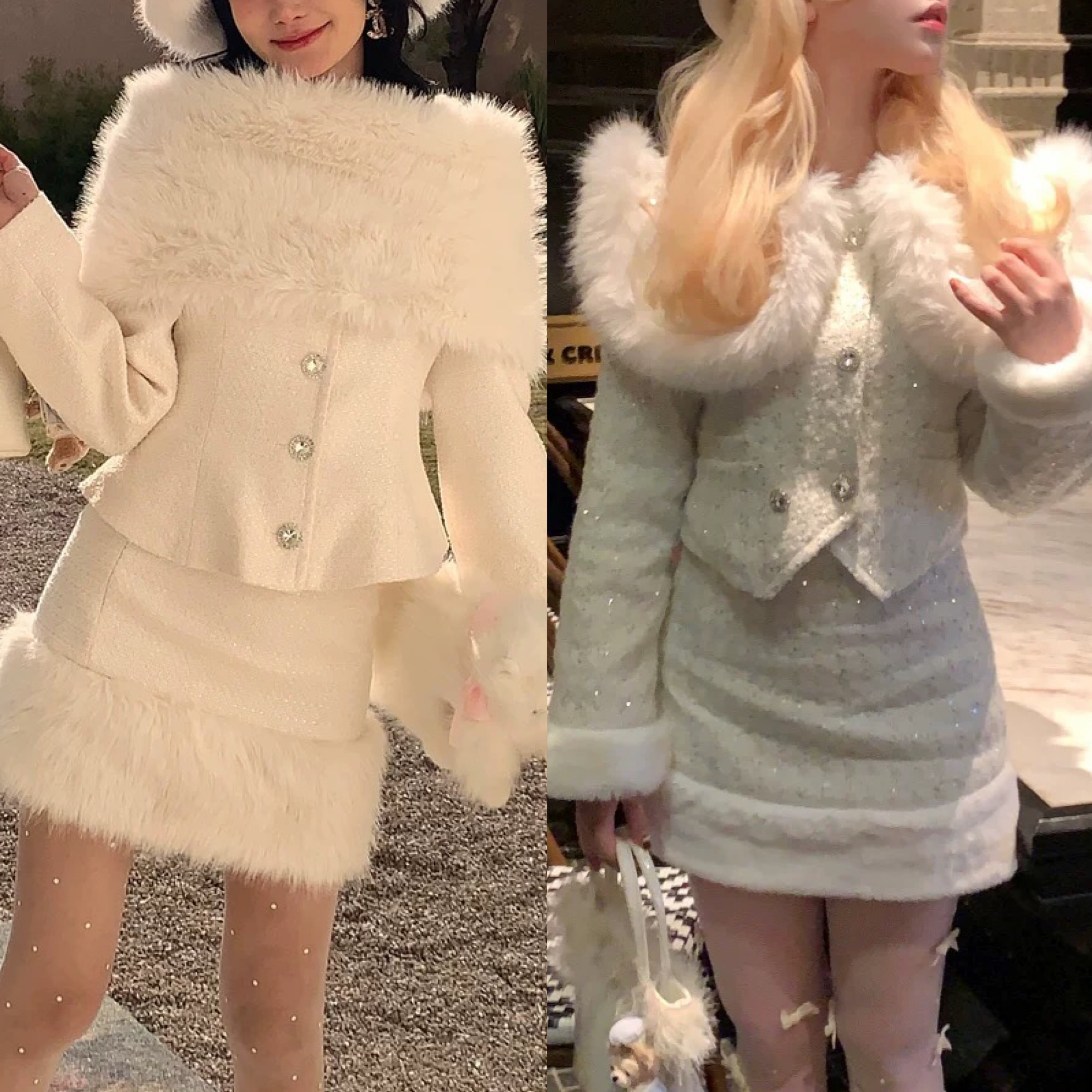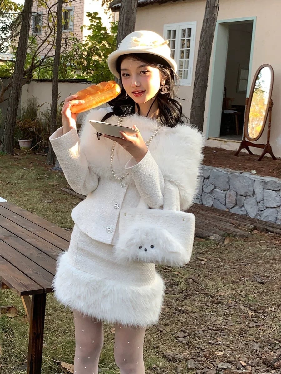 【セットアップ】スカート ジャケット アウター カーディガン ブラウス ファー 白 ホワイト ミニスカート ガーリー 原宿 衣装 スーツ 丸襟 お嬢様