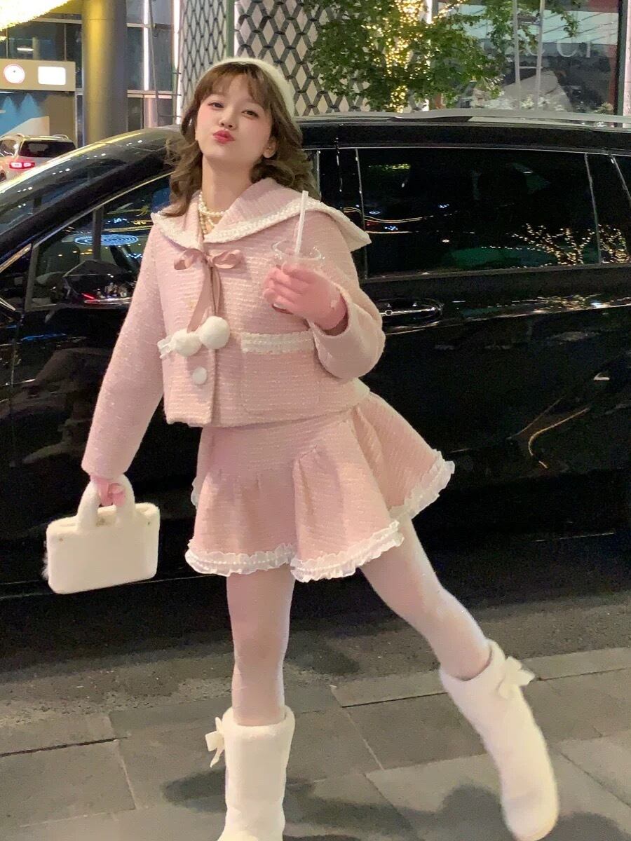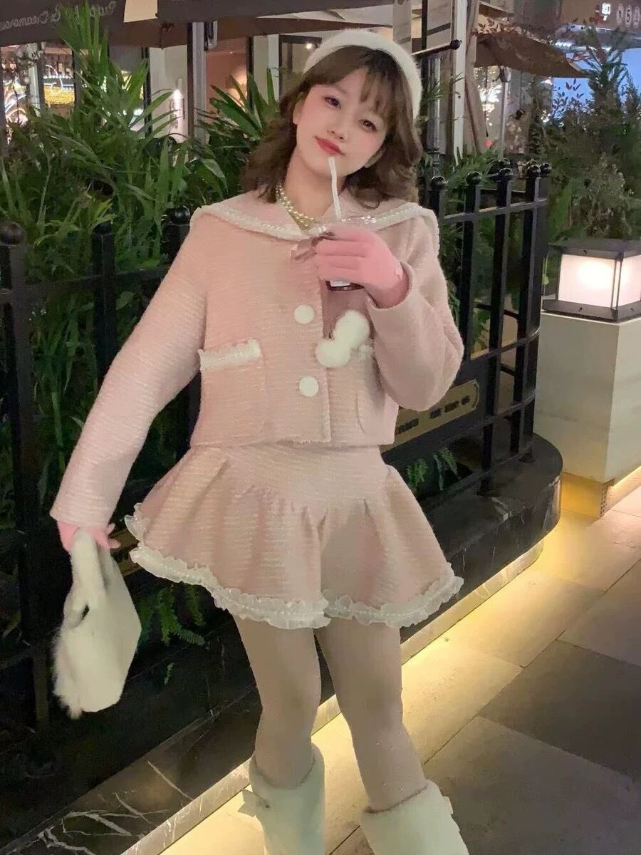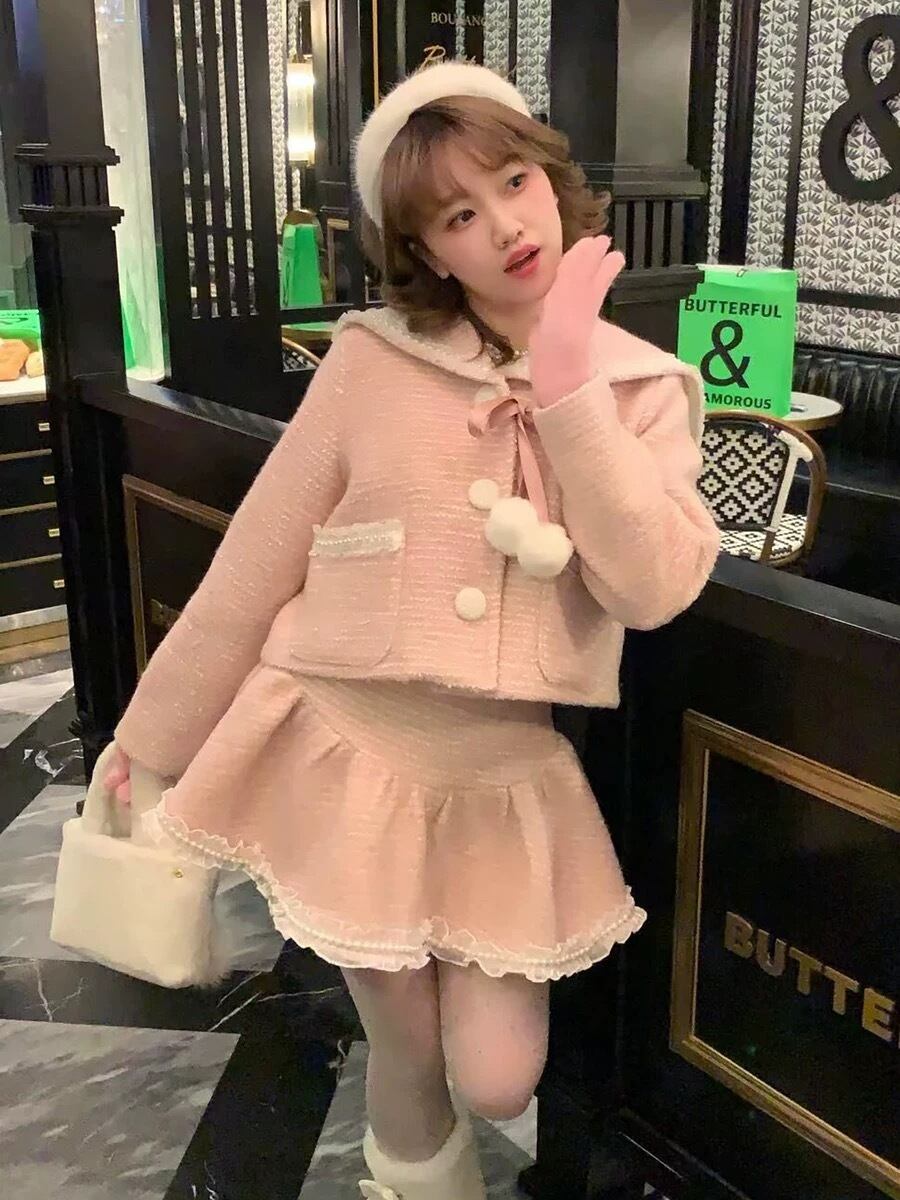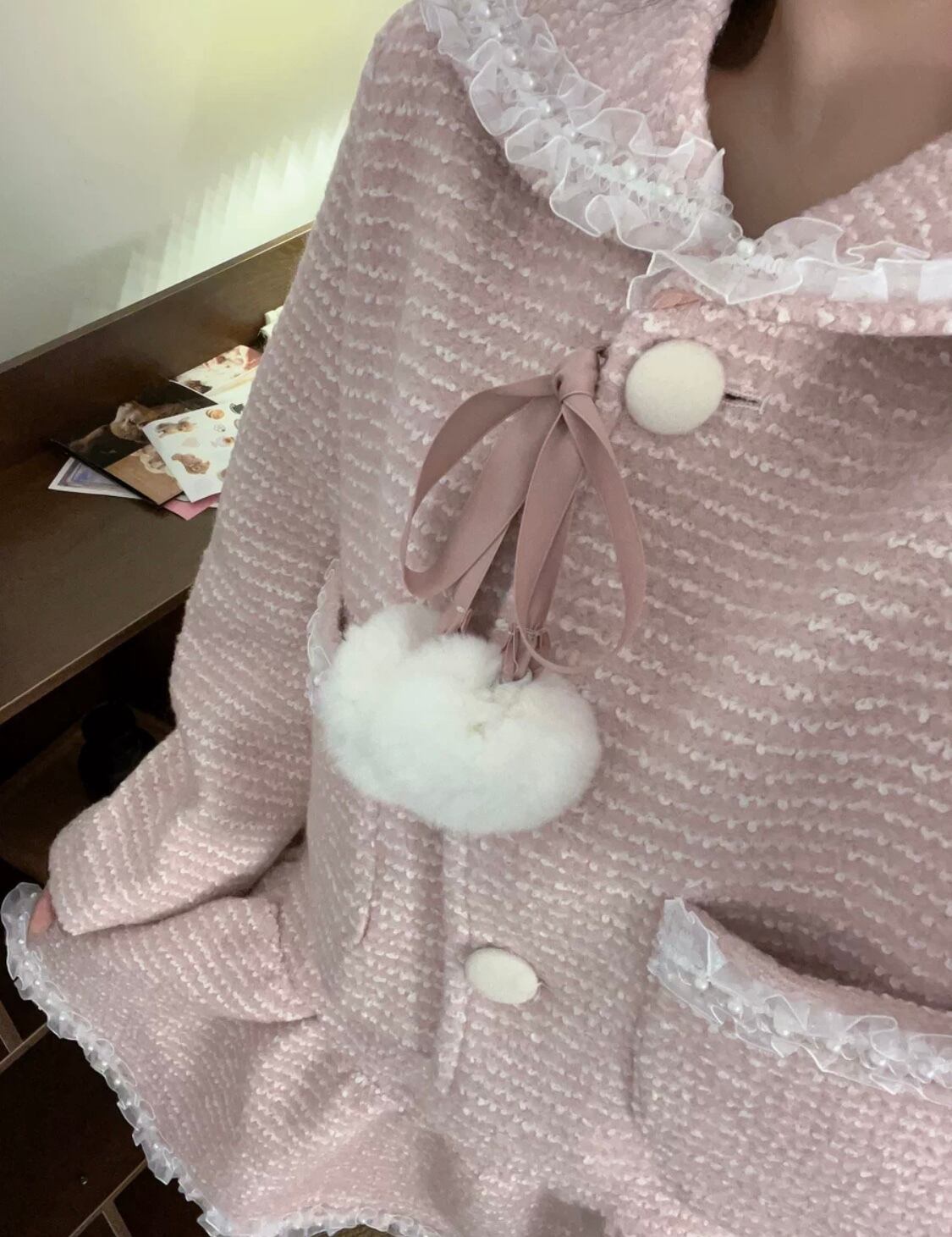 【セットアップ】ミニスカート スーツ ジャケット ピンク ガーリー 姫 ロリータ リボン ぽんぽん スーツ カーディガン ミニスカート