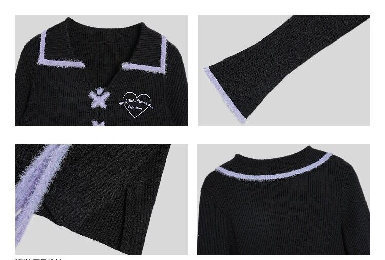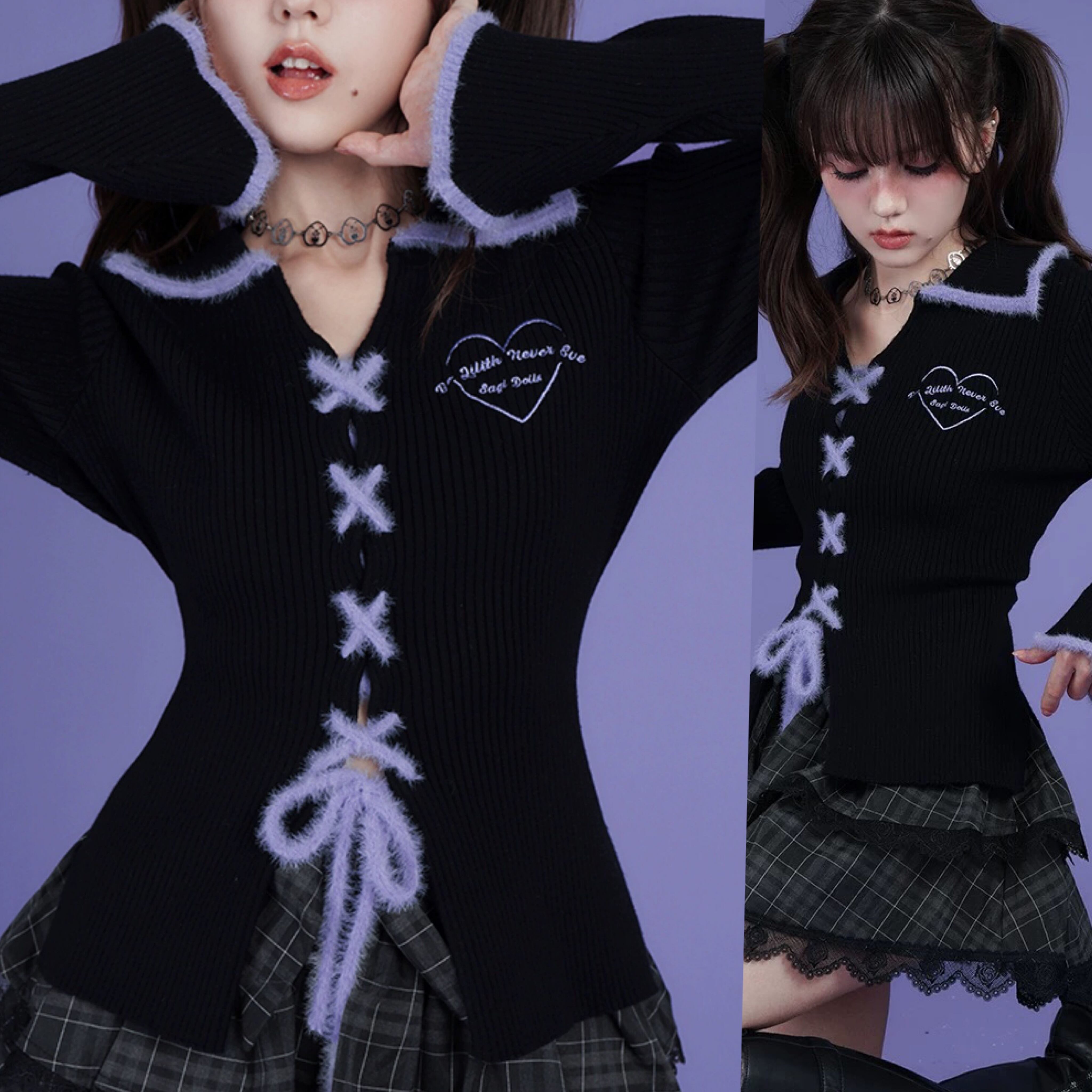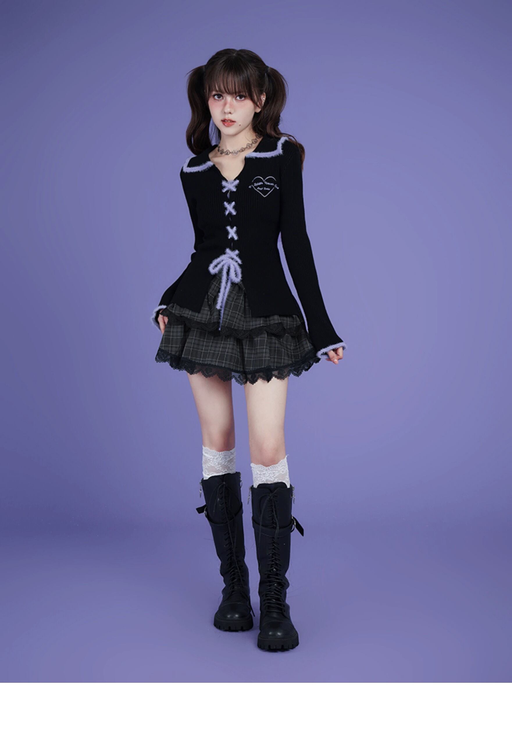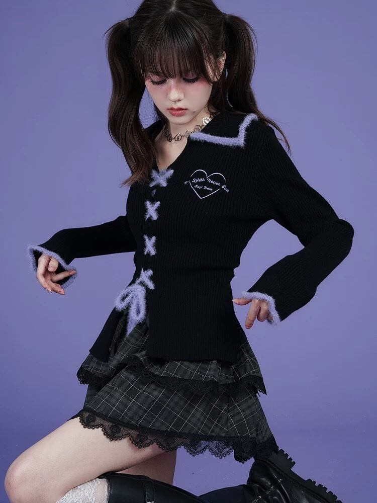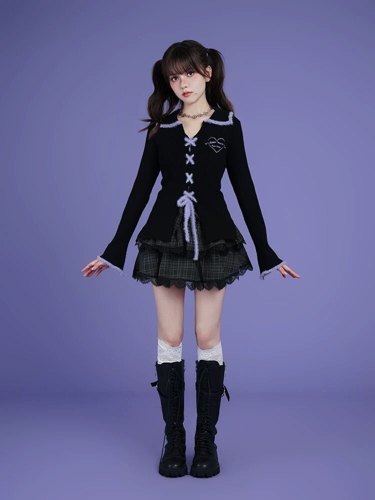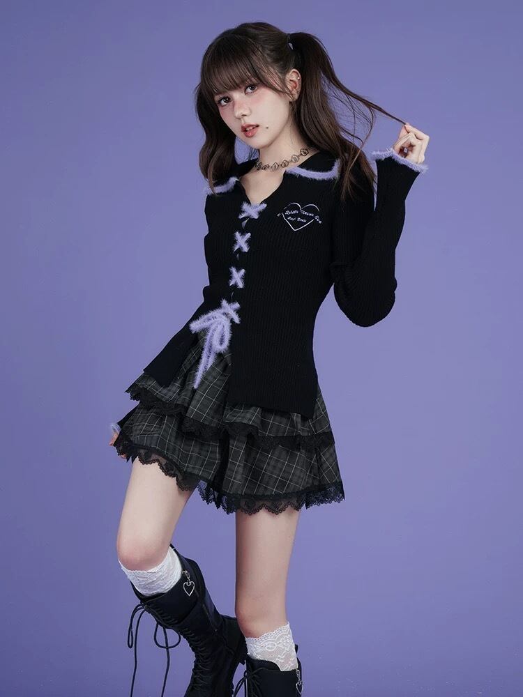 黒 紫 リボン ガーリー カーディガン セーター 可愛い 原宿 リボン ハート パープル
