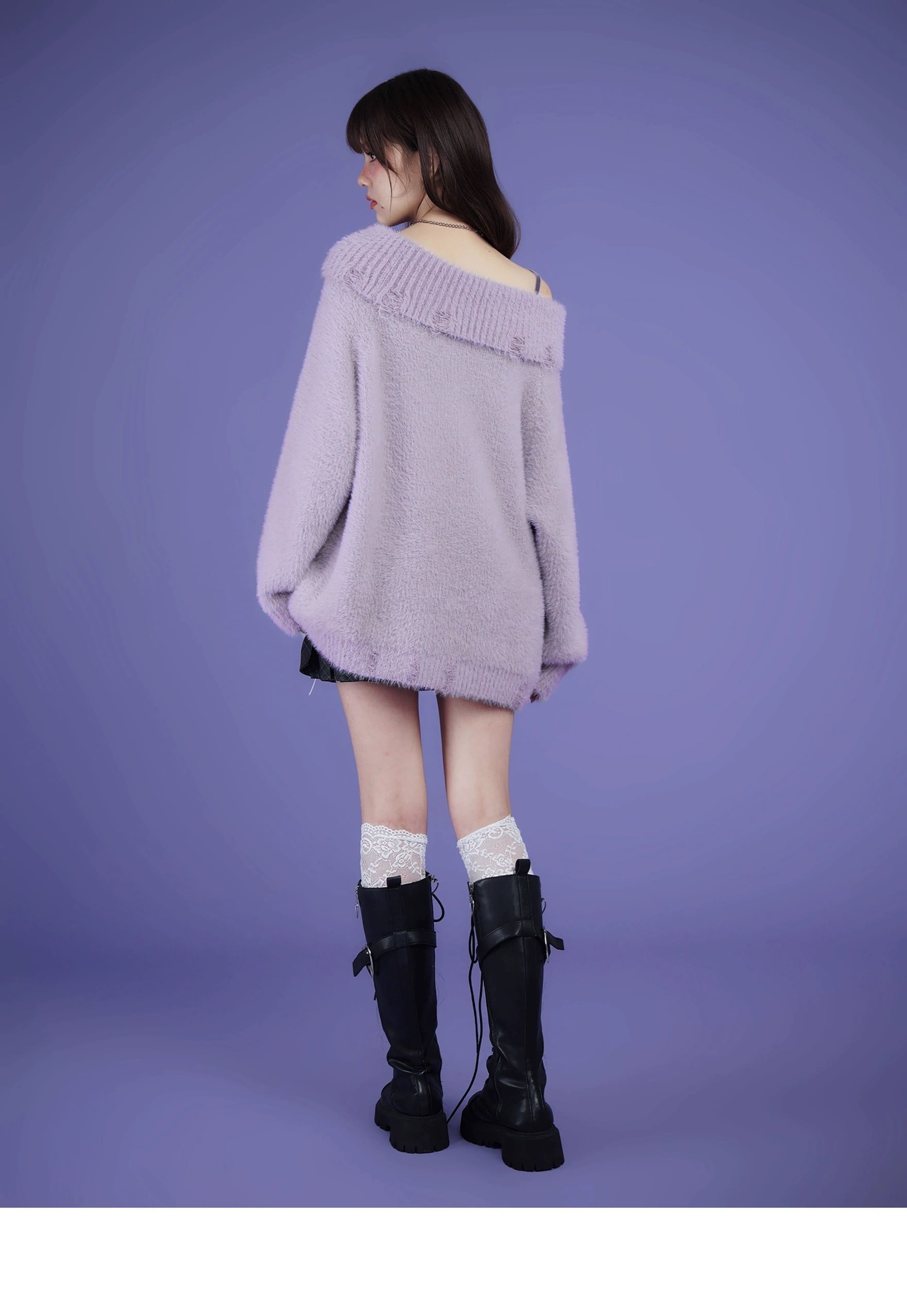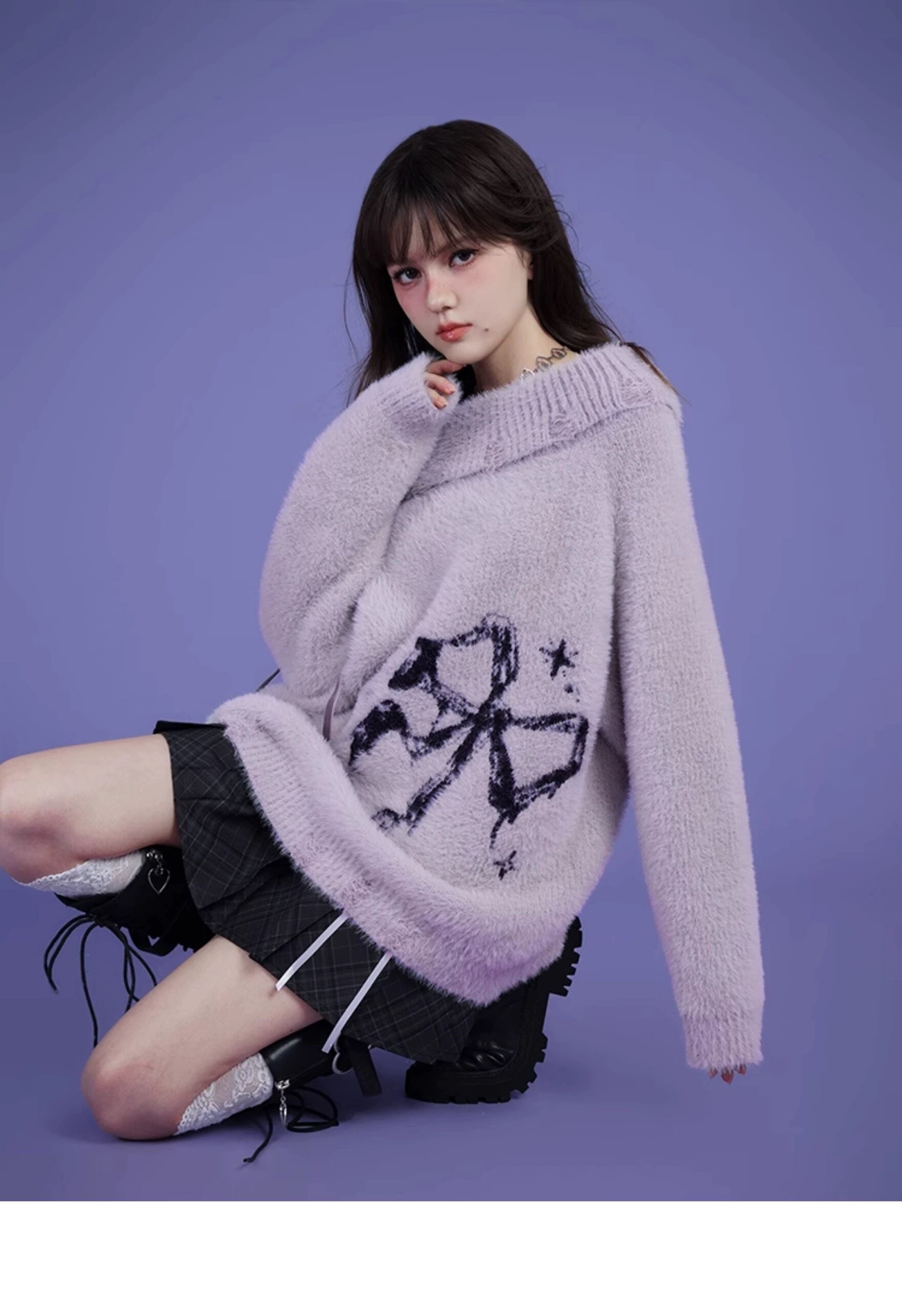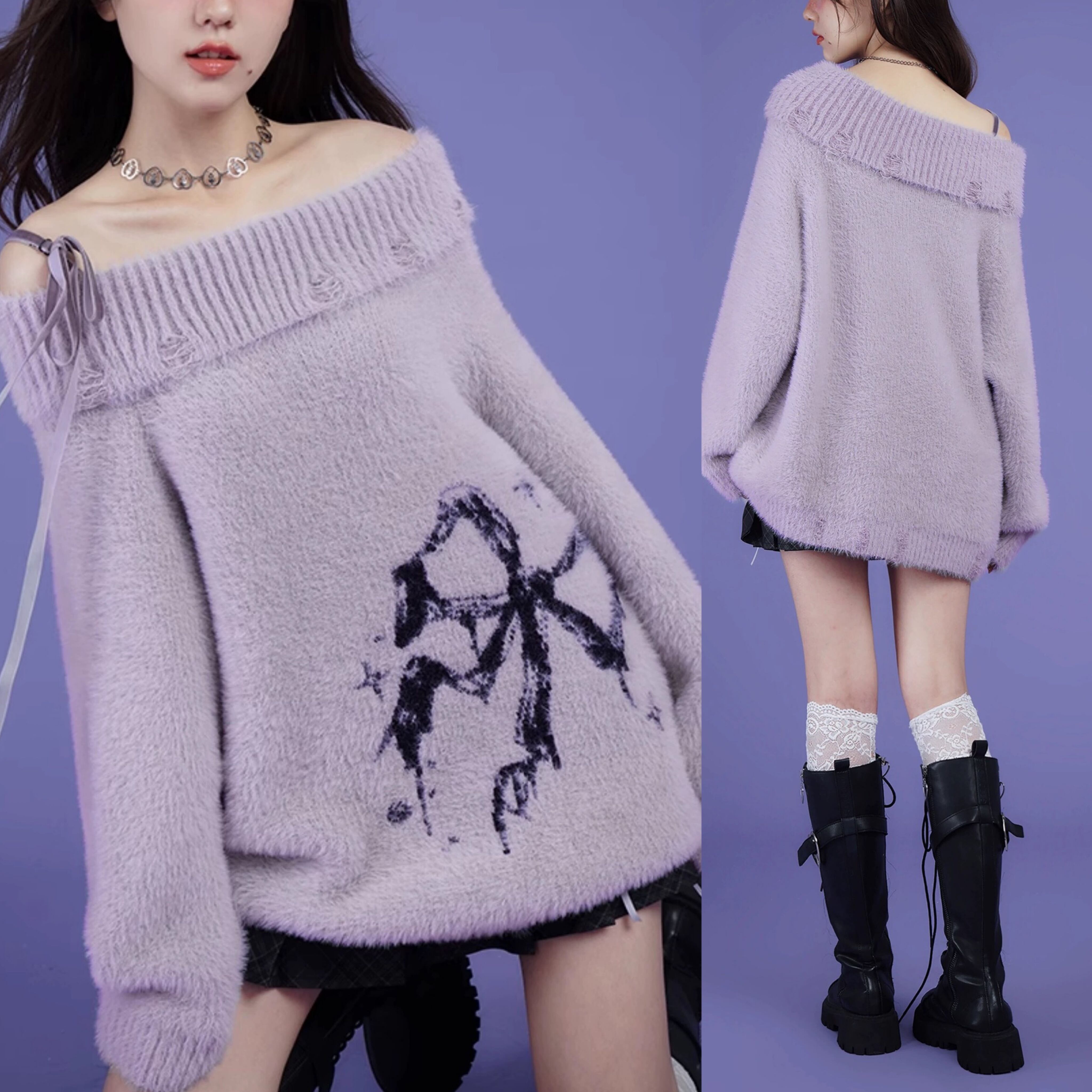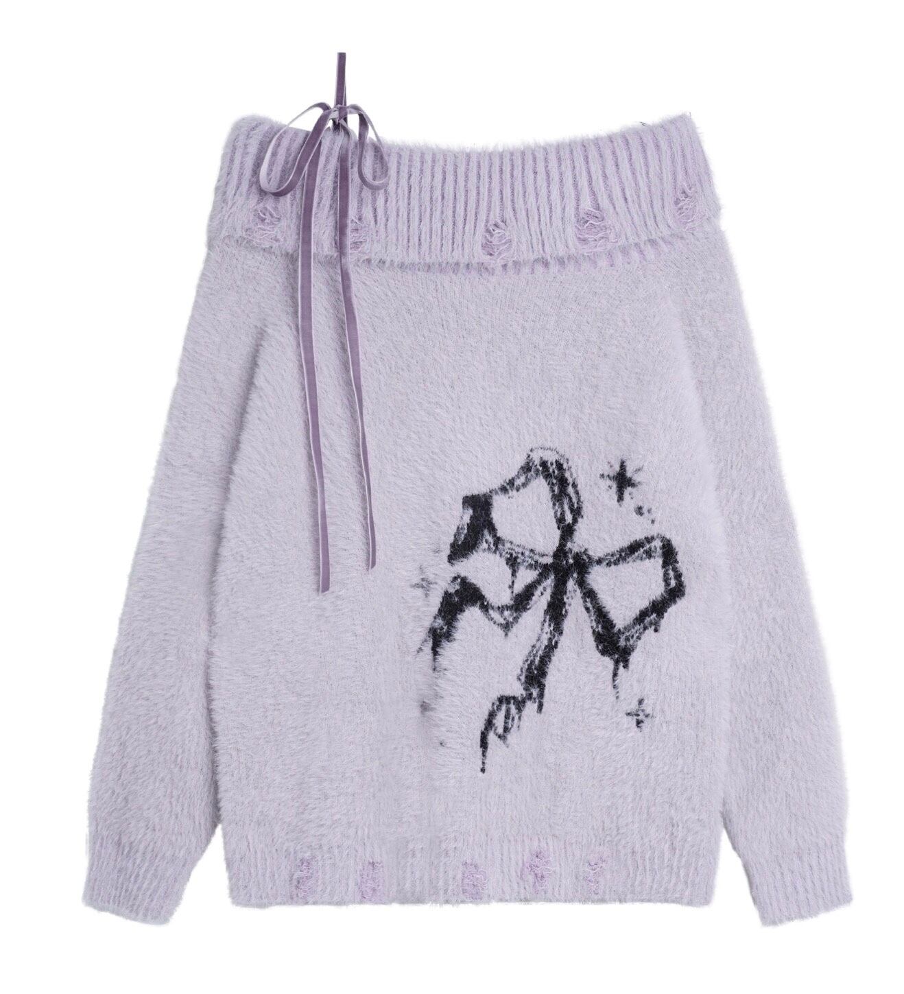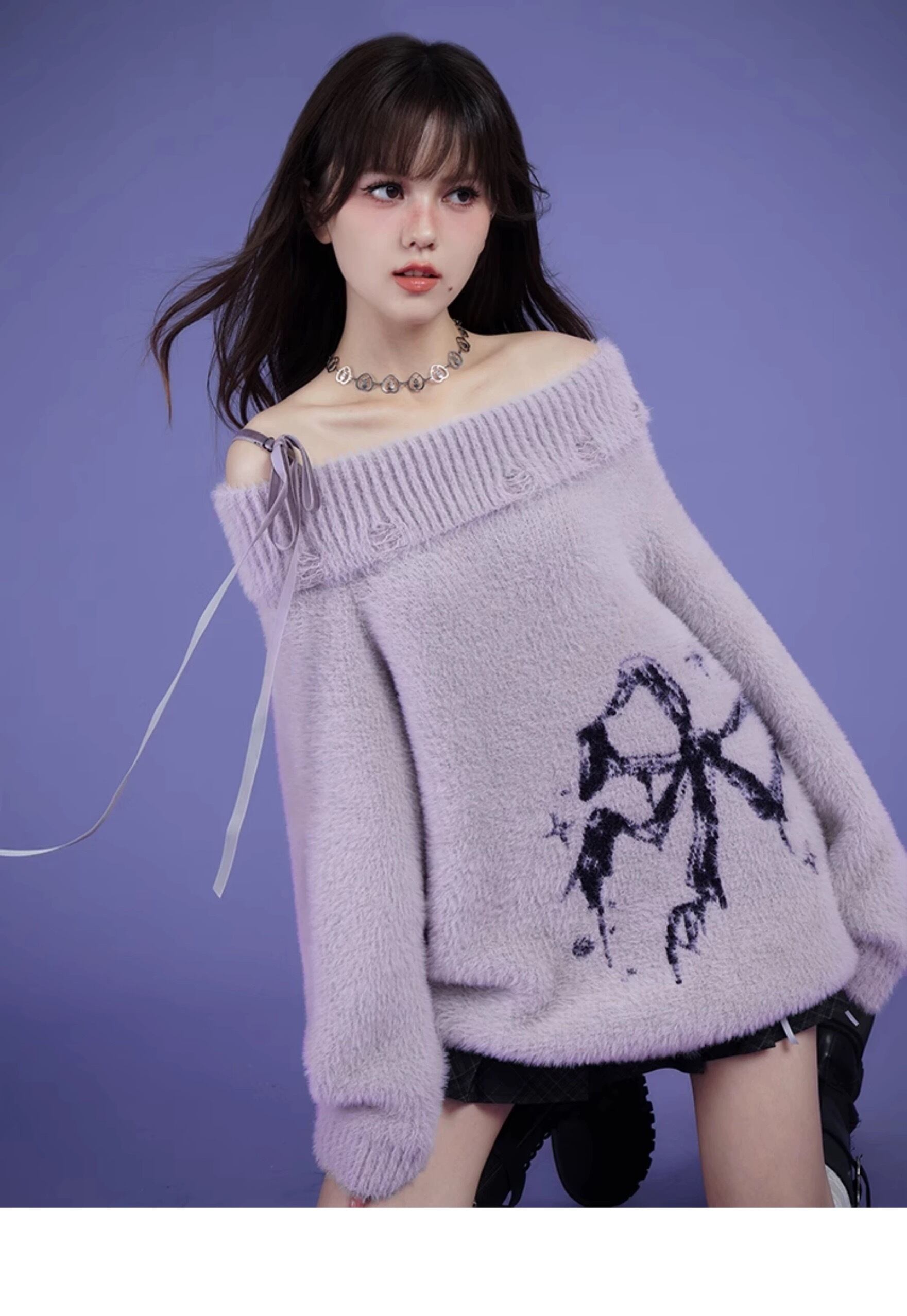 オフショルダー セーター ニット トップス カーディガン リボン ベージュ 紫 パープル 原宿 可愛い 渋谷 ワンピース