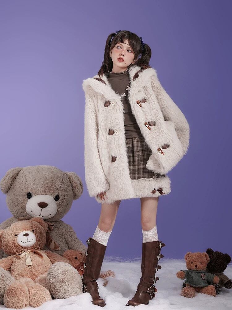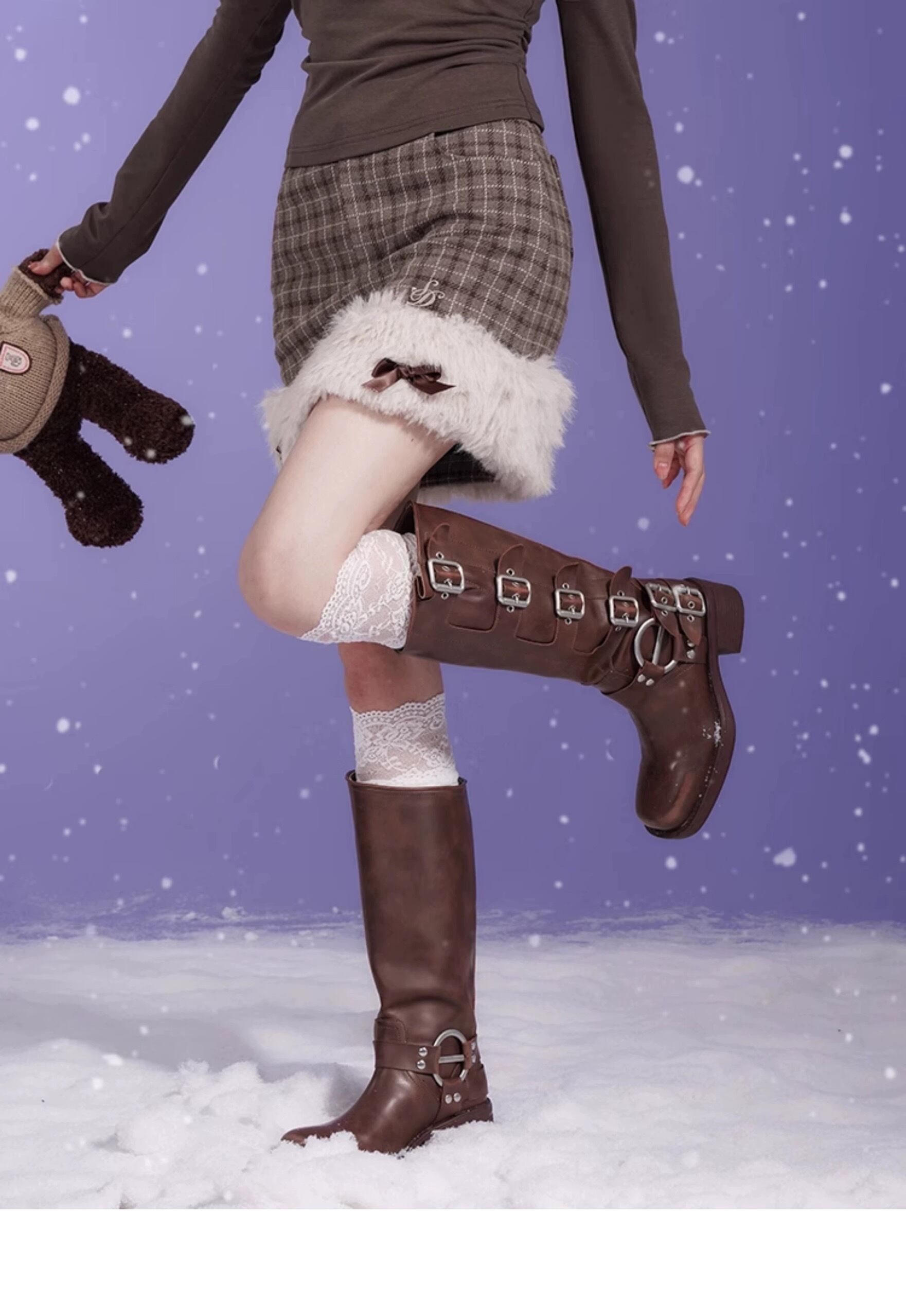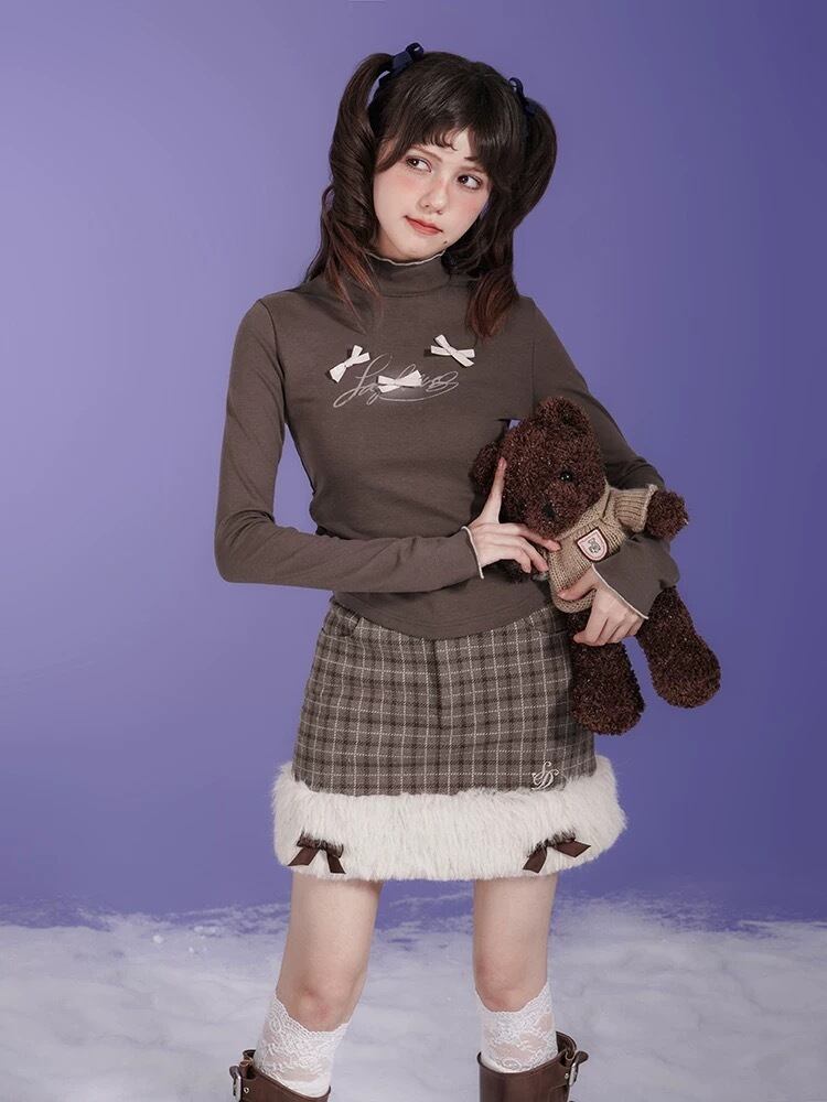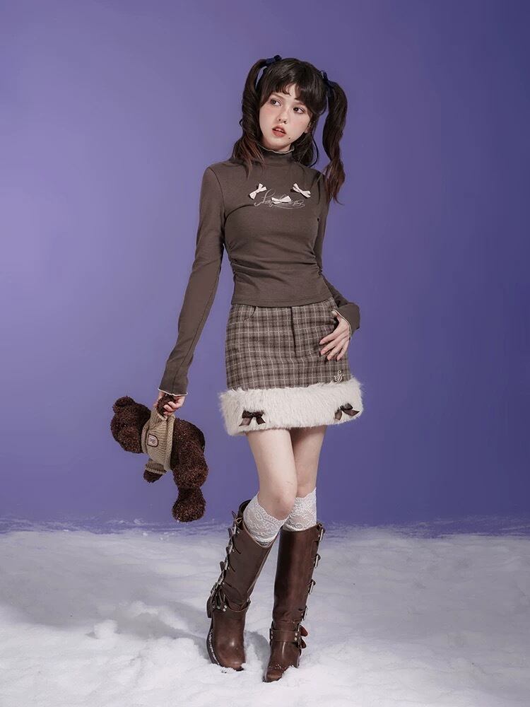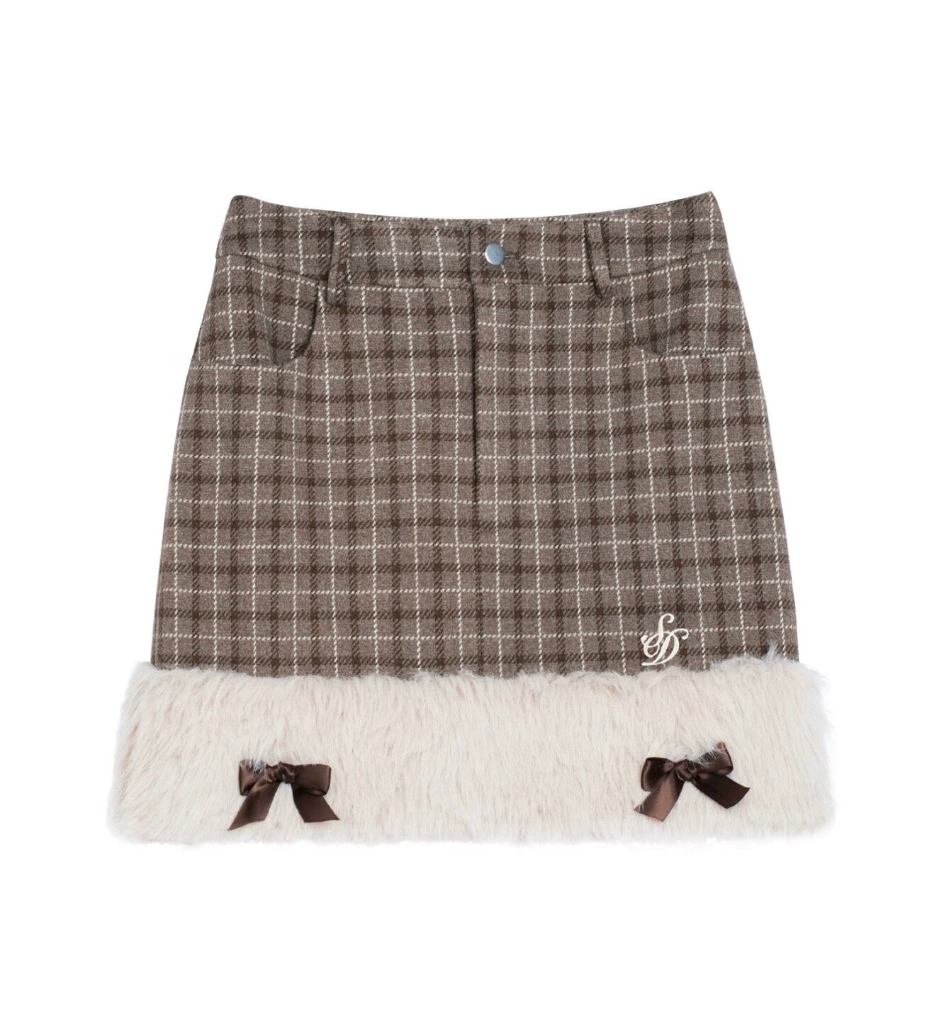 スカート ファー 茶色 ベージュ チェック ミニスカート ボトムス リボン ガーリー カジュアル 原宿 姫 ロリータ 可愛い