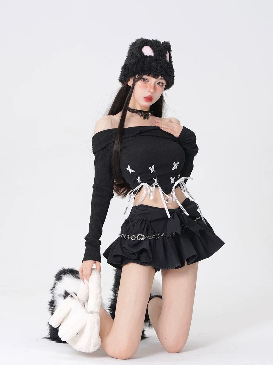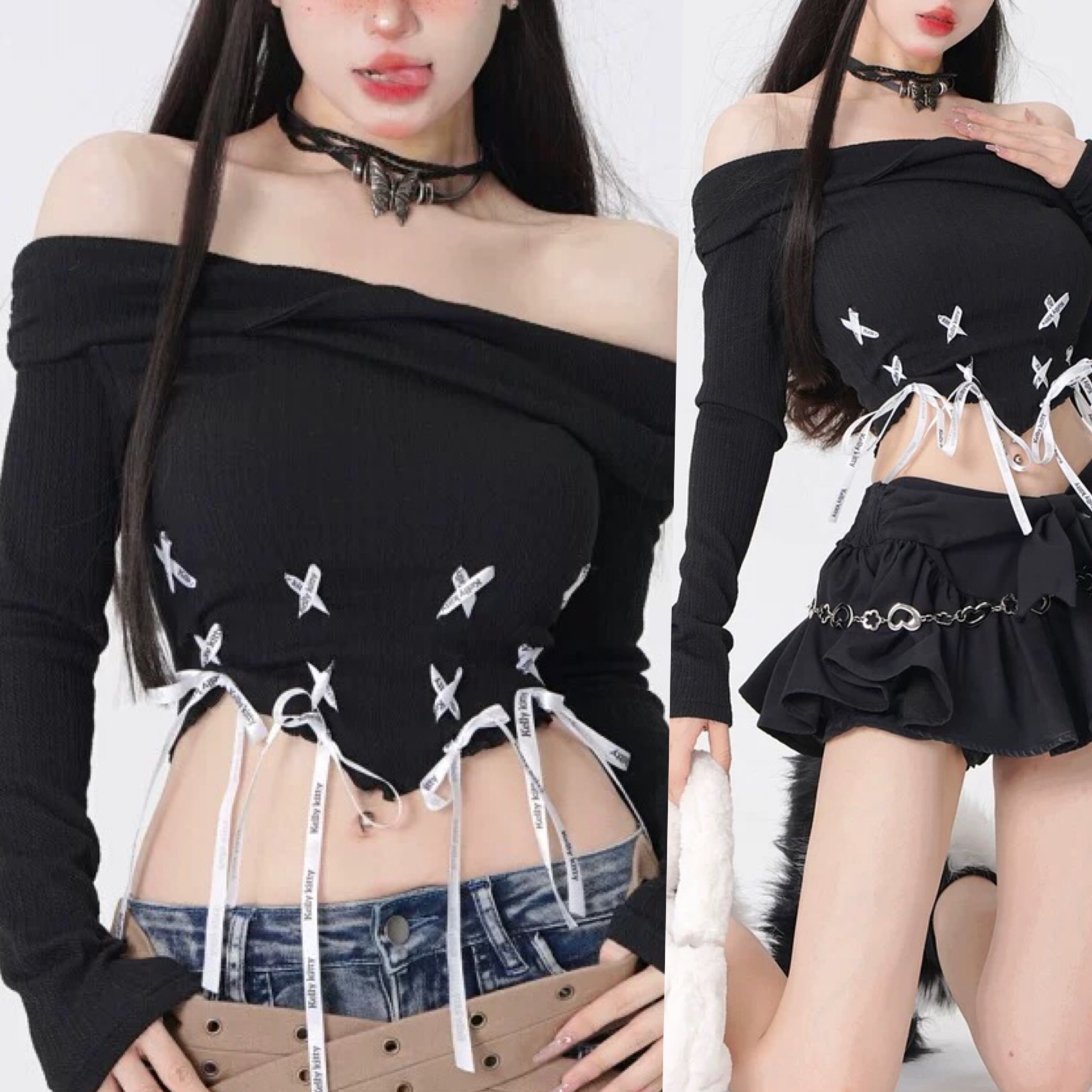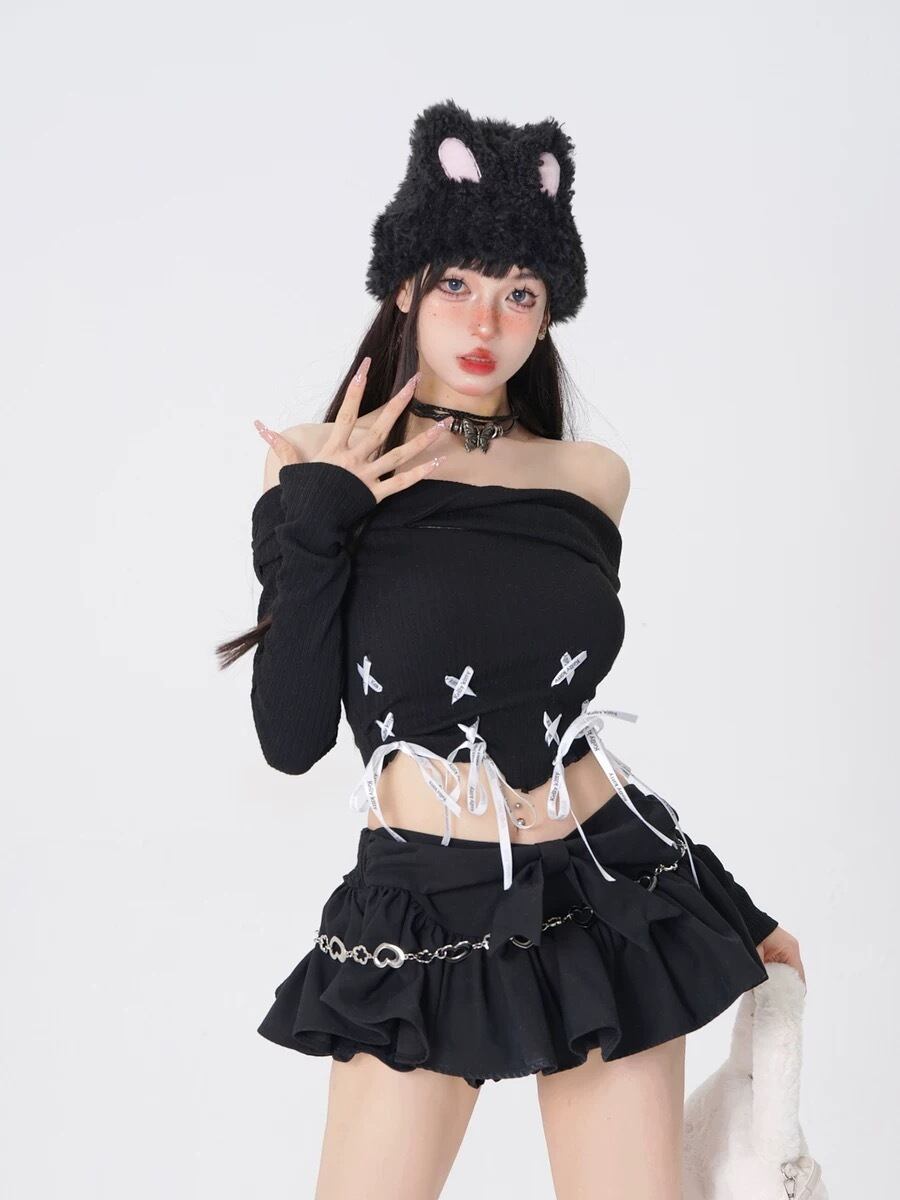 トップス 黒 オフショルダー リボン ガーリー セクシー Y2K 黒 オフショルダー セーター ブラウス Tシャツ