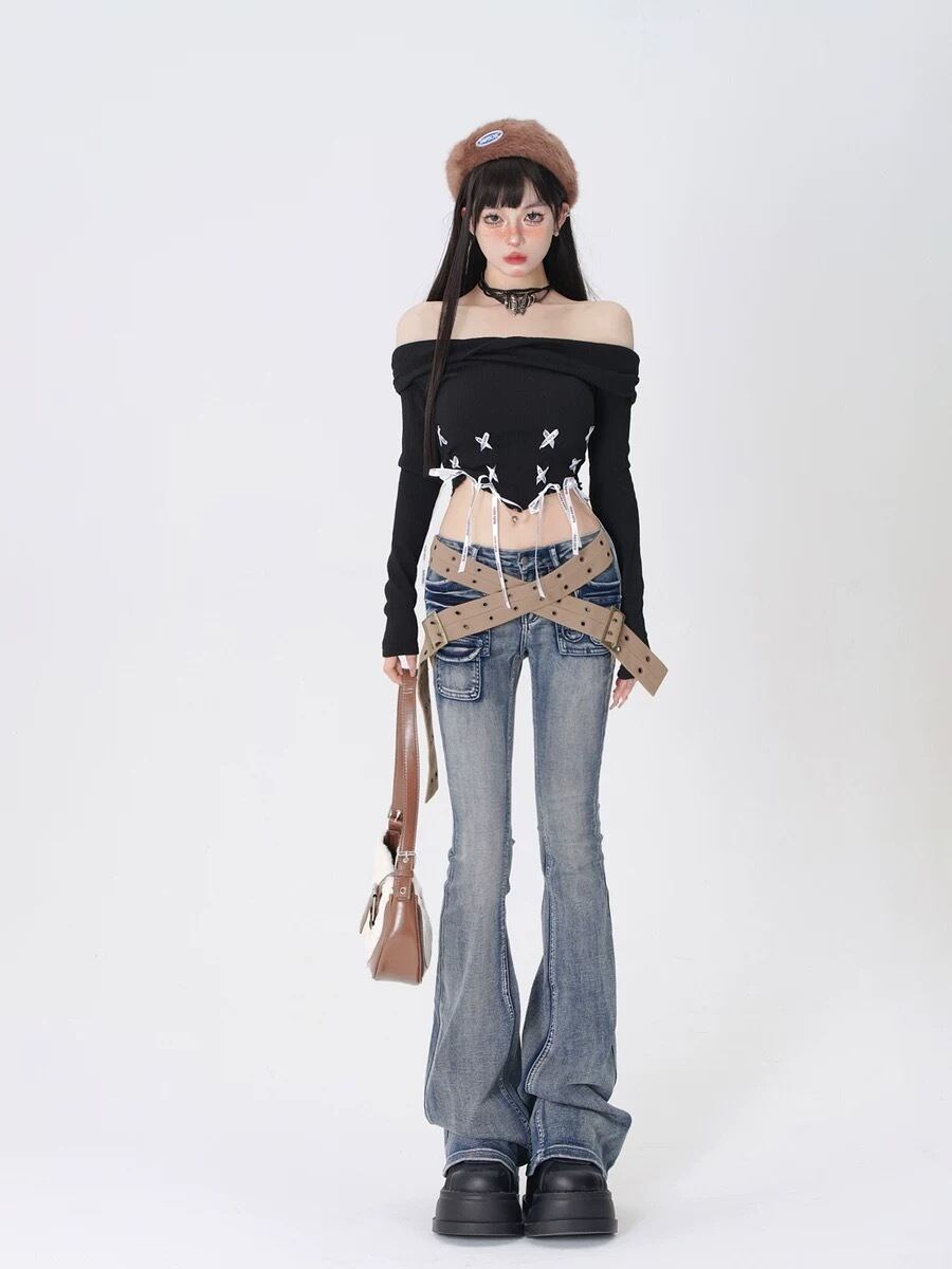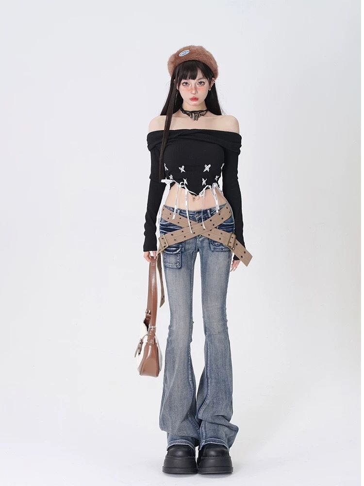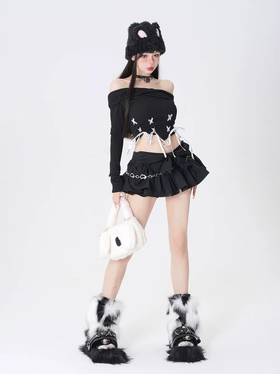 トップス 黒 オフショルダー リボン ガーリー セクシー Y2K 黒 オフショルダー セーター ブラウス Tシャツ