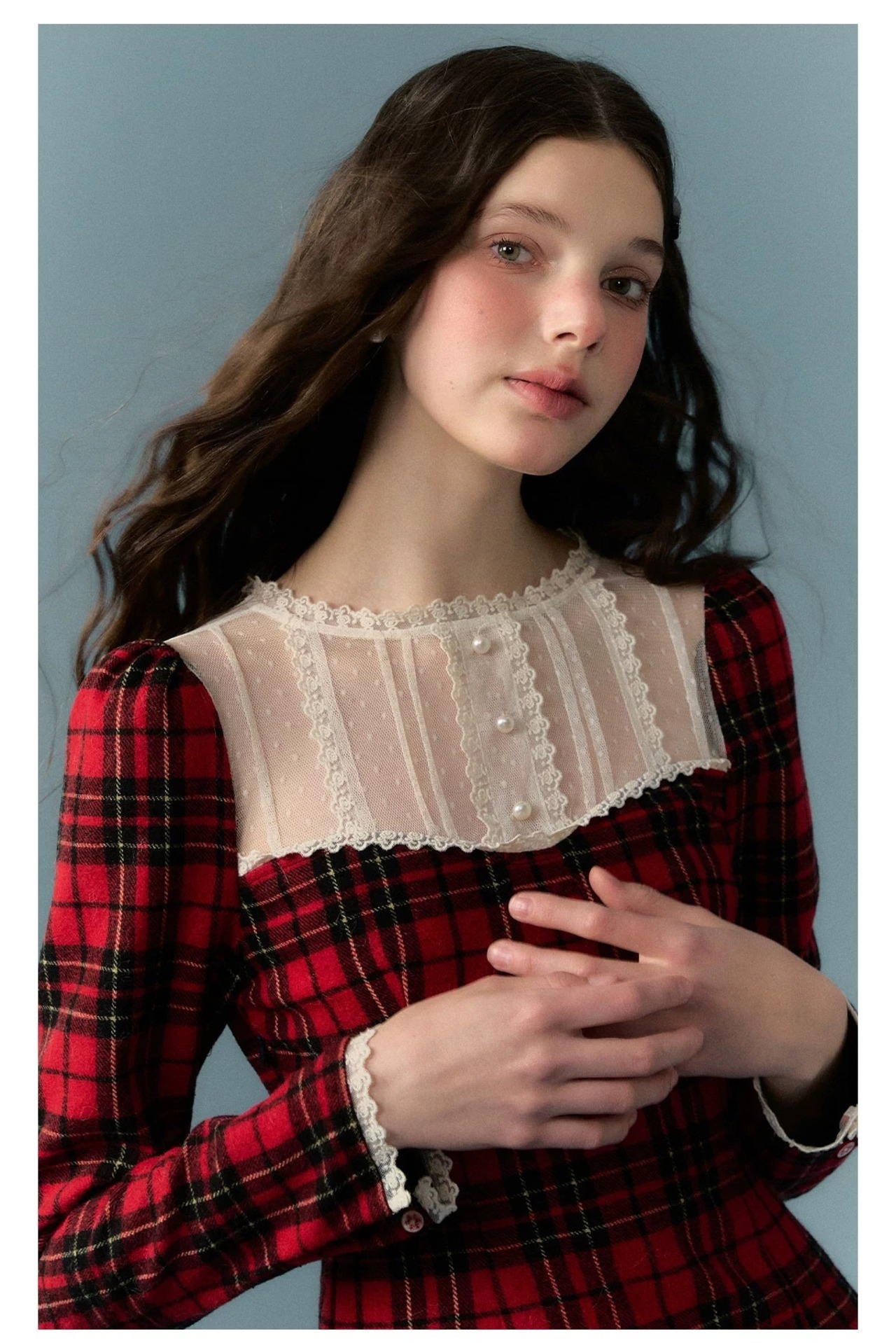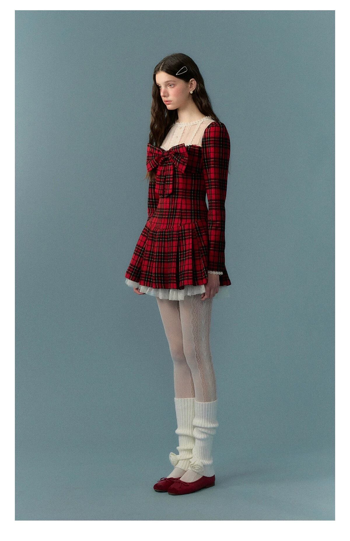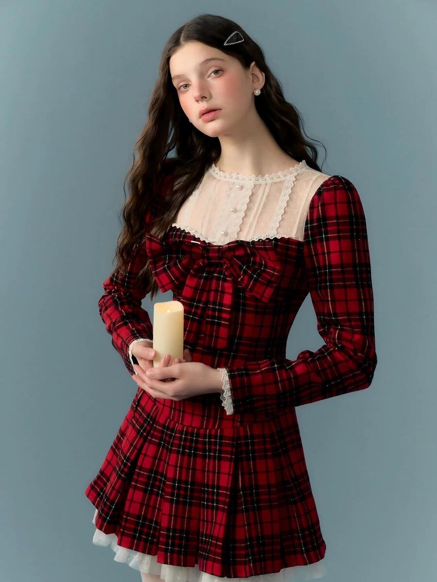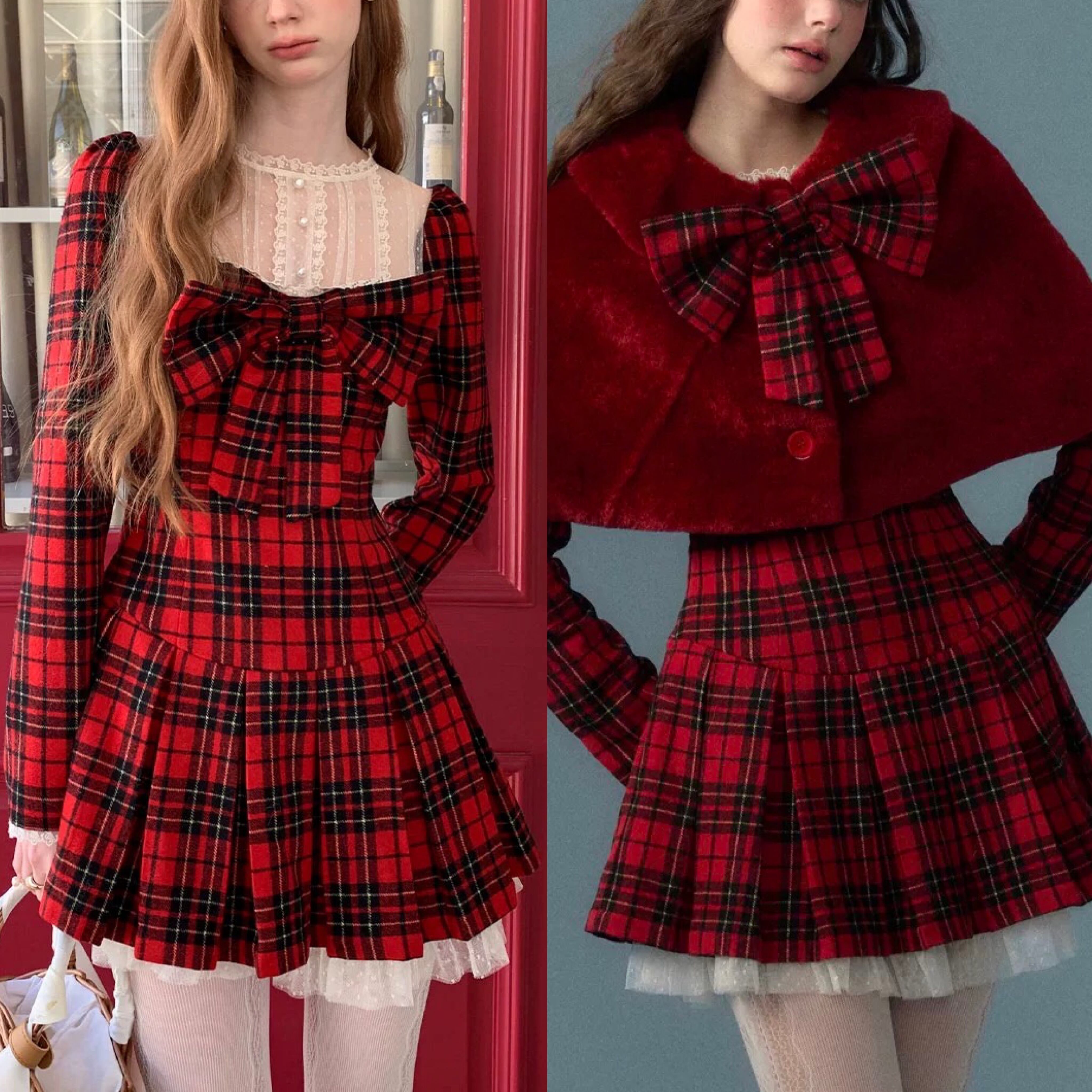 赤 リボン チェック ワンピース ガーリー 姫 可愛い 原宿 お嬢様 リボン ミニスカート プリーツ