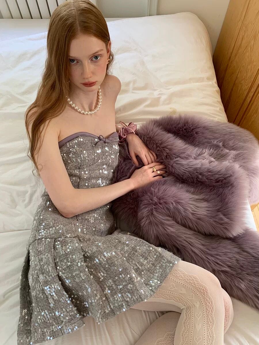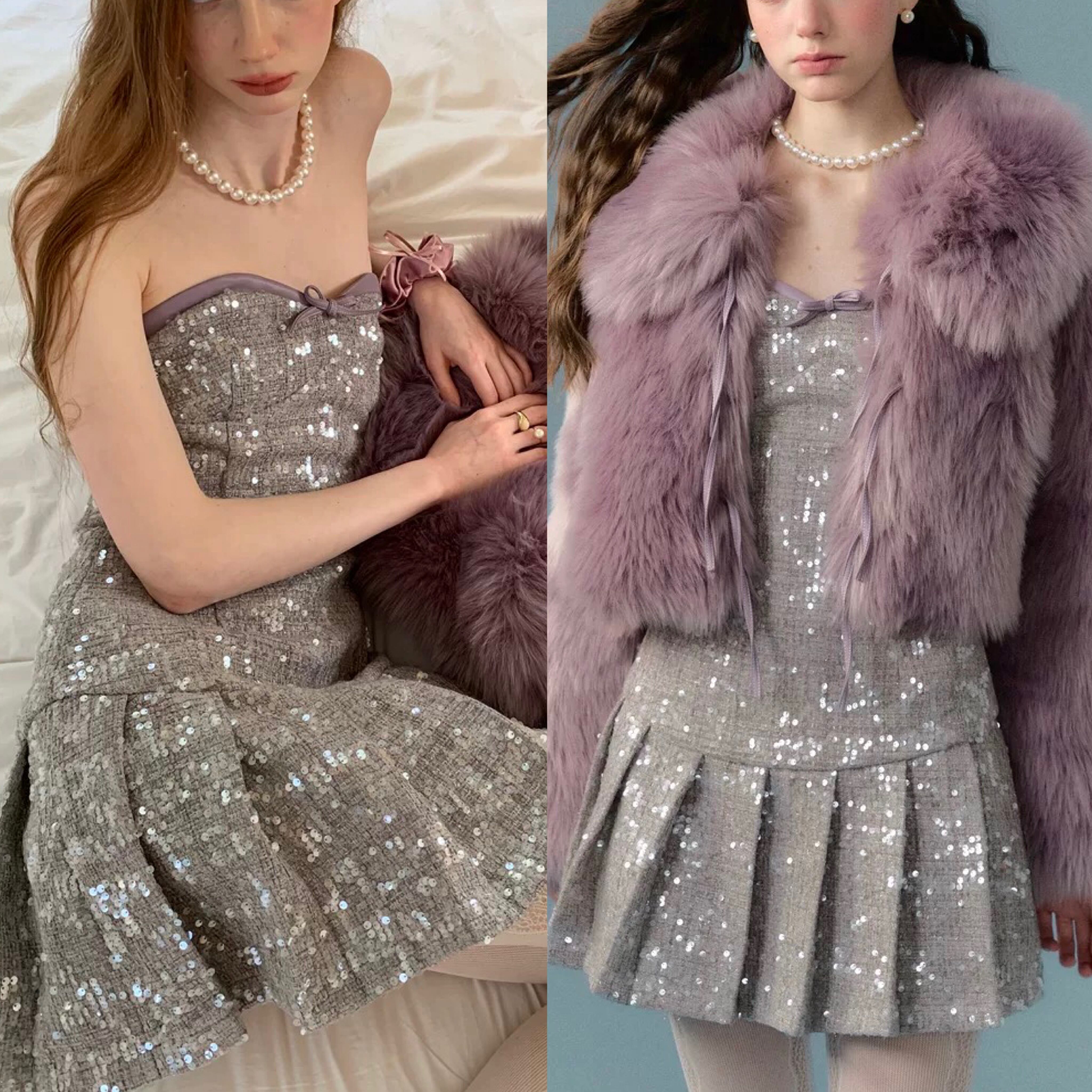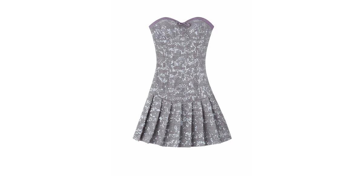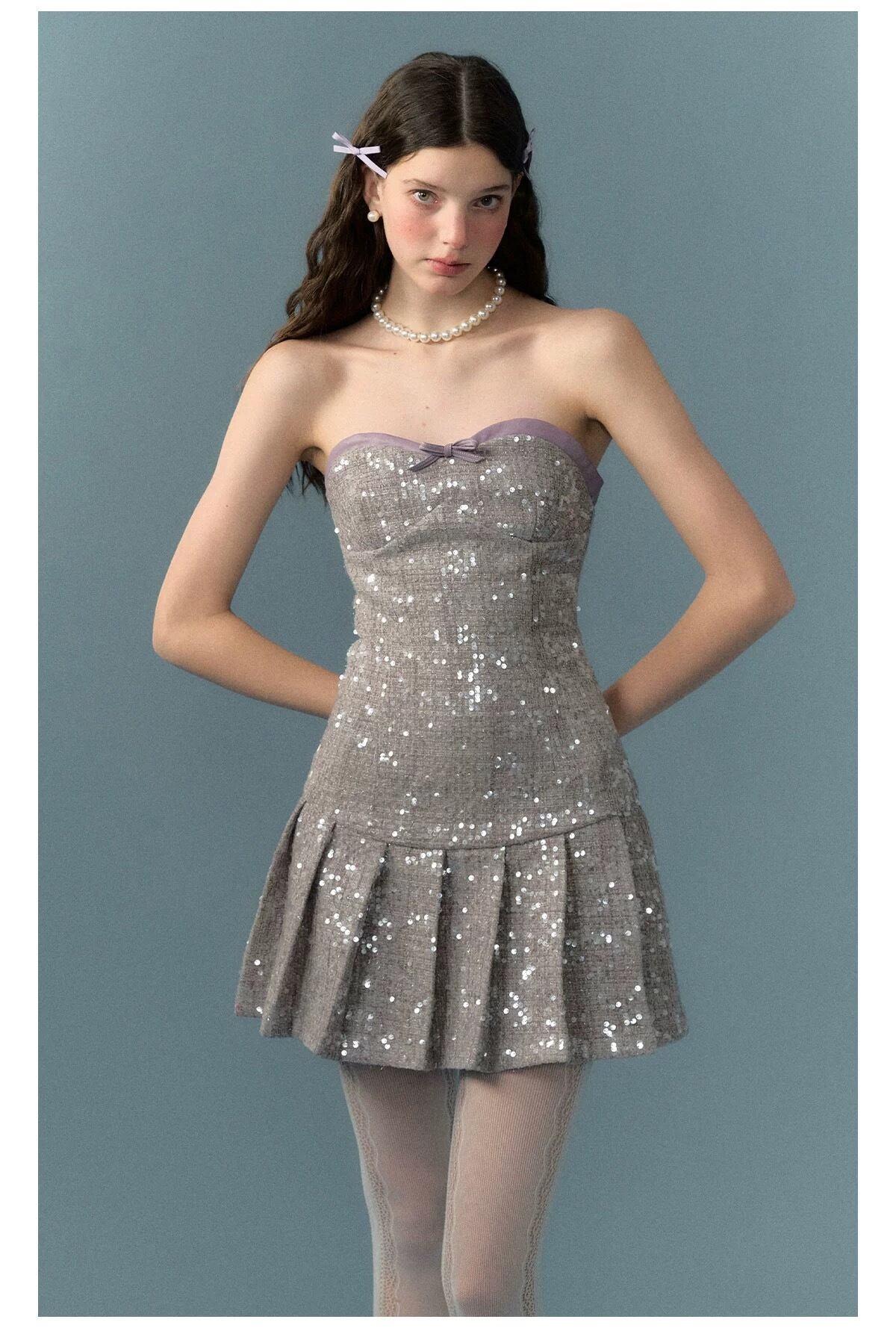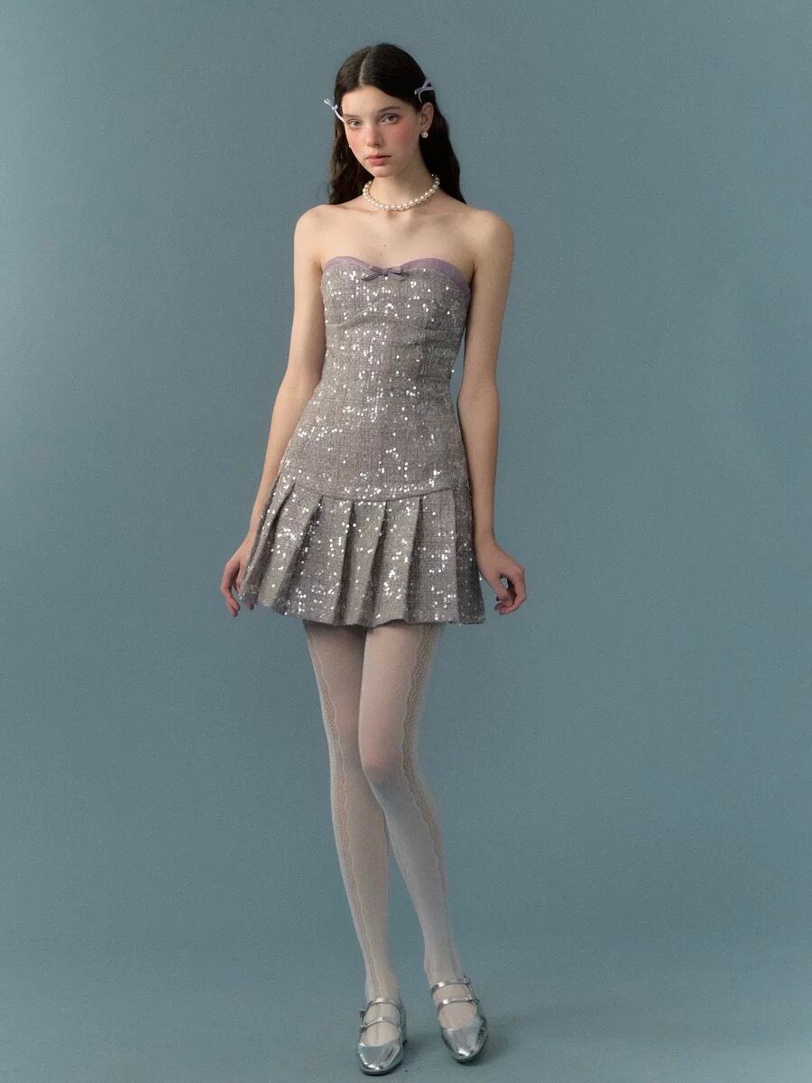 スパンコール キラキラ ラメ グレー ミニスカート ドレス ワンピース ベアトップ プリーツスカート ブラウス