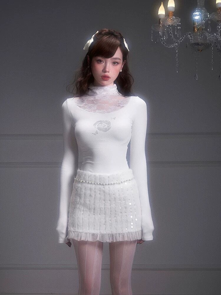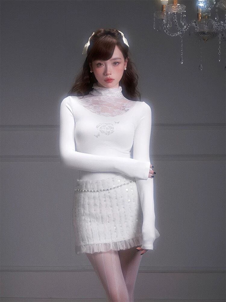 【トップス】ホワイト 白 ハイネック ブラウス シャツ 可愛い エレガント レース ガーリー 原宿 ホワイト お嬢様 カーディガン ブラウス