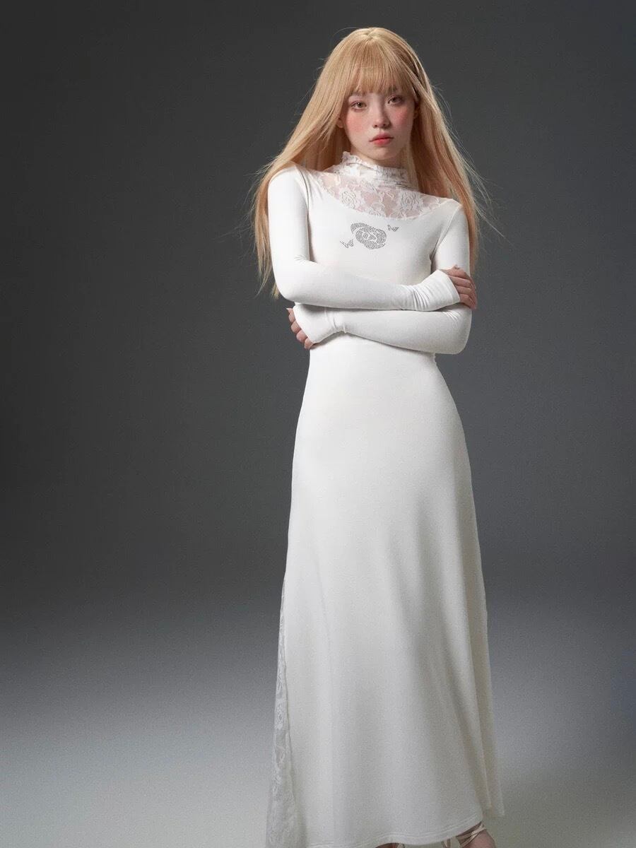 ワンピース 茶色 白 カジュアル スウェット マキシ レース ブラウス フレア ホワイト 白 エレガント カジュアル