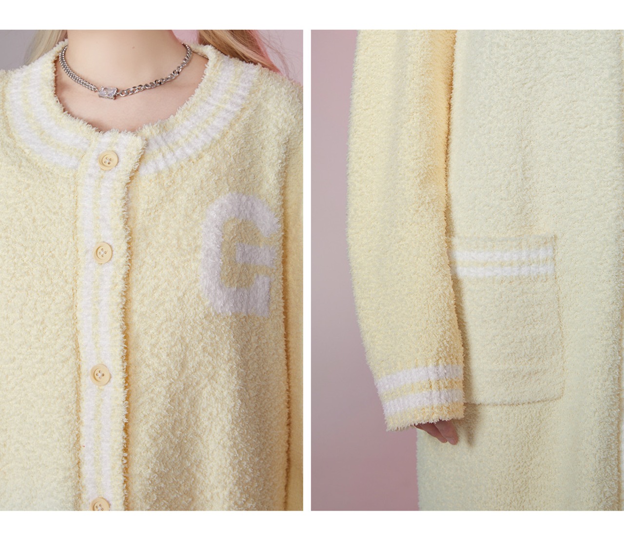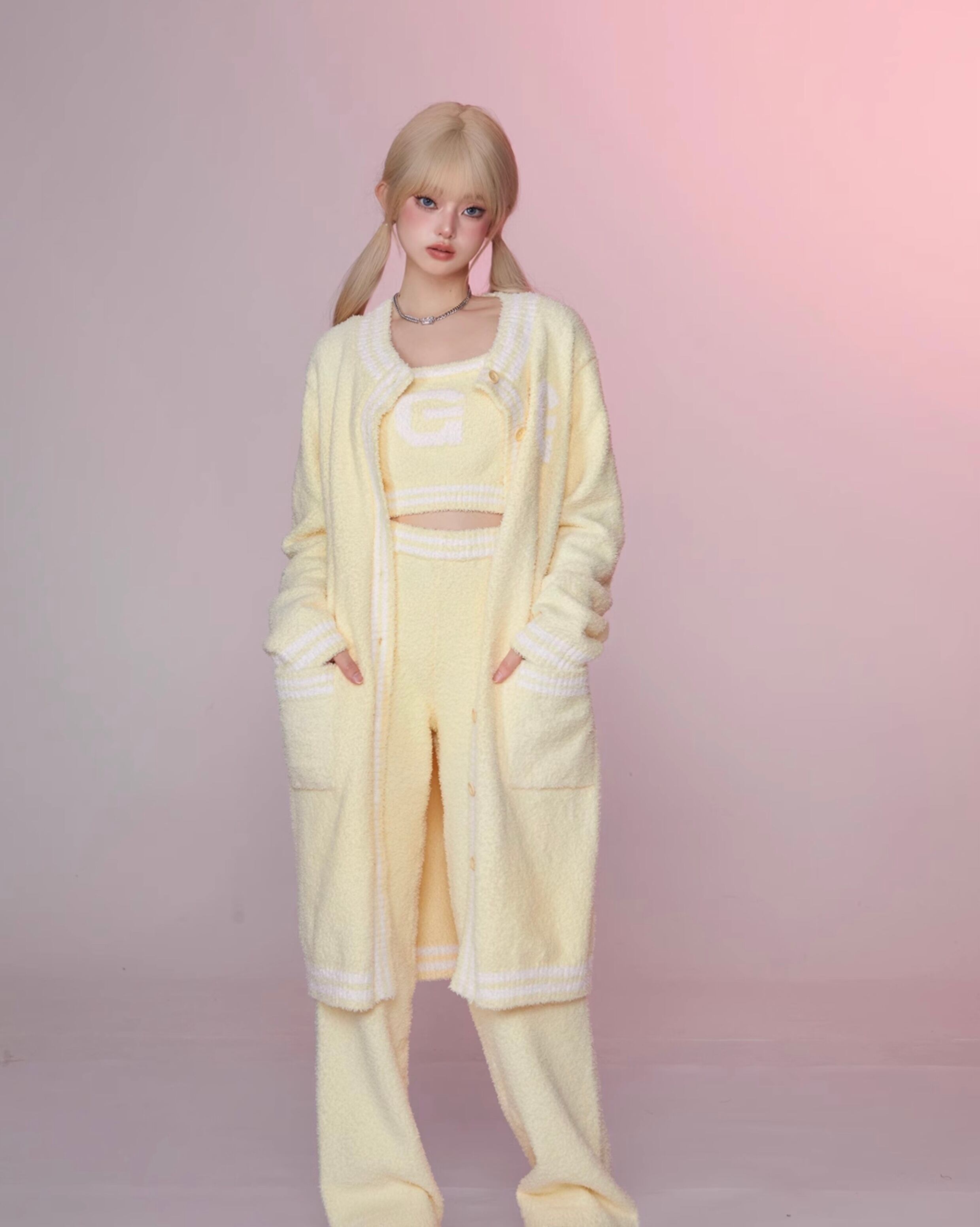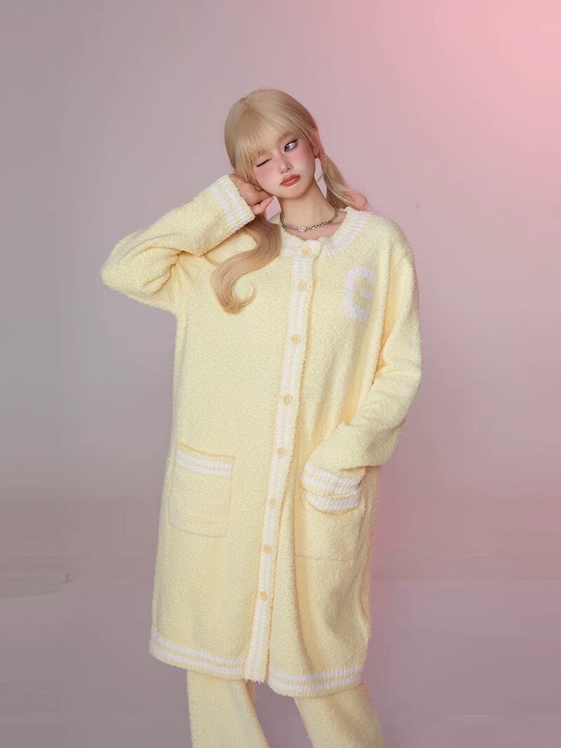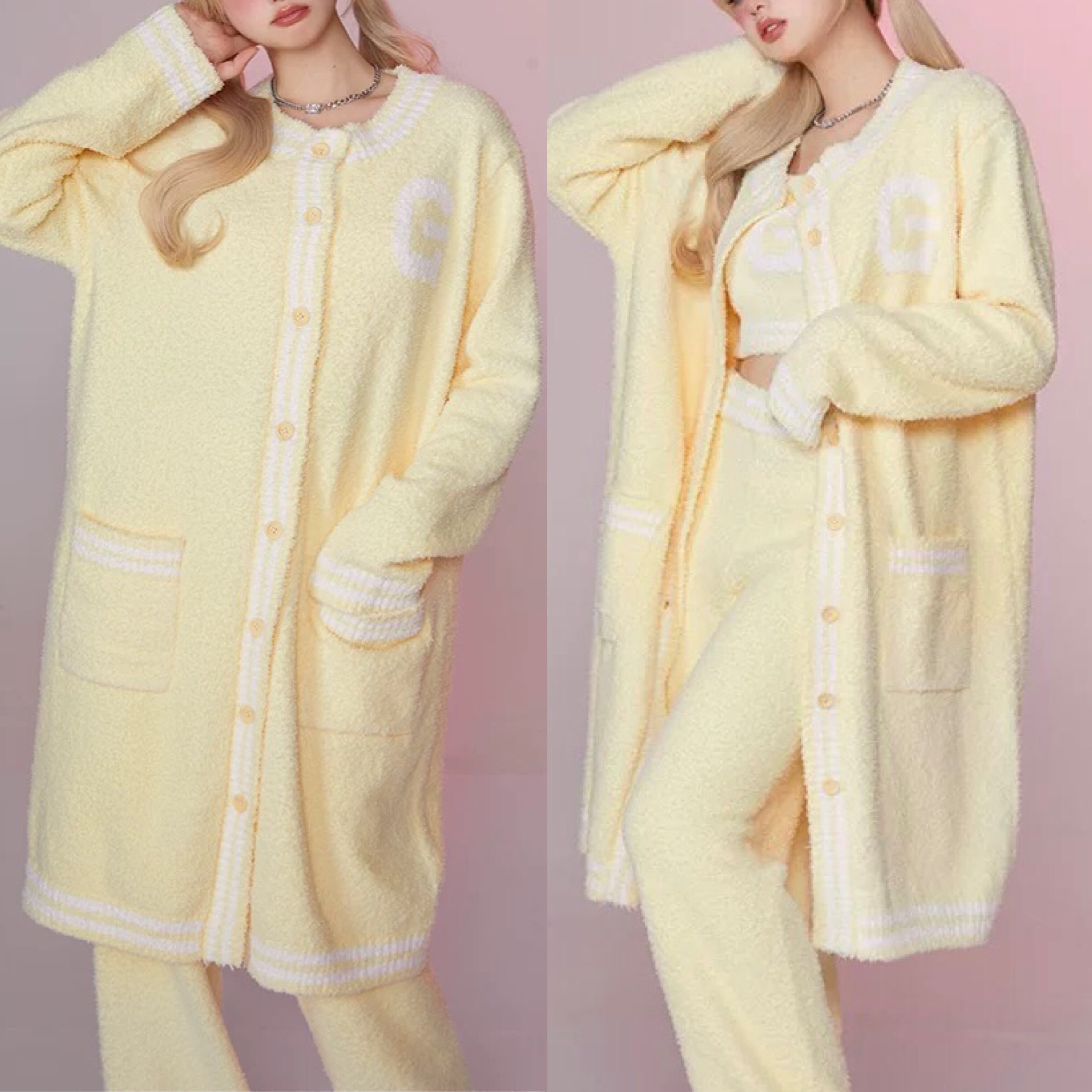 【カーディガン】黄色 スウェット ガーリー ロング アウター カーディガン ワンピース ニット セーター アウター コート カジュアル ルームウェア セーター