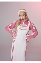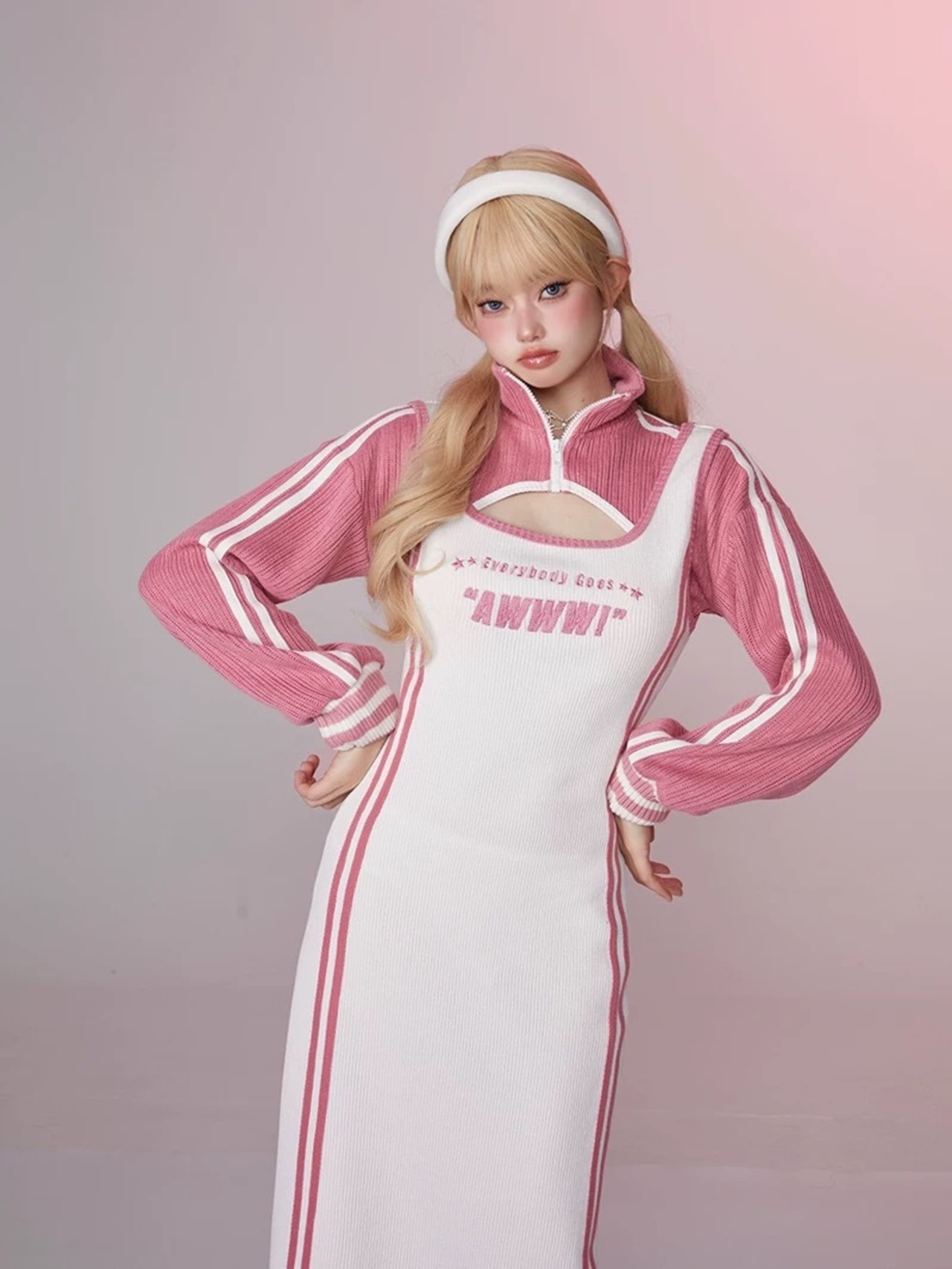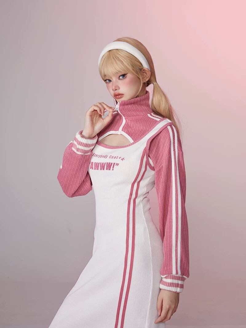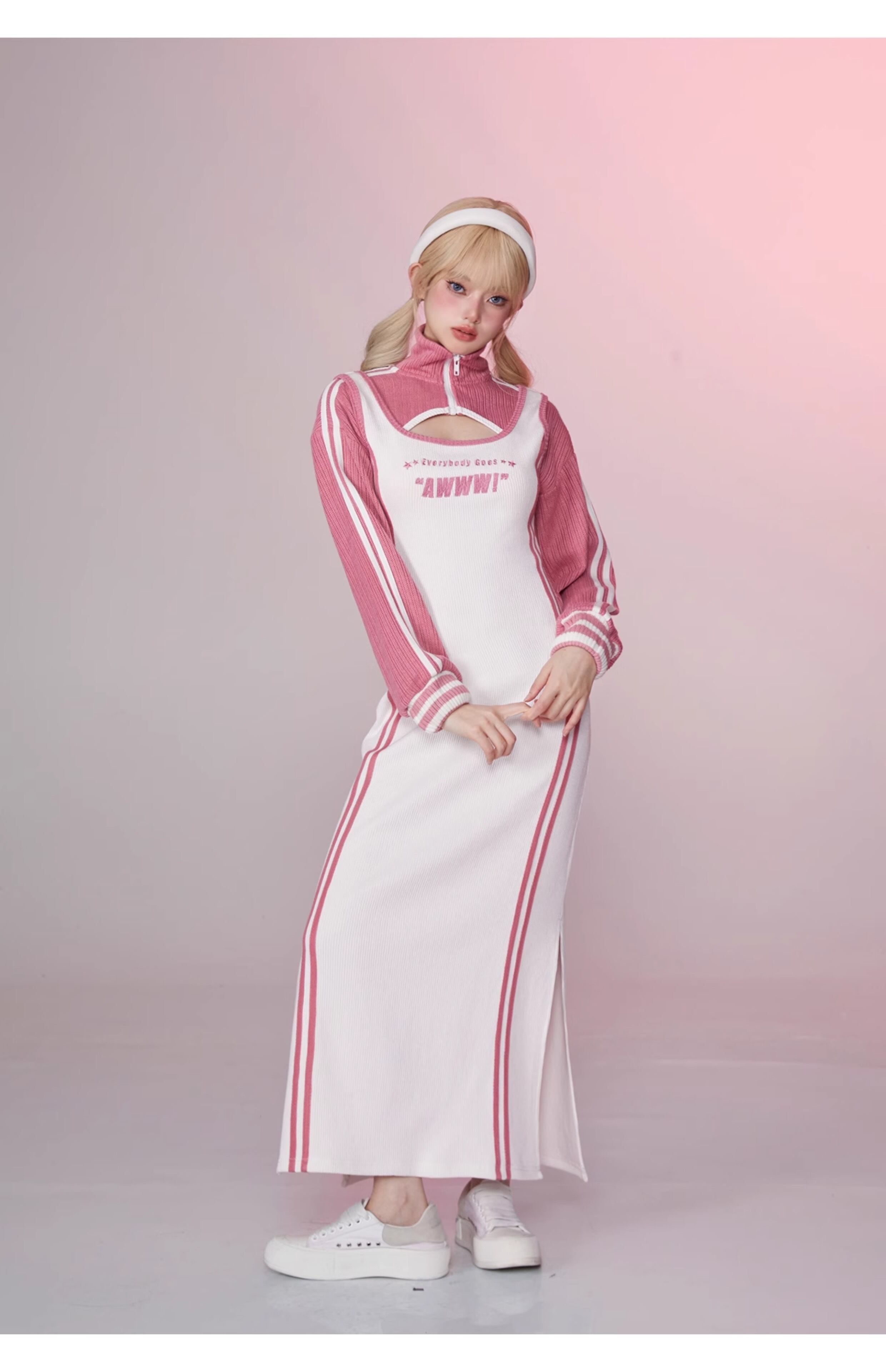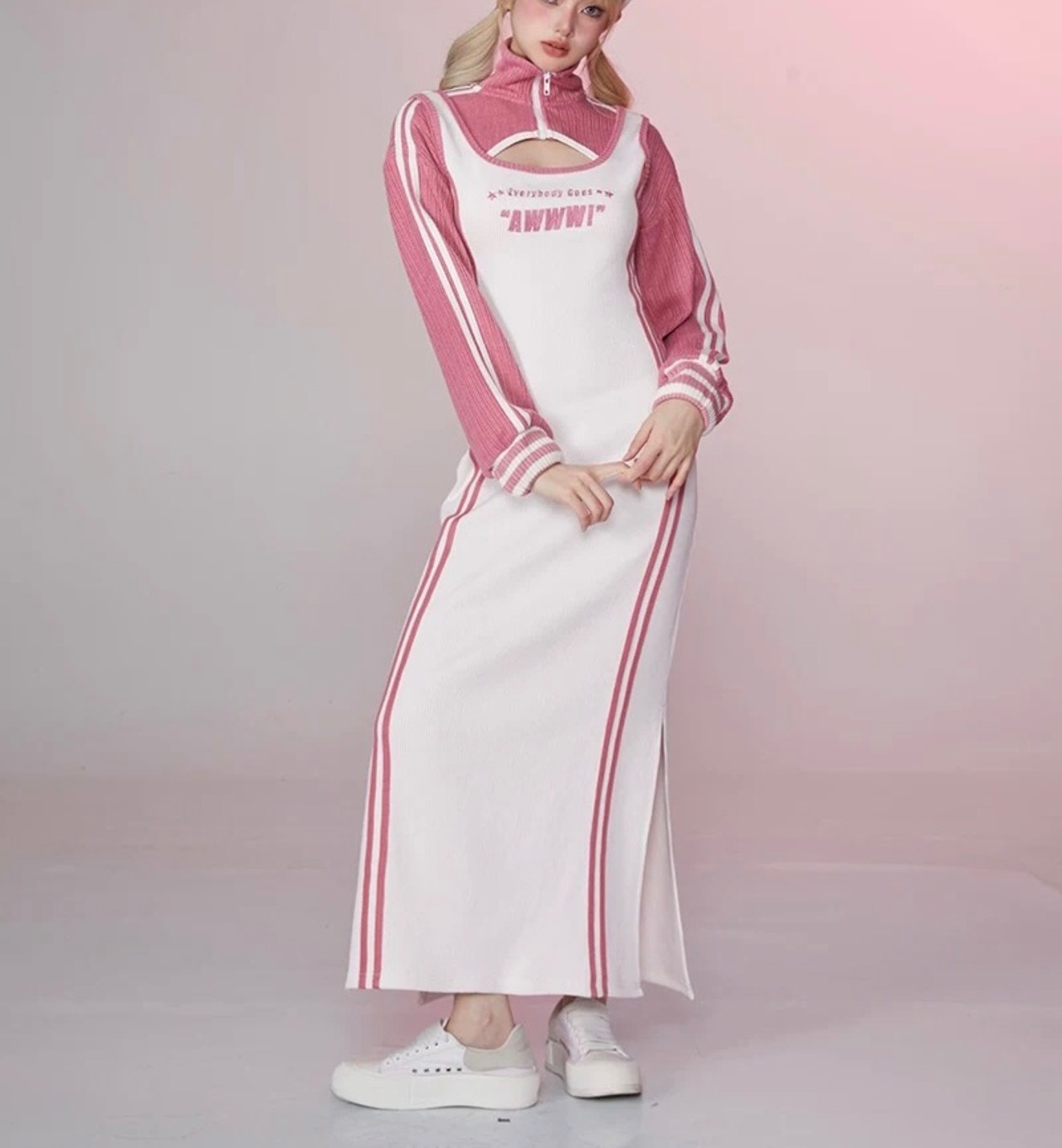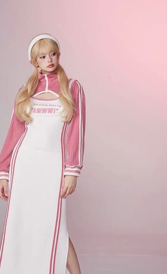 【セット】ピンク スウェット パーカー カジュアル ワンピース ピンク ジャージ ルームウェア トレーナー マキシ スリット ストリート ピンク 白 カジュアル カーディガン