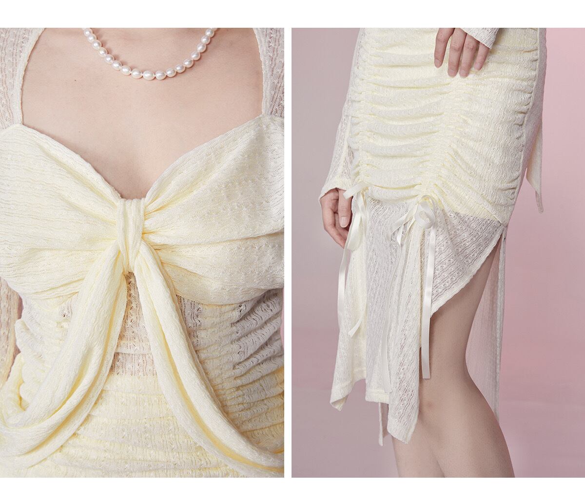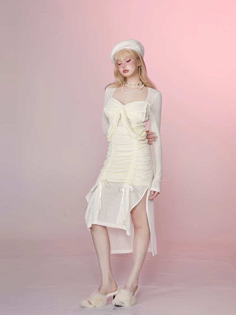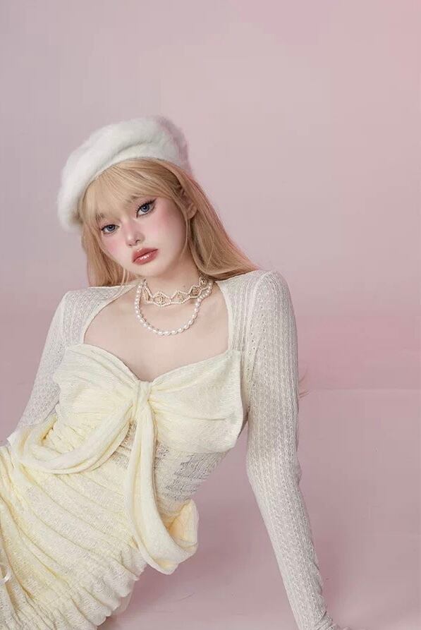黄色 スリット スカート ニット セーター ワンピース ガーリー 可愛い 原宿 リボン シースルー