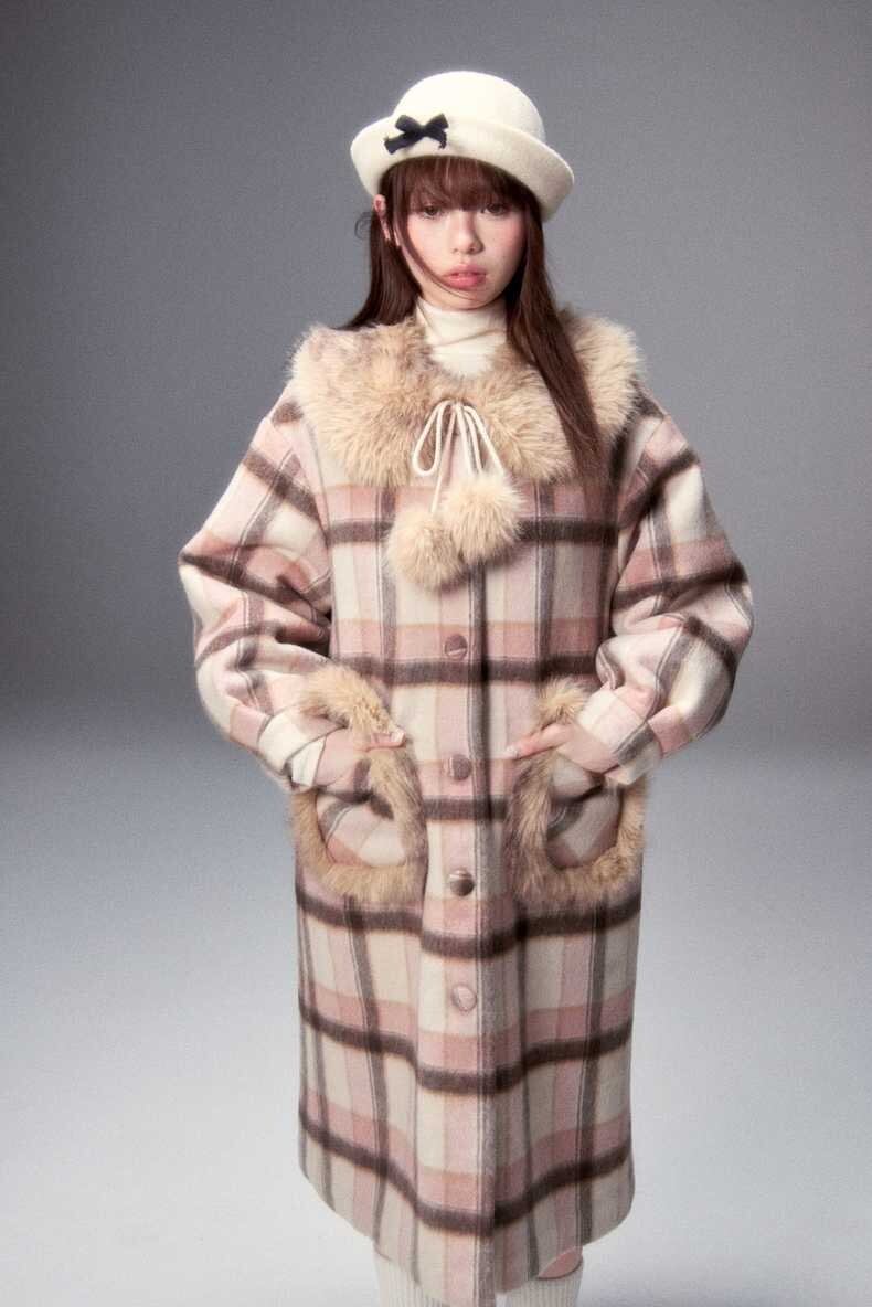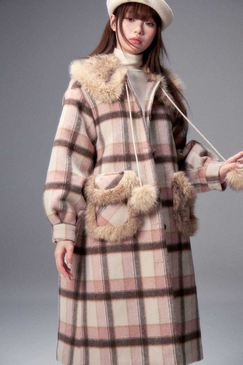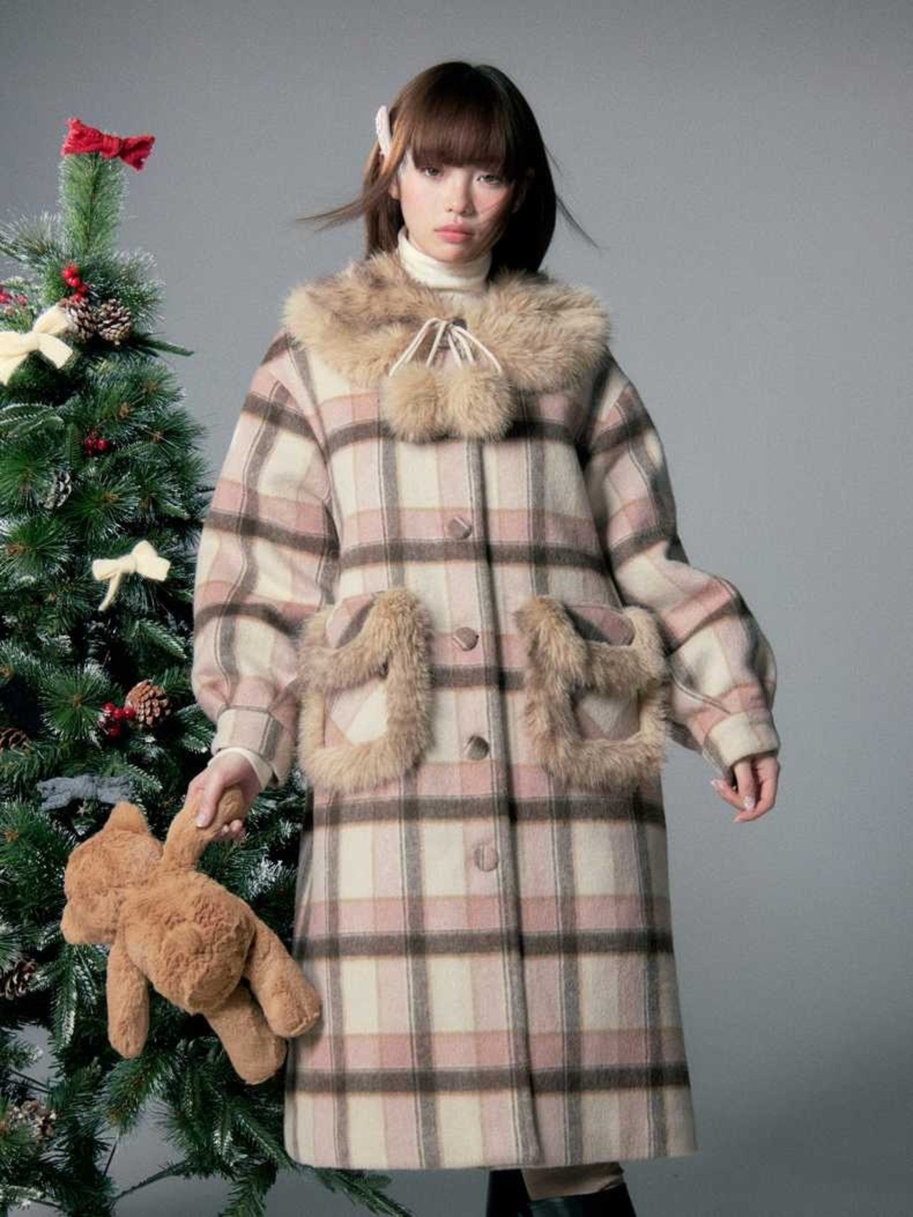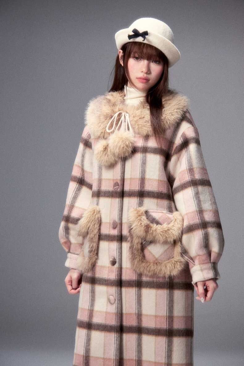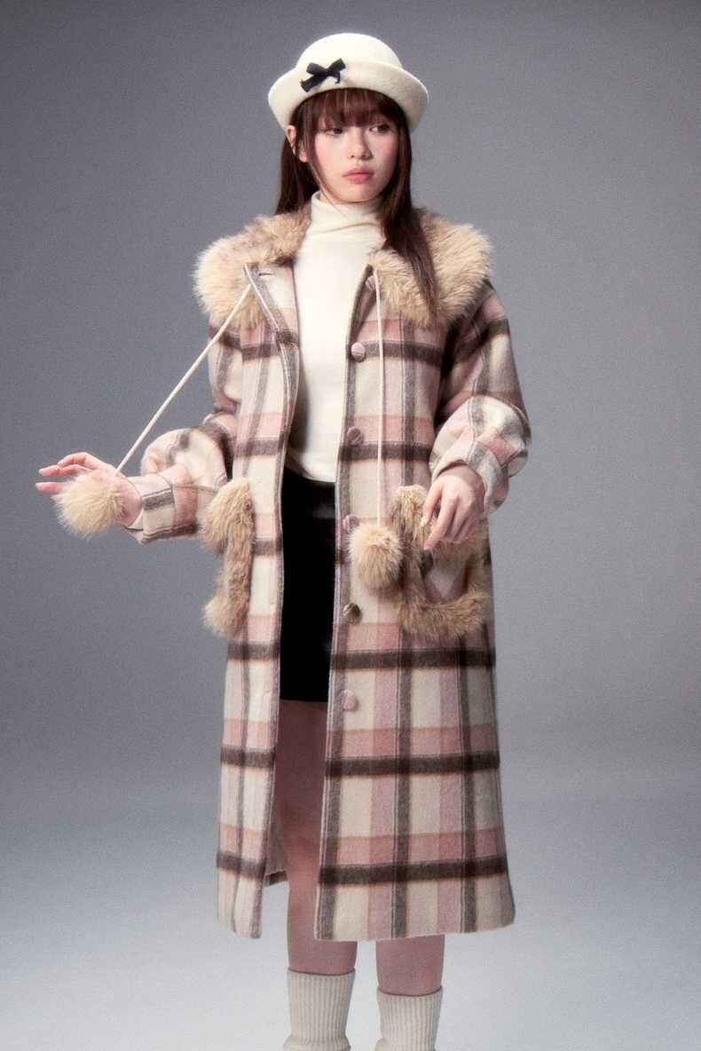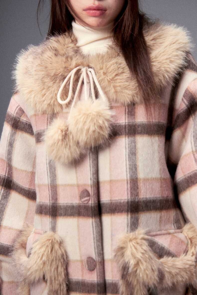 ベージュ 茶色 チェック ガーリー お嬢様 ワンピース コート アウター ファー リボン パーカー フード 可愛い コート アウター ジャケット ブルゾン カーディガン ぽんぽん リボン