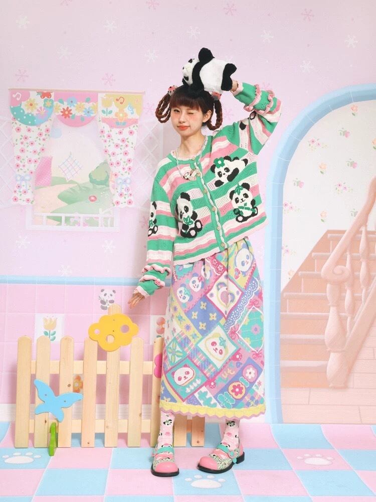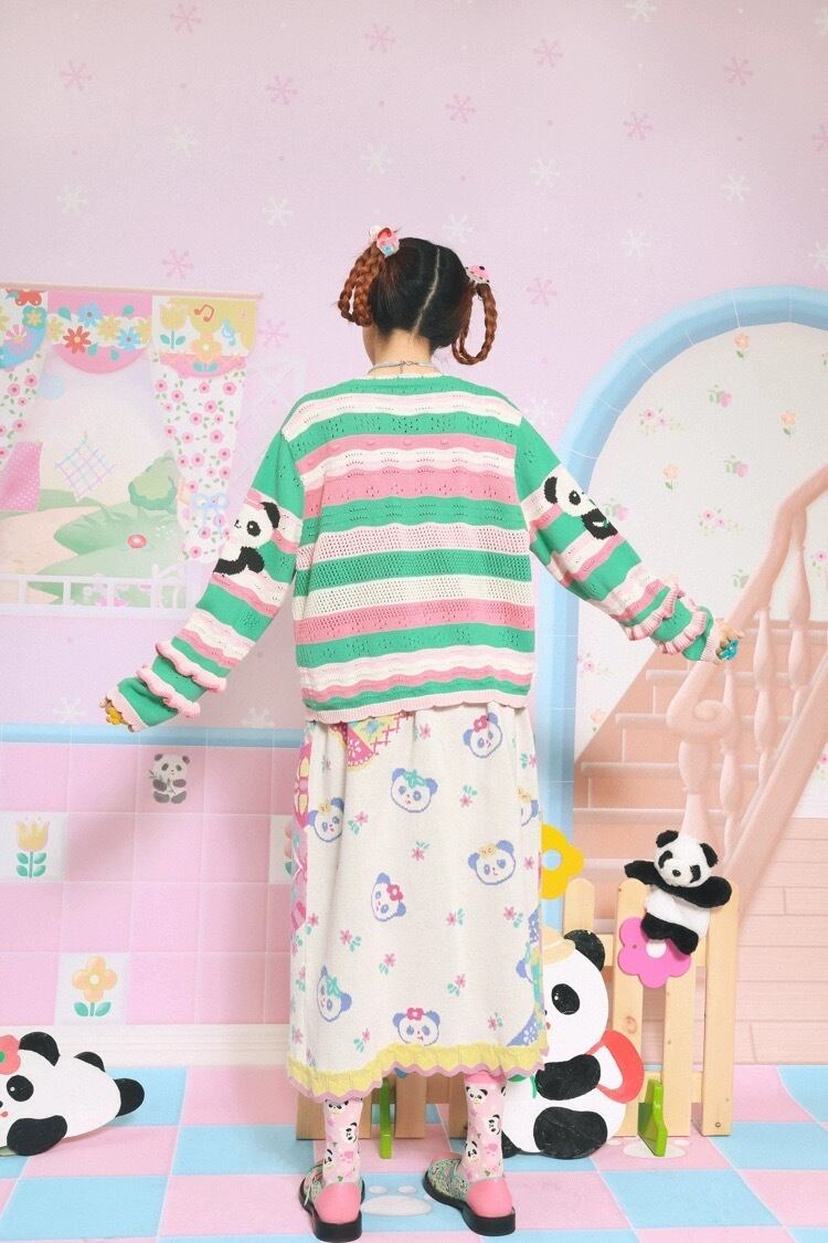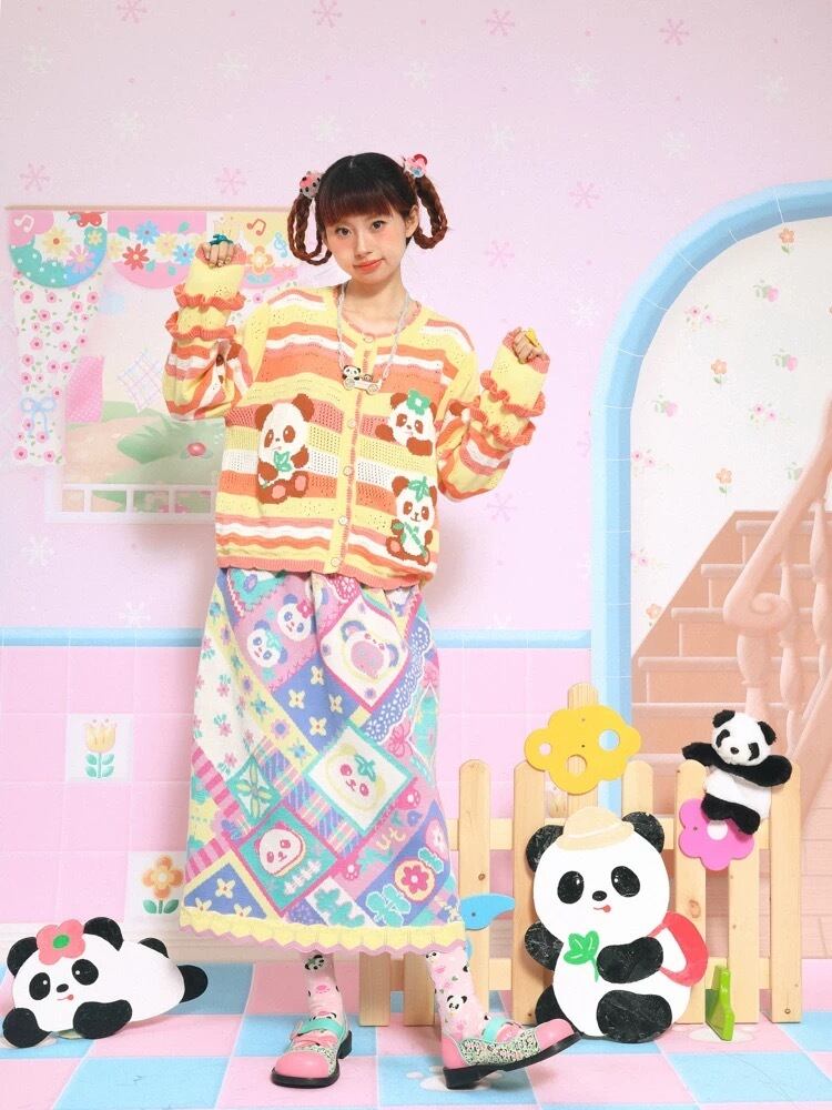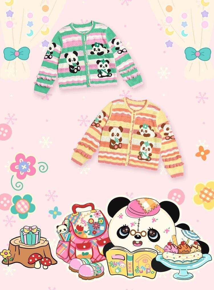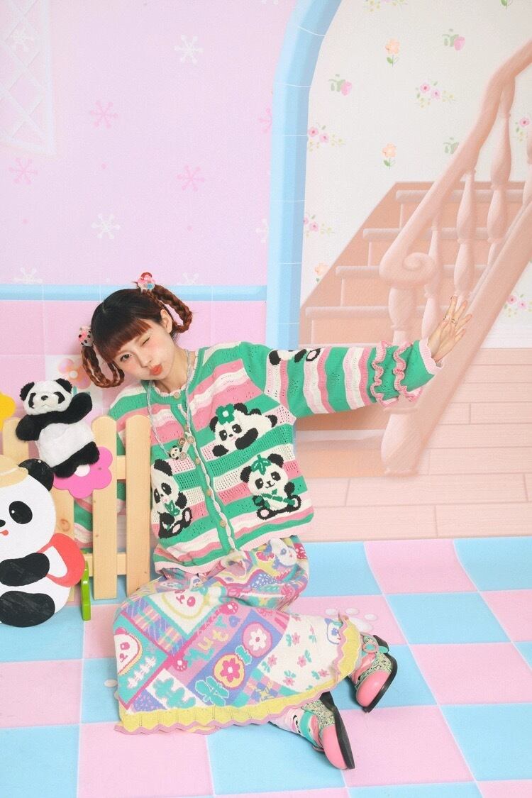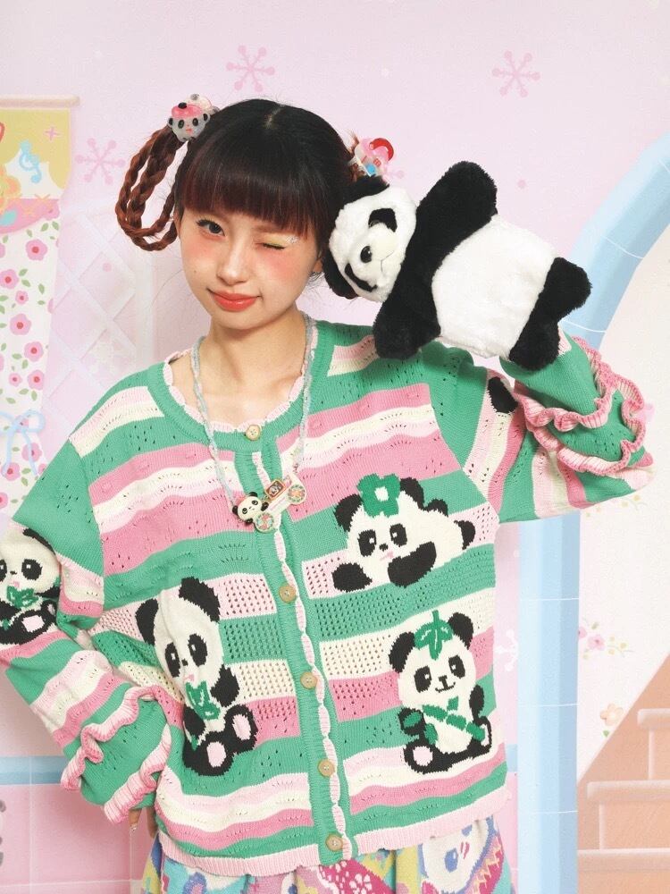 カーディガン チェック 黄色 緑 オレンジ パンダ アニマル ガーリー 古着 原宿 姫 可愛い ボーダー ピンク