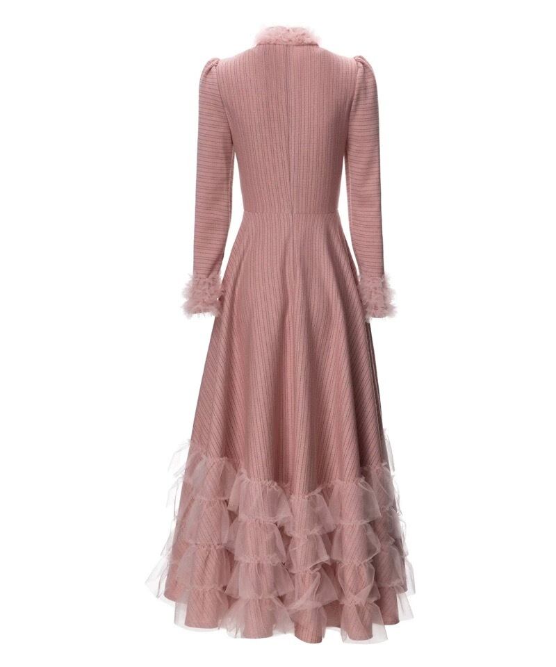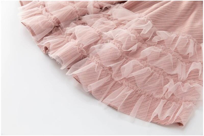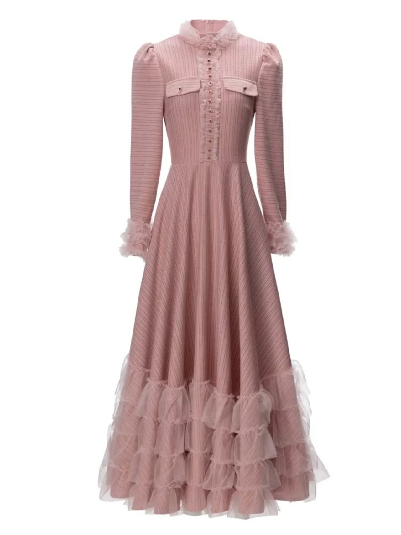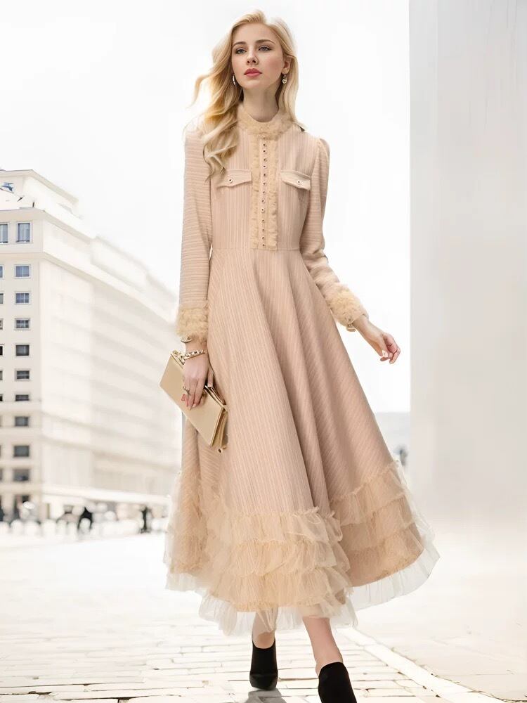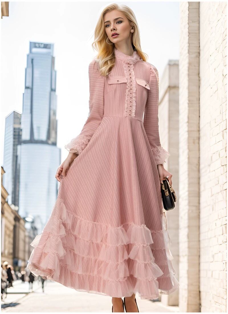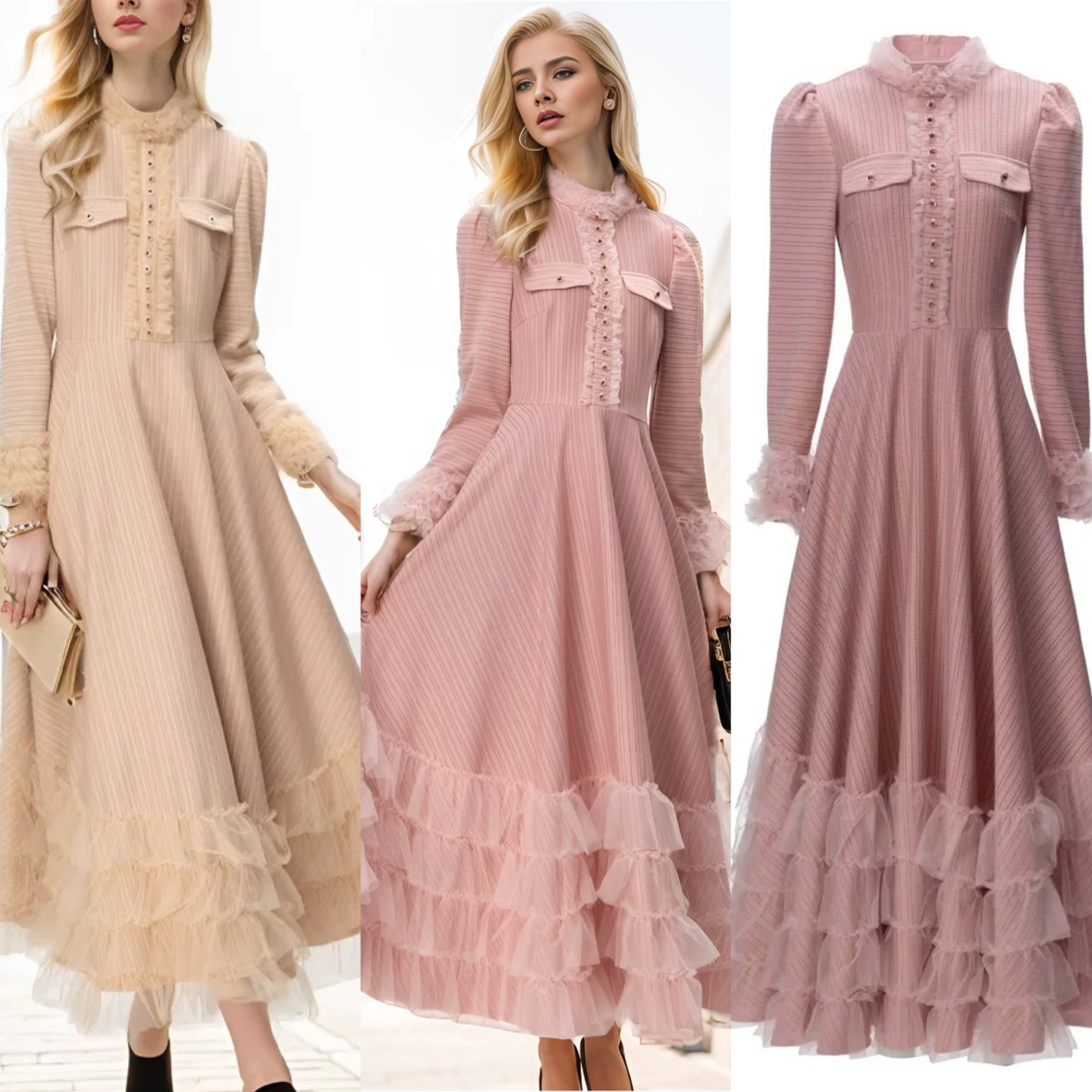 XL ピンク ベージュ エレガント フリル ガーリー マキシ ロング ブラウス スカート エレガント ドレス リボン チェック マキシ
