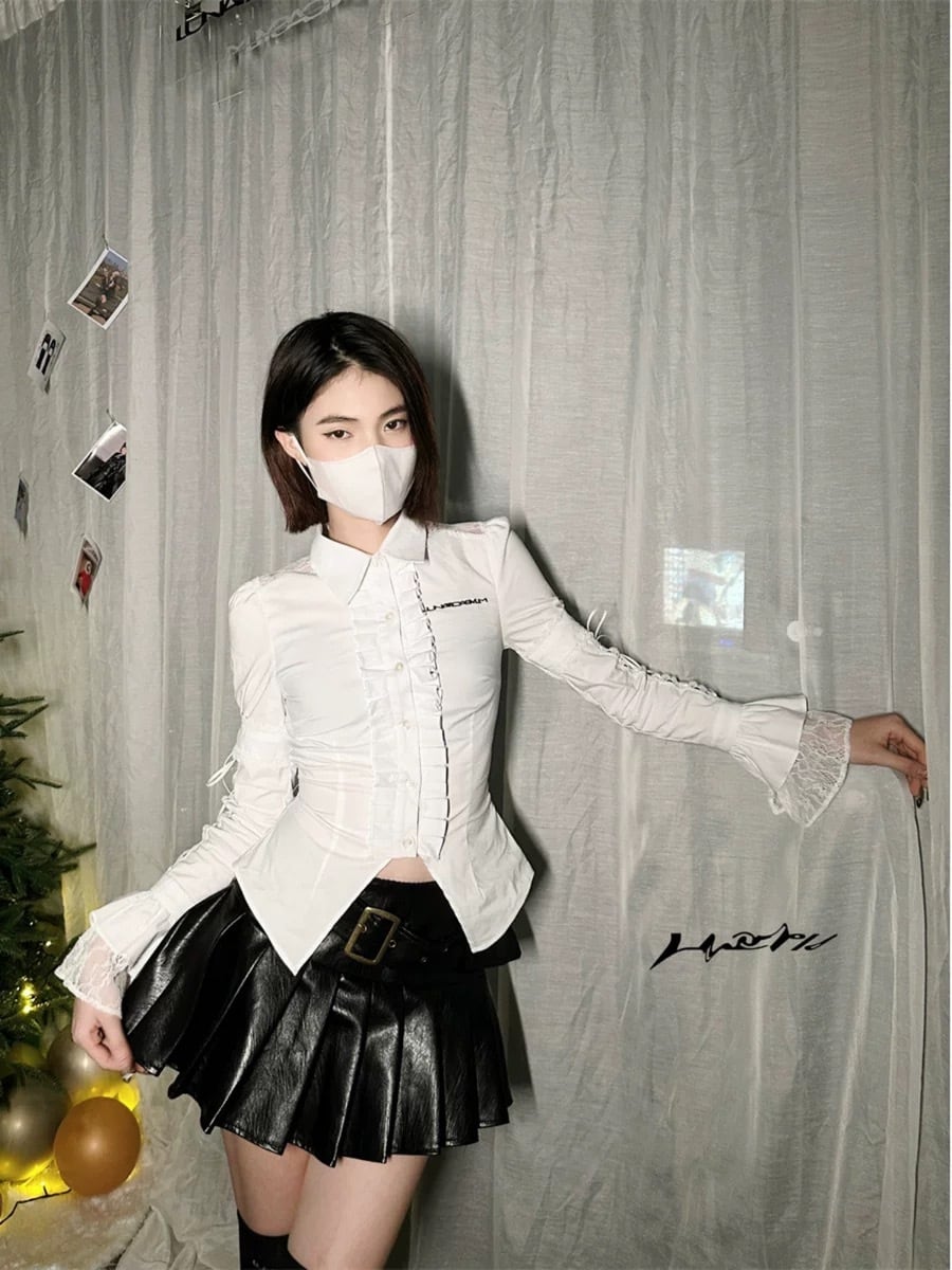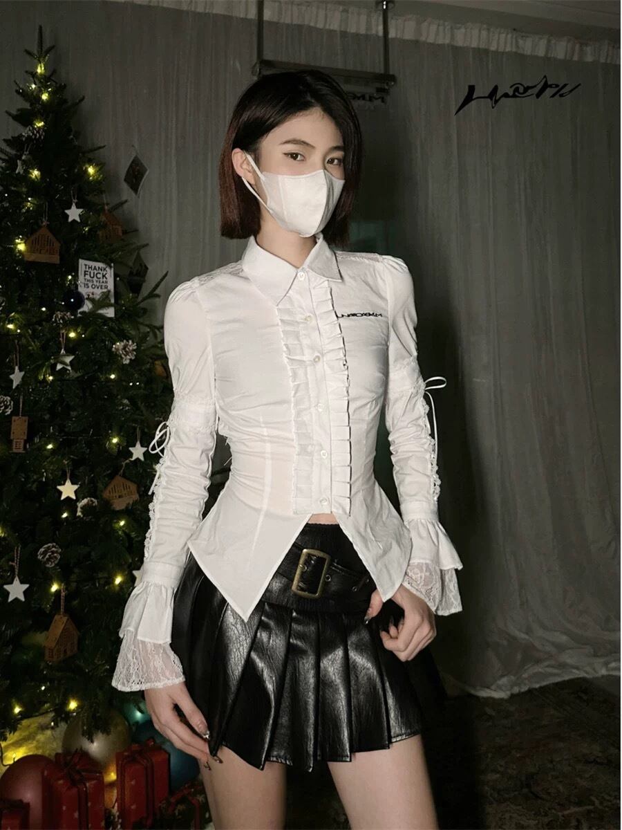 白 リボン ホワイト ブラウス ロック シンプル トップス シャツ あみあげ モード パンク ストリート Y2K ダンス