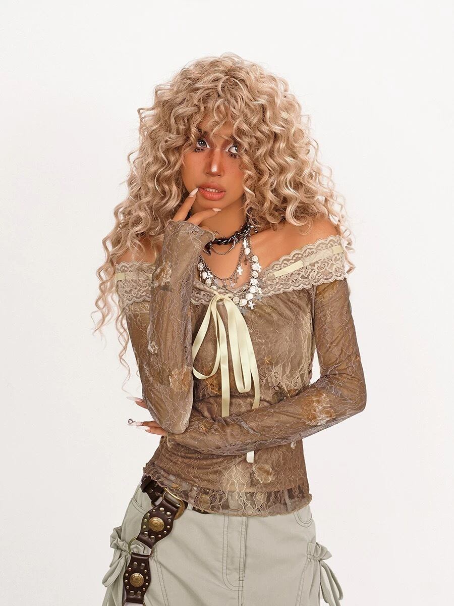 トップス ベージュ リボン レース ストリート セクシー ダンス クラブ 渋谷 オフショルダー リボン ブラウス セーター Tシャツ