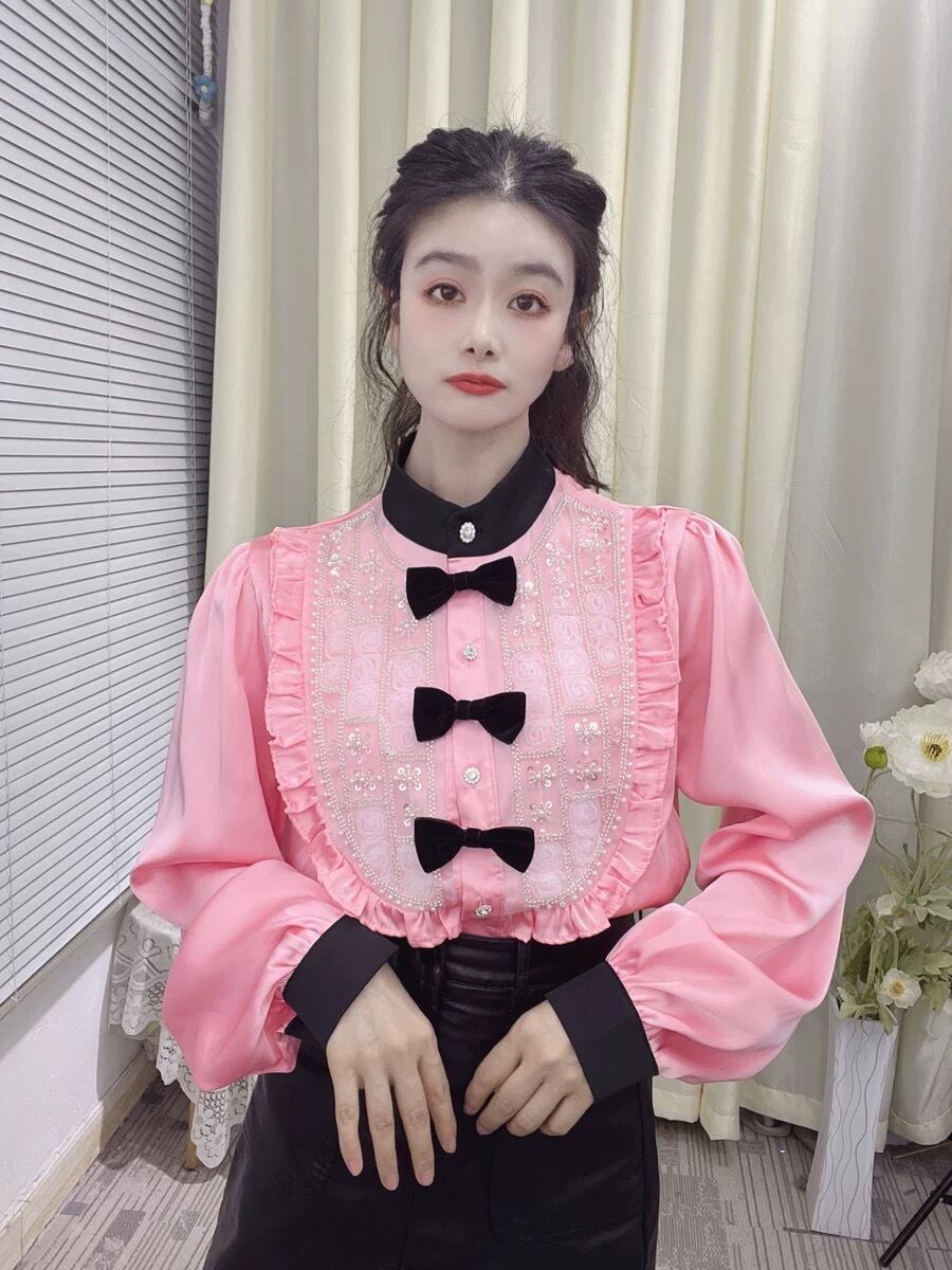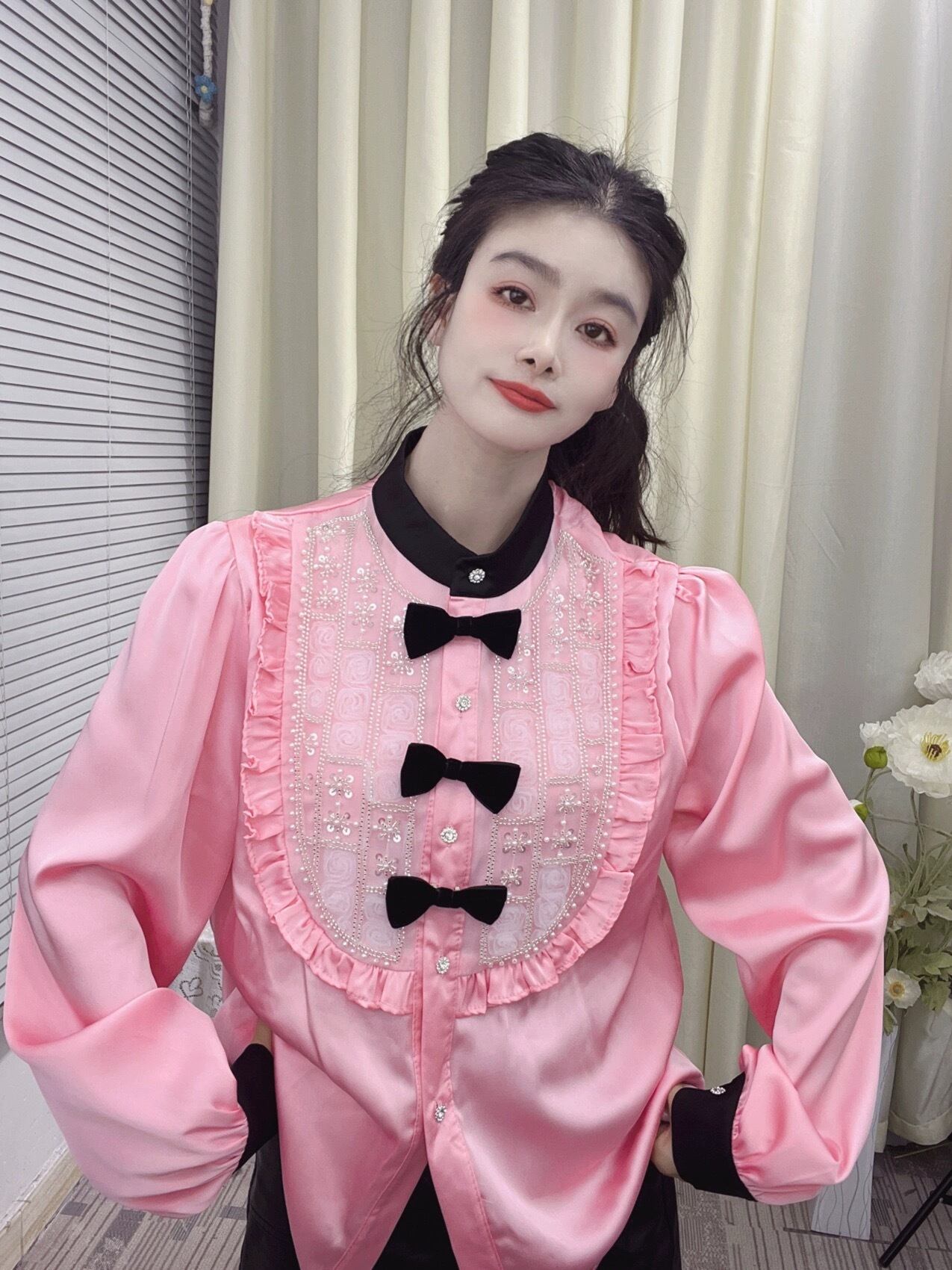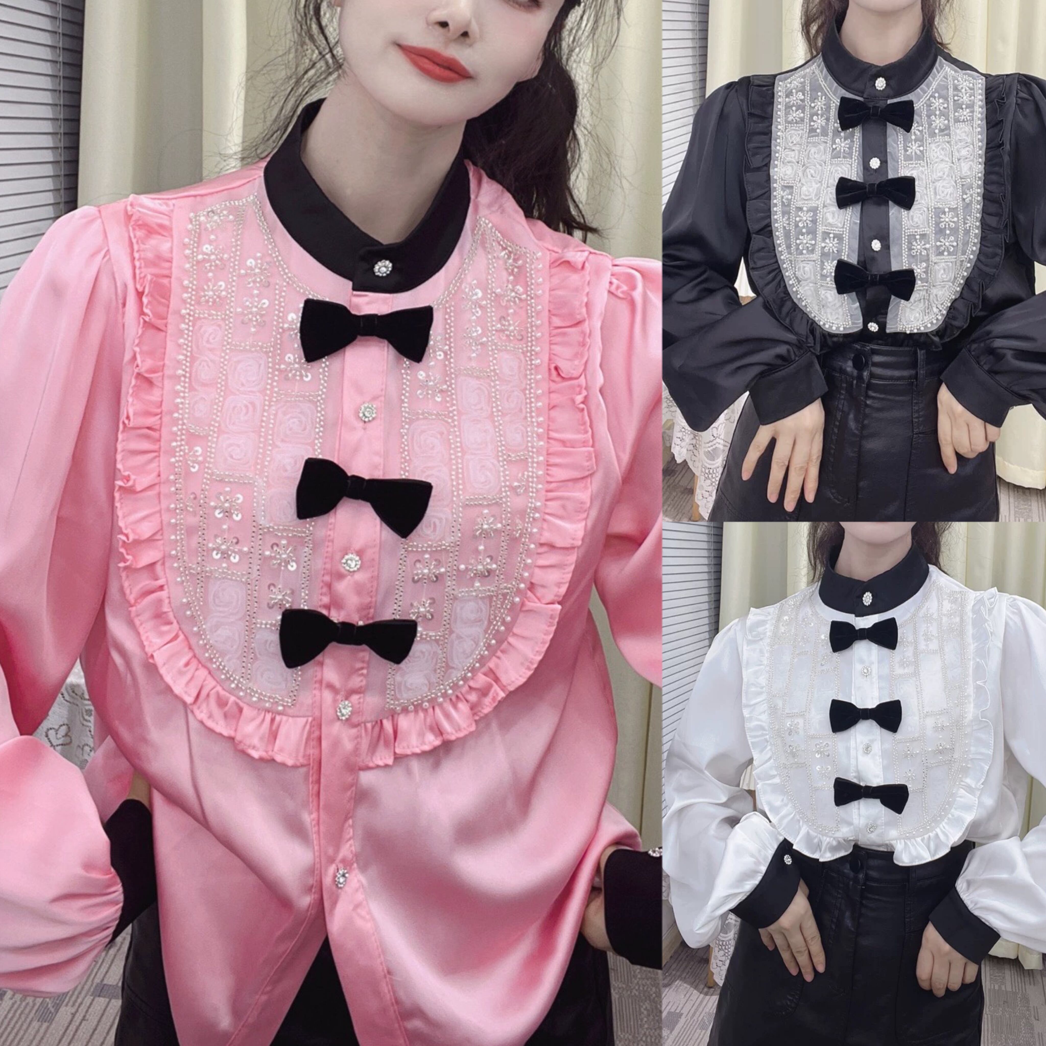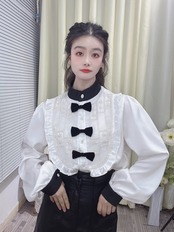 ピンク 黒 ホワイト 白 リボン シャツ ブラウス ガーリー お嬢様 トップス レース エレガント