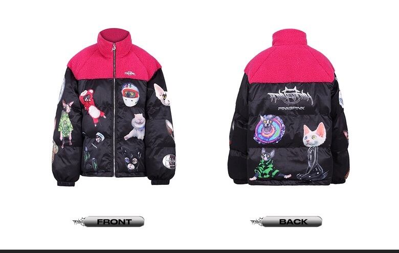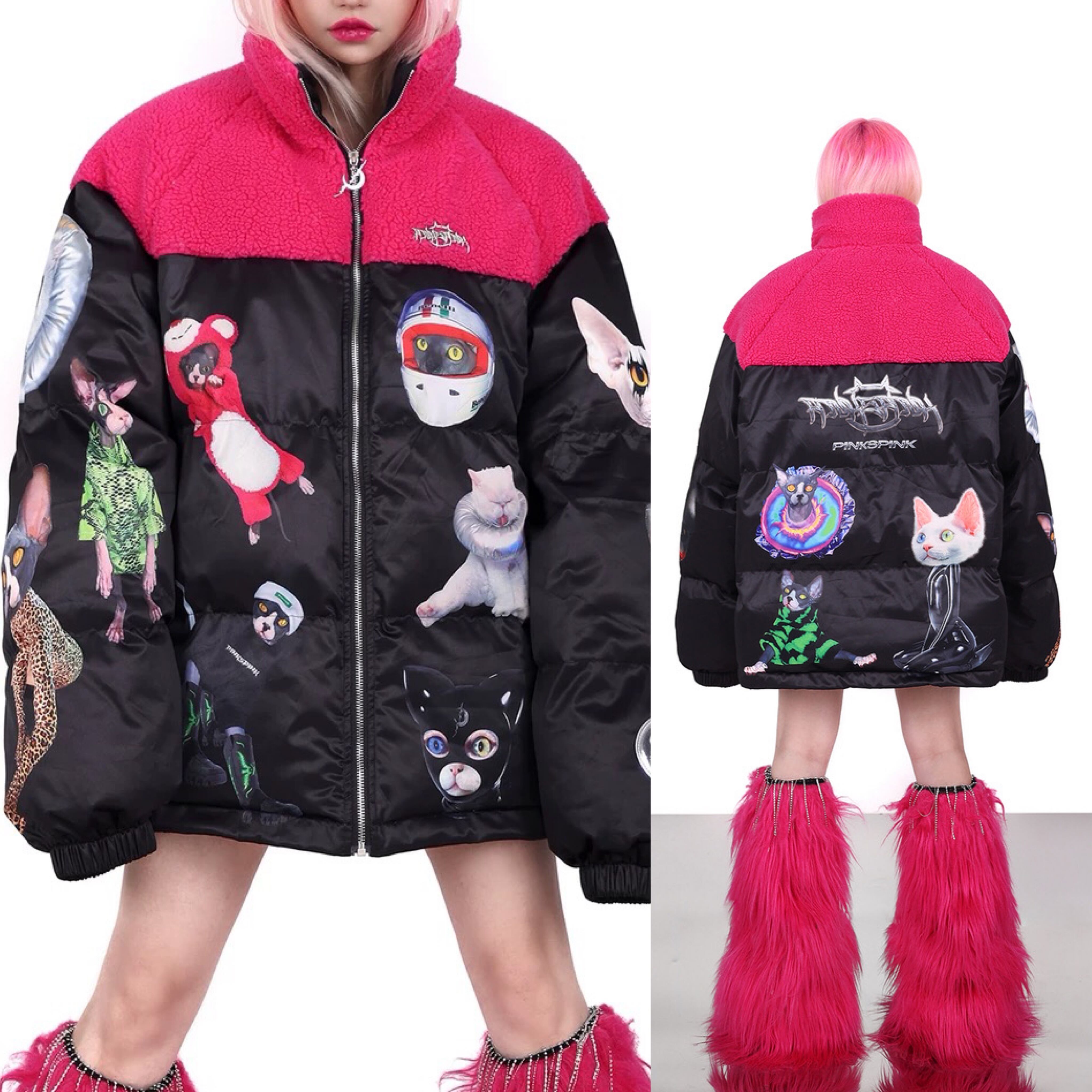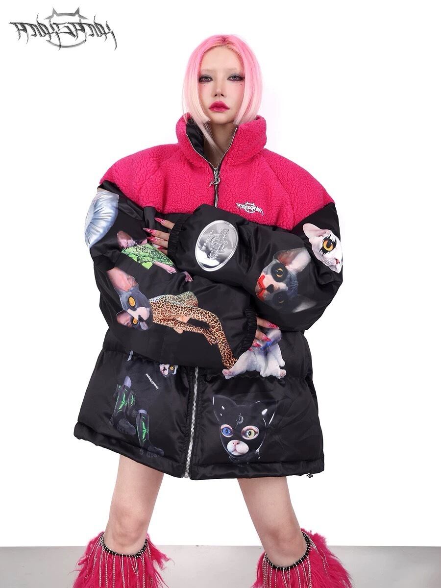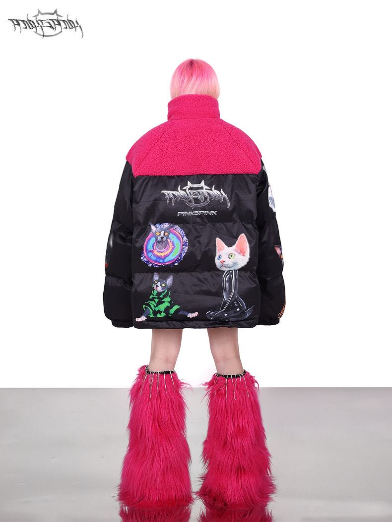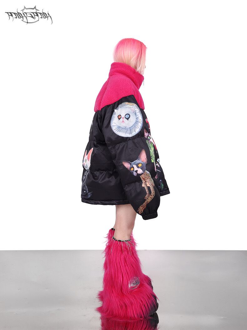 ダウンコート ストリート アウター ジャケット 黒 ピンク フリース コート カーディガン ブルゾン ねこ キャット アニマル ストリート