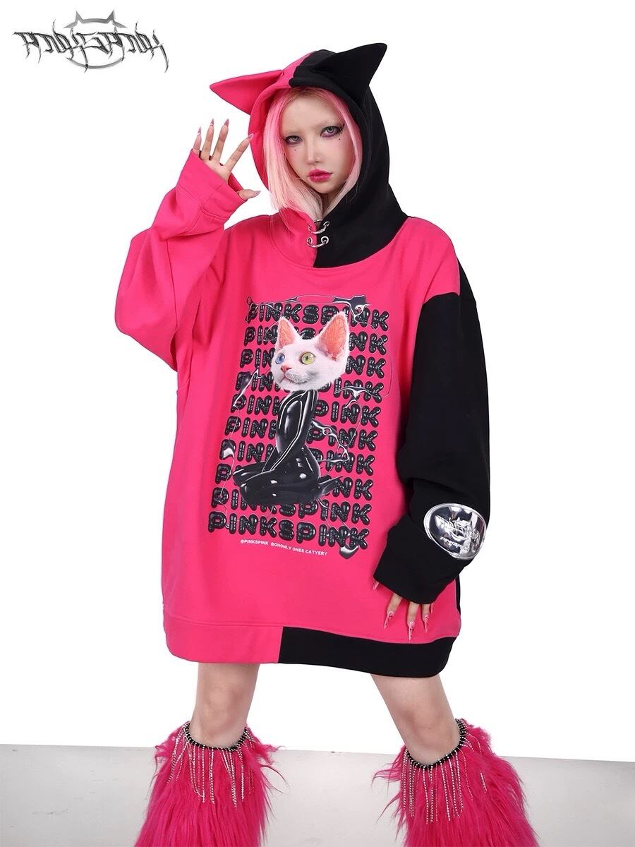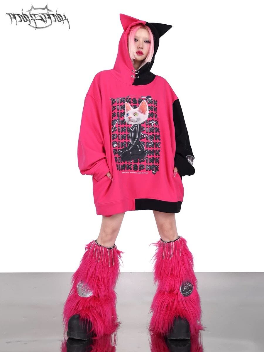パーカー トレーナー スウェット ダウンコート ストリート アウター ジャケット 黒 ピンク フリース コート カーディガン ブルゾン ねこ キャット アニマル ストリート バイカラー ねこみみ