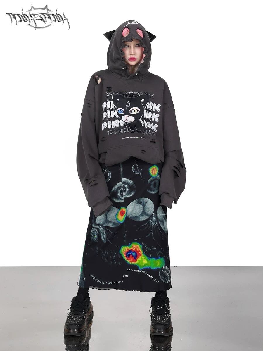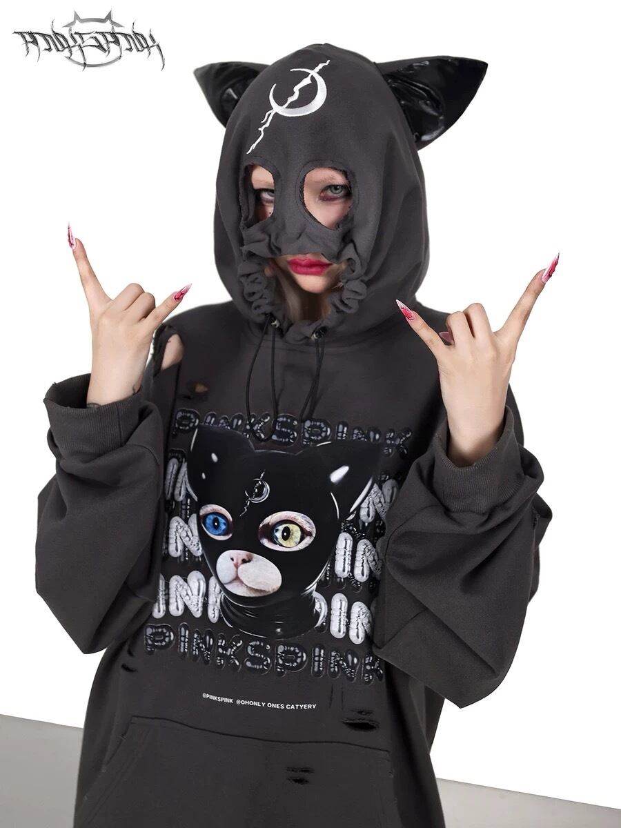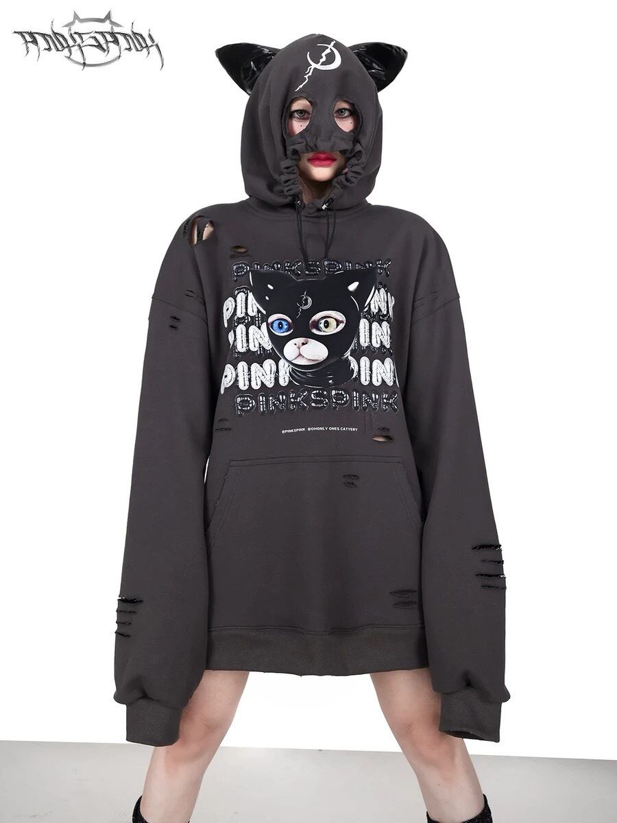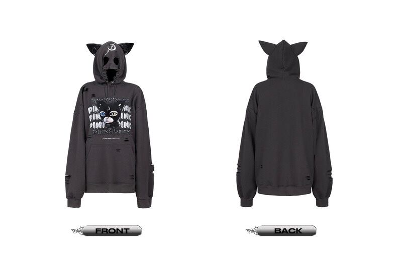 グレー パーカー ワンピース カジュアル パーカー トレーナー スウェット ダウンコート ストリート アウター ジャケット 黒 ピンク フリース コート カーディガン ブルゾン ねこ キャット アニマル ストリート バイカラー ねこみみ マスク