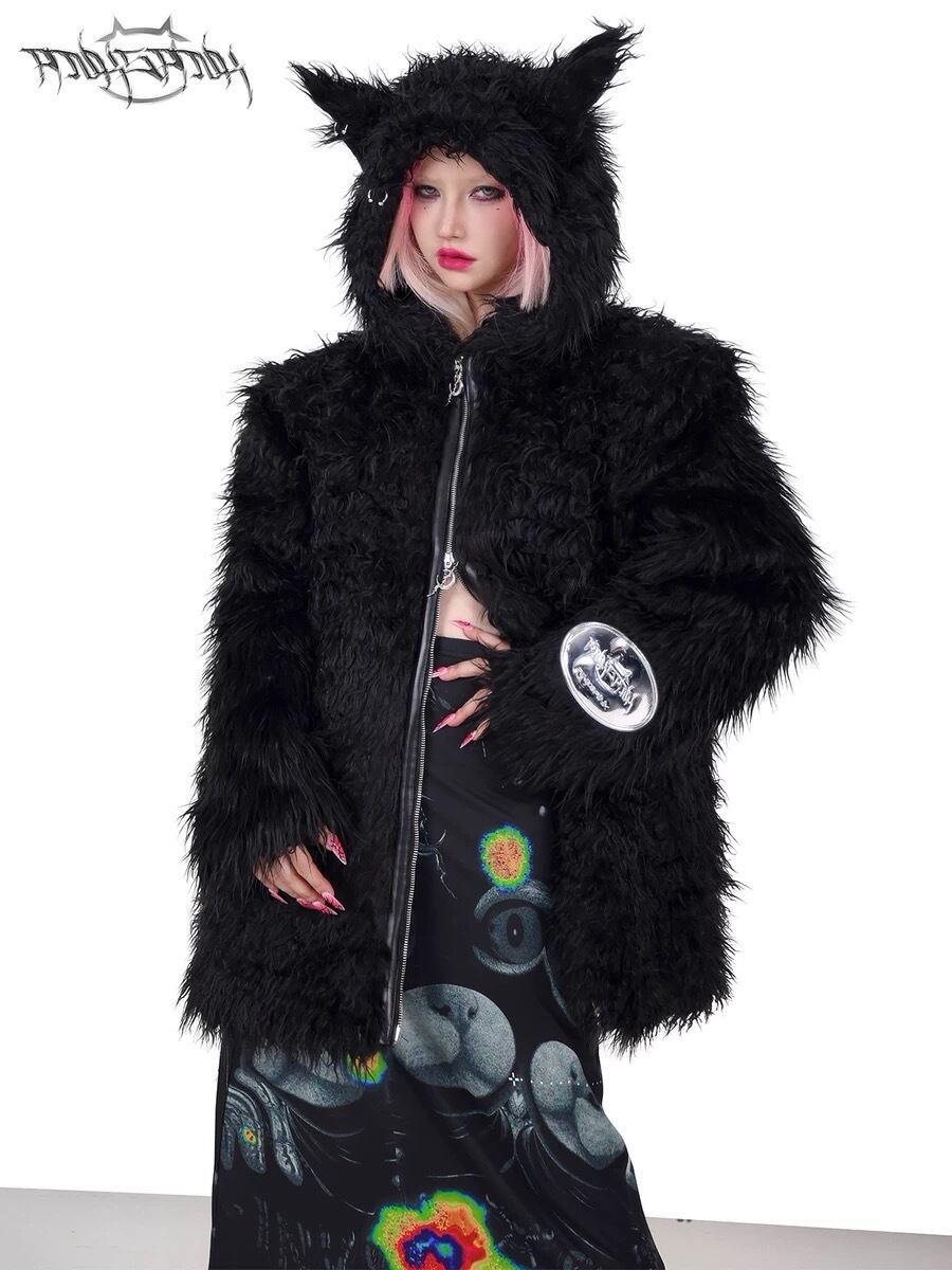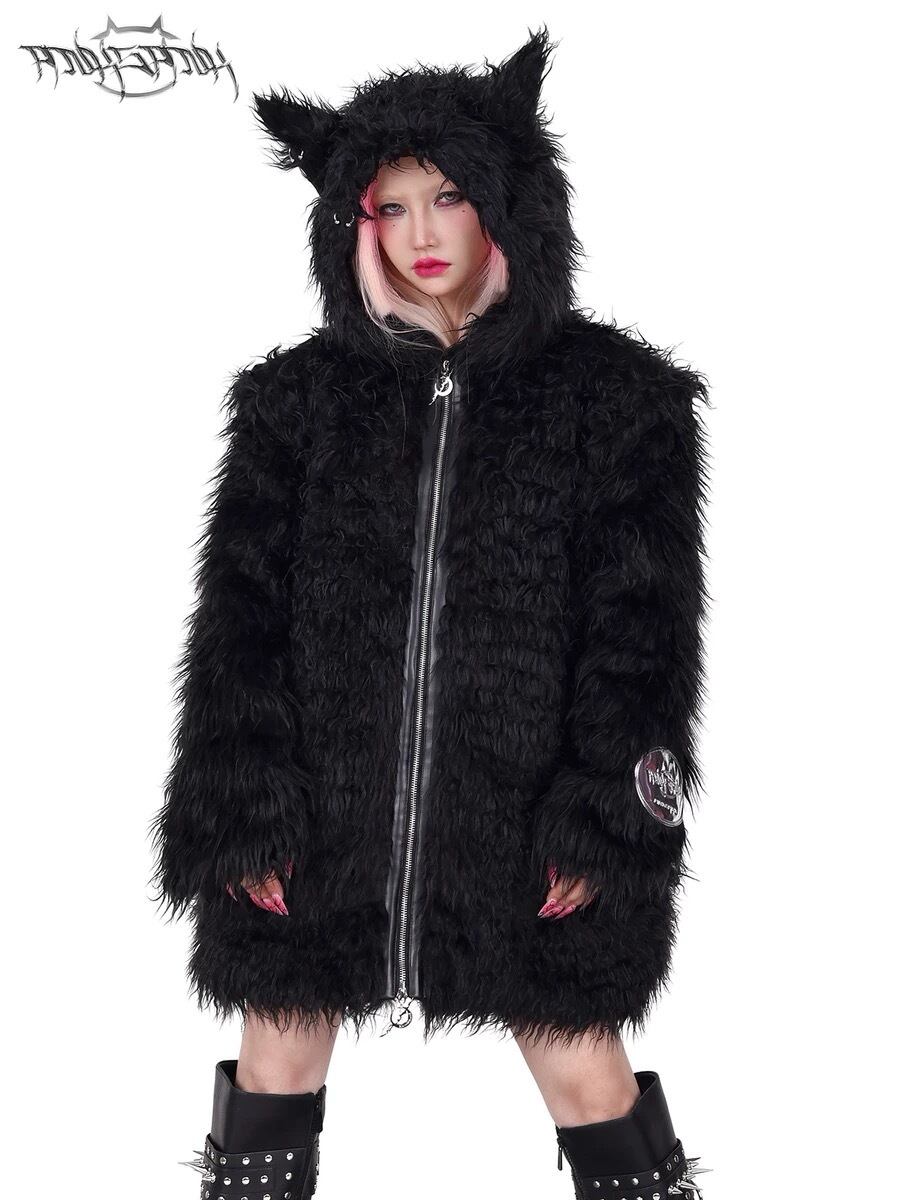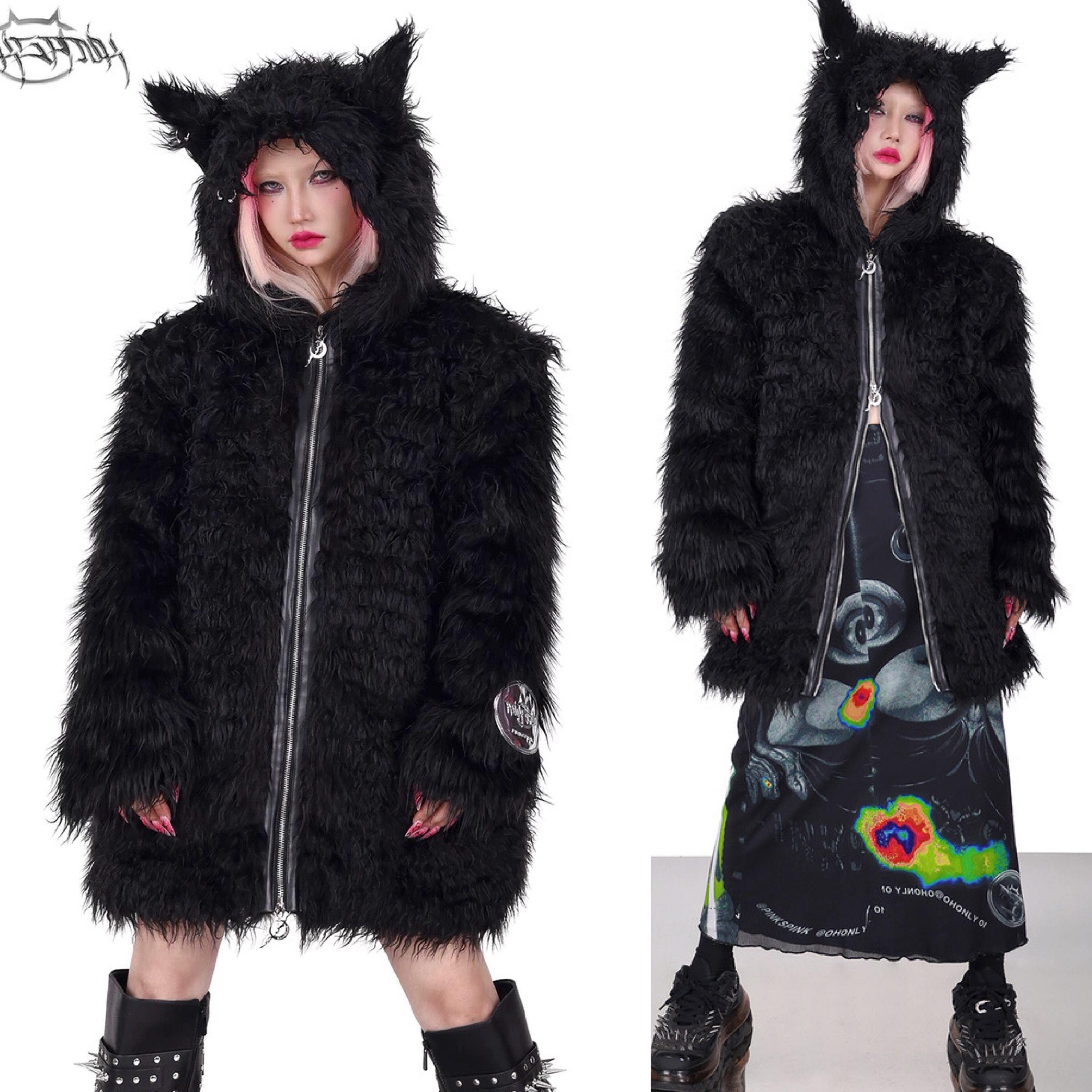 黒 ブラック ファー コート パーカー パーカー トレーナー スウェット ダウンコート ストリート アウター ジャケット 黒 ピンク フリース コート カーディガン ブルゾン ねこ キャット アニマル ストリート バイカラー ねこみみ