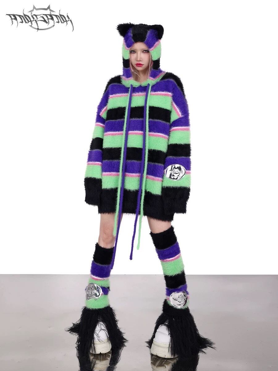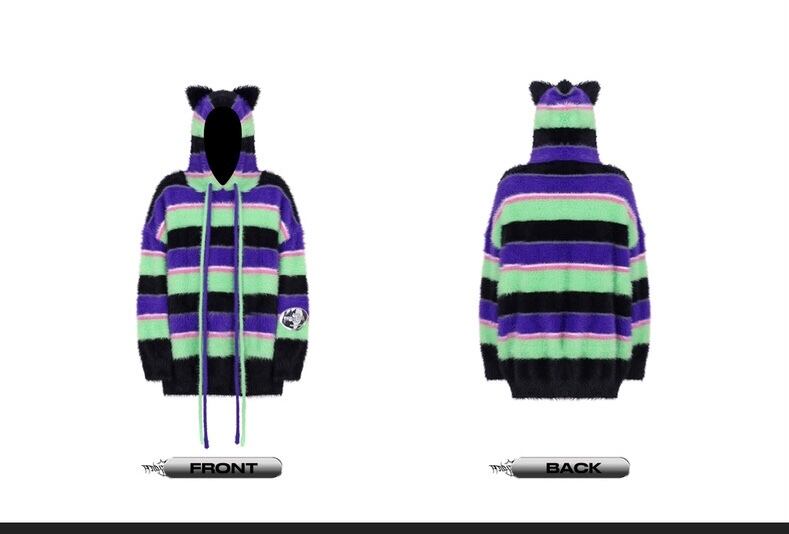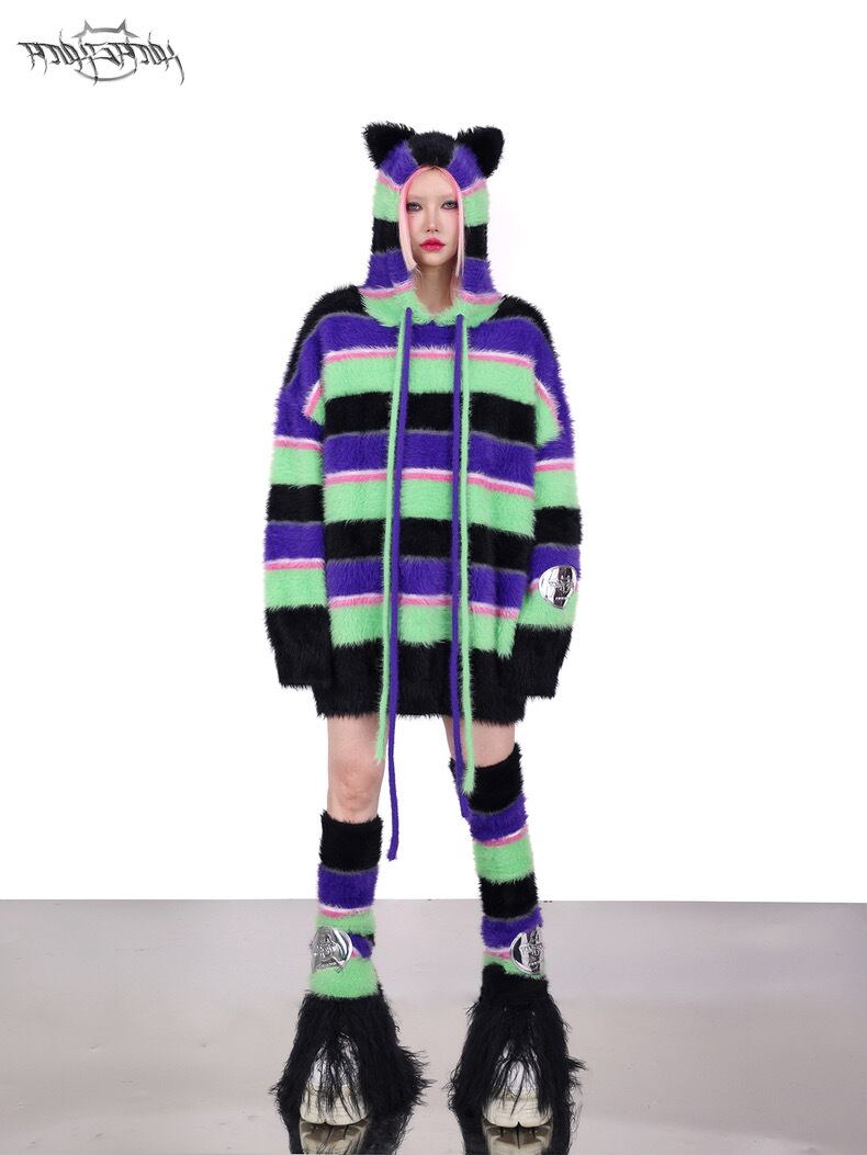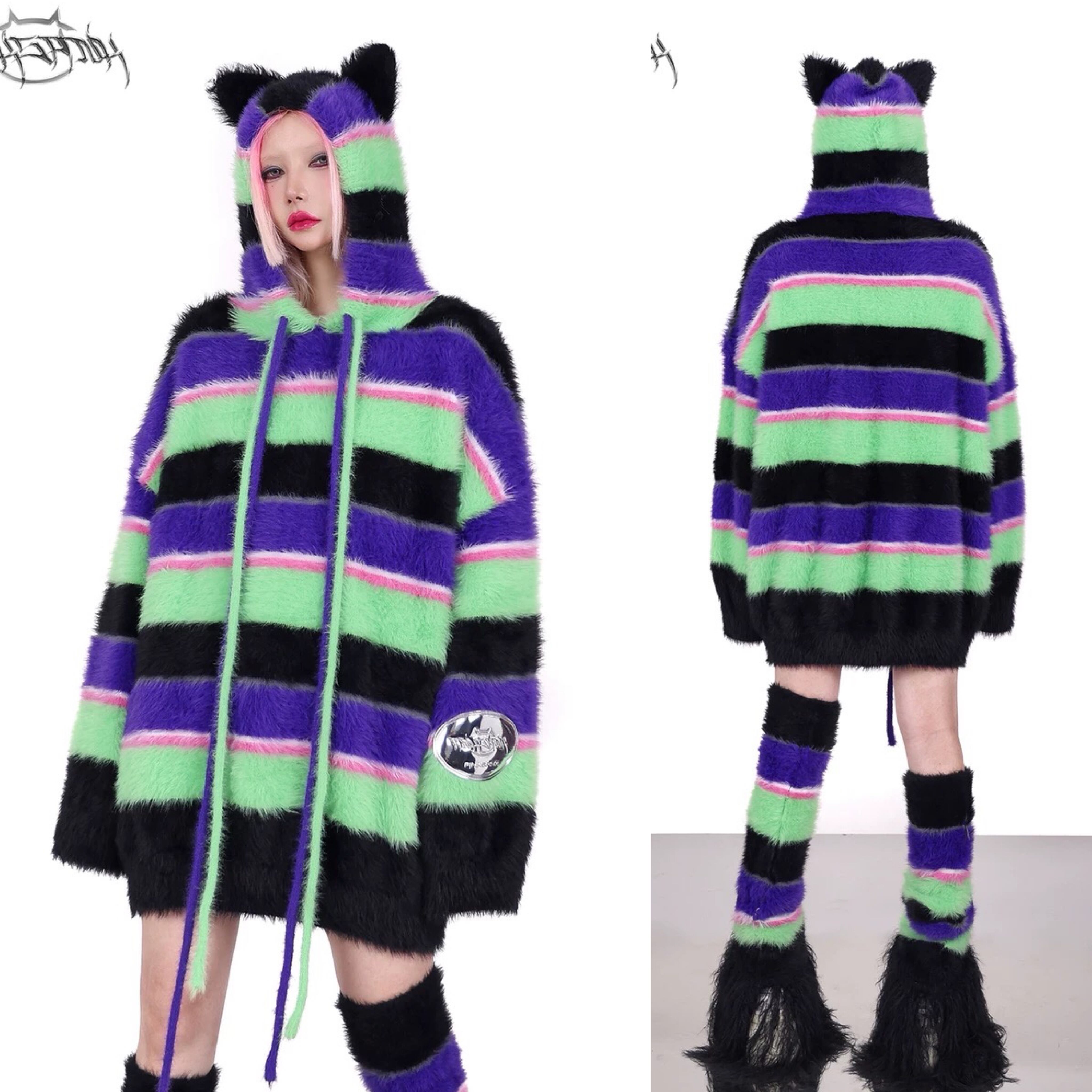 フリース ボーダー 水色 紫 パーカー トレーナー スウェット ダウンコート ストリート アウター ジャケット 黒 ピンク フリース コート カーディガン ブルゾン ねこ キャット アニマル ストリート バイカラー ねこみみ