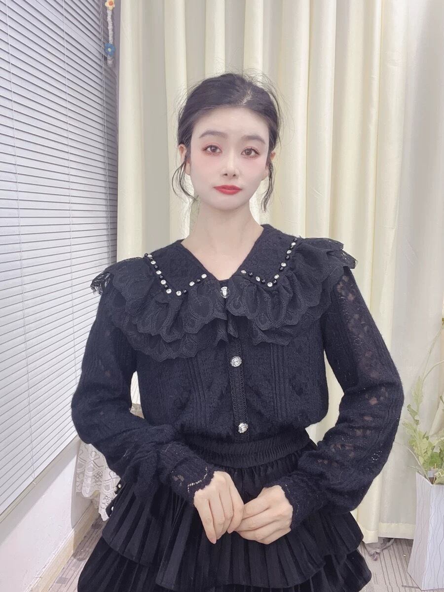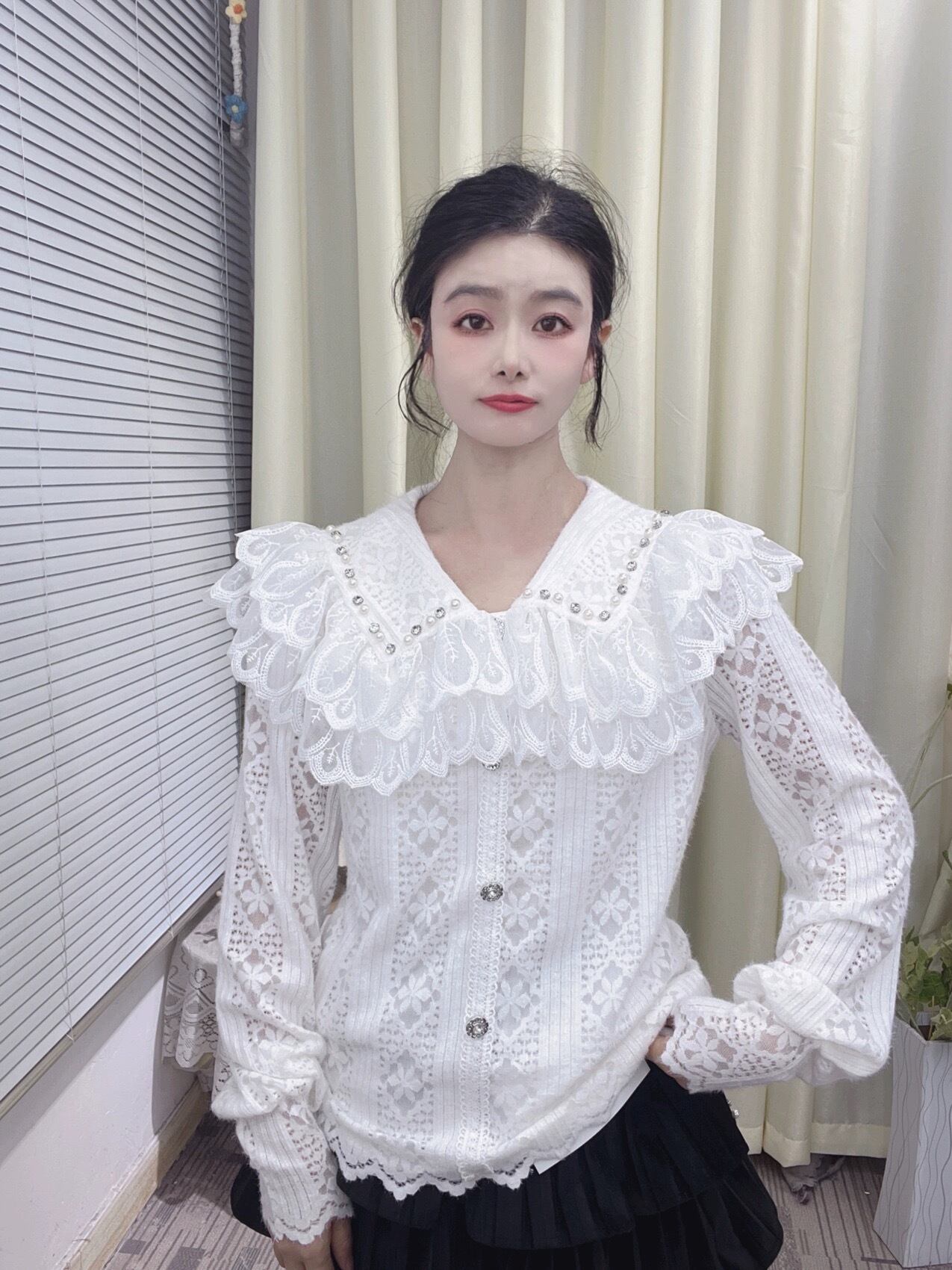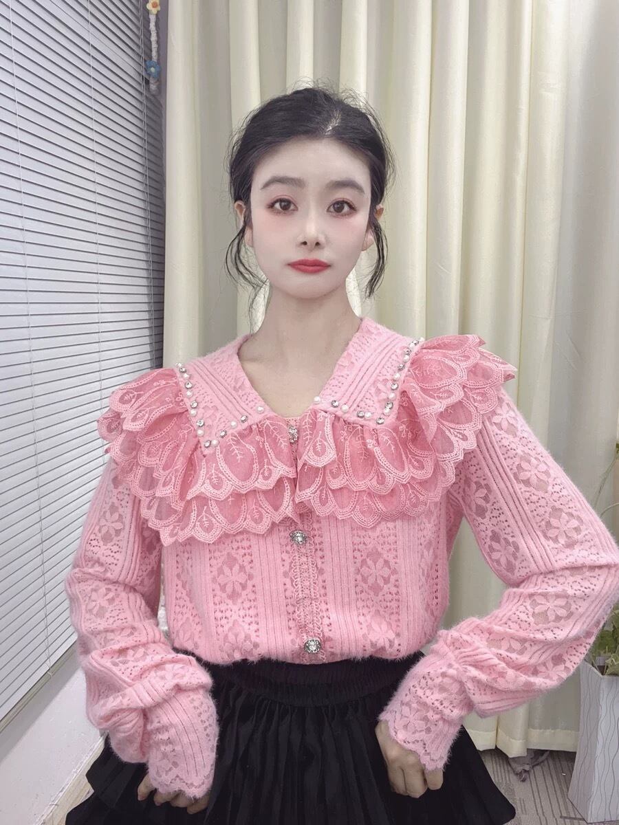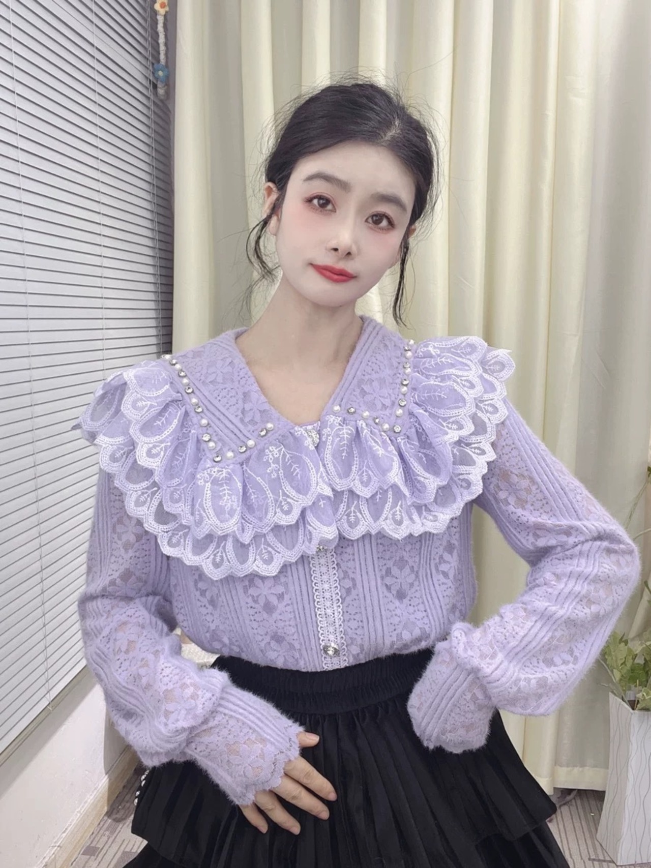 白 ピンク 紫 パープル ブラウス 黒 丸襟 デカ襟