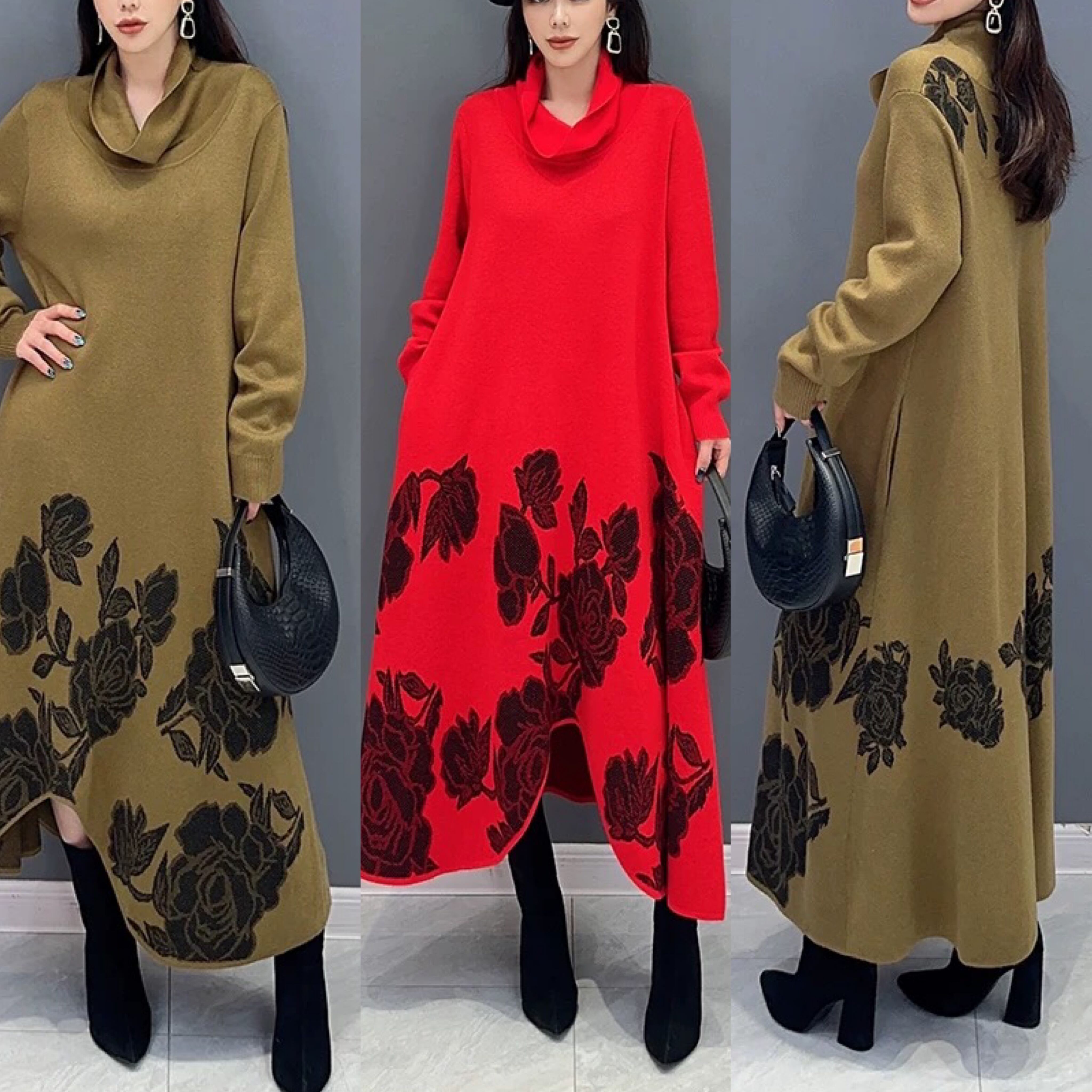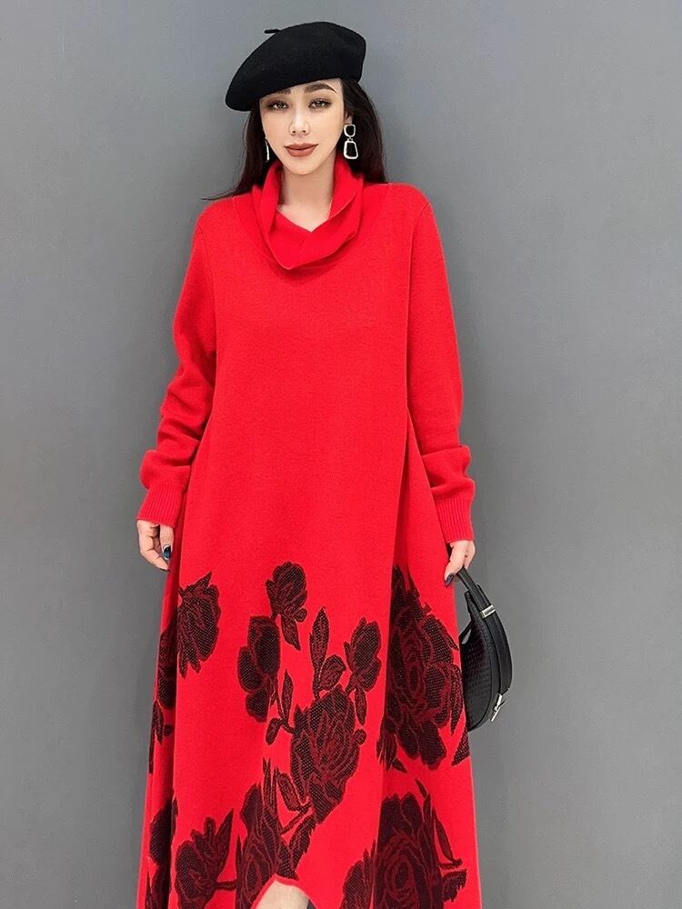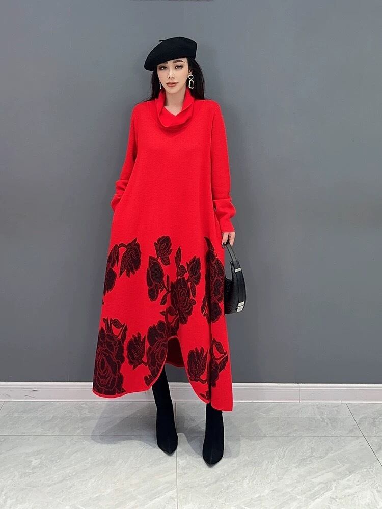 緑 赤 花柄 ゆったり ハイネック フラワワンピー