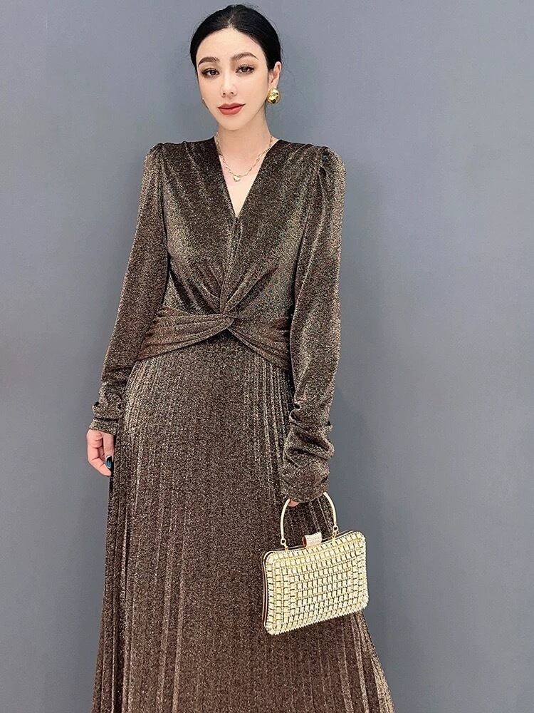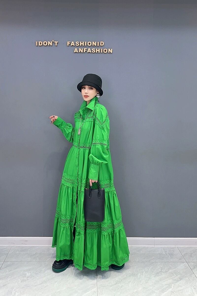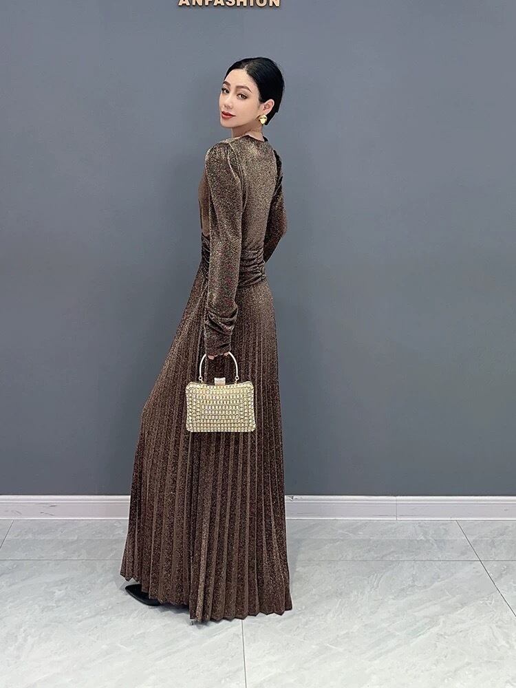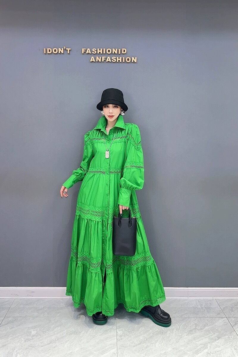 ワンピース ロング ゆったり 緑 黒 ベージュ ゴールド プリーツ