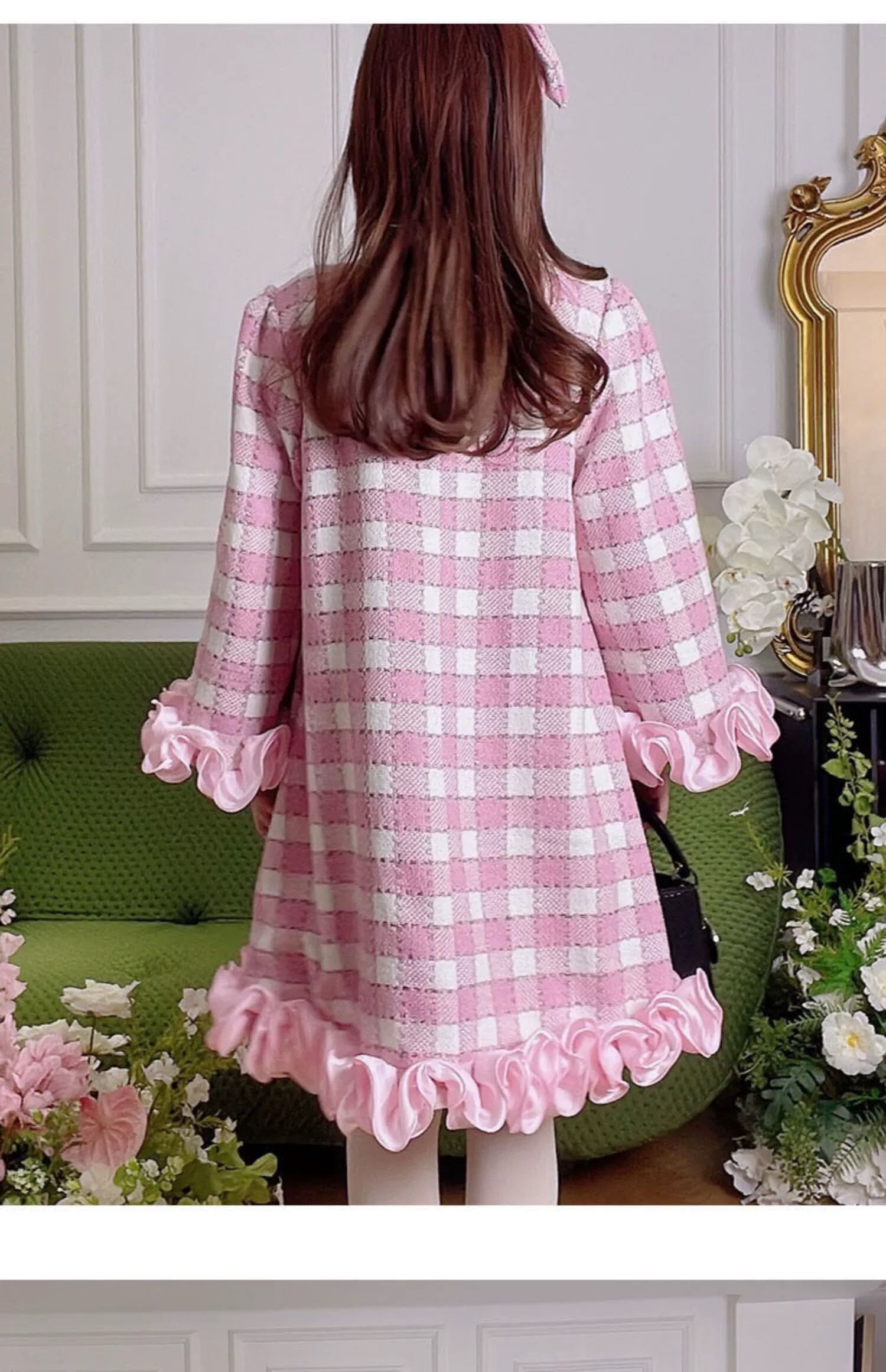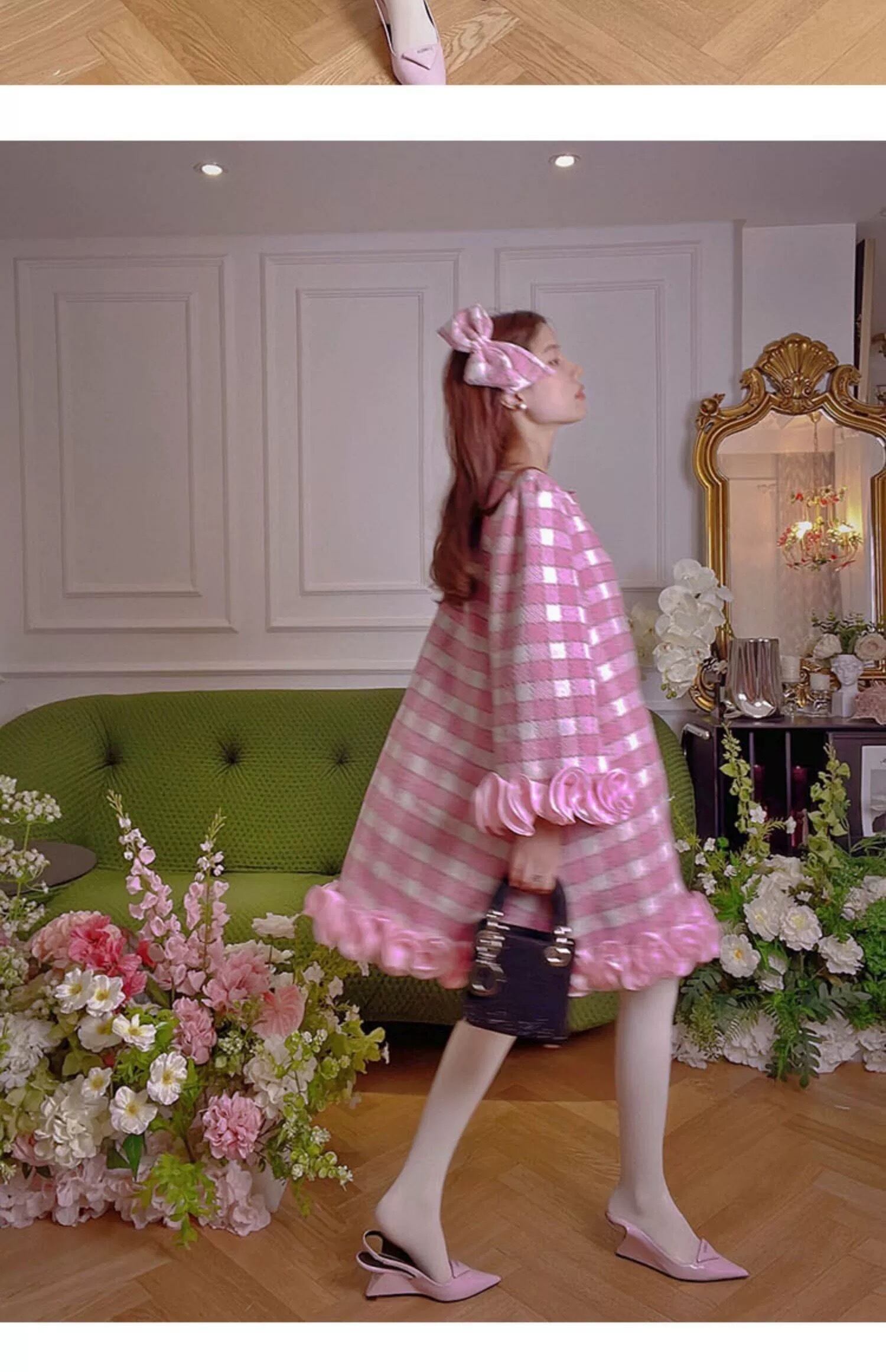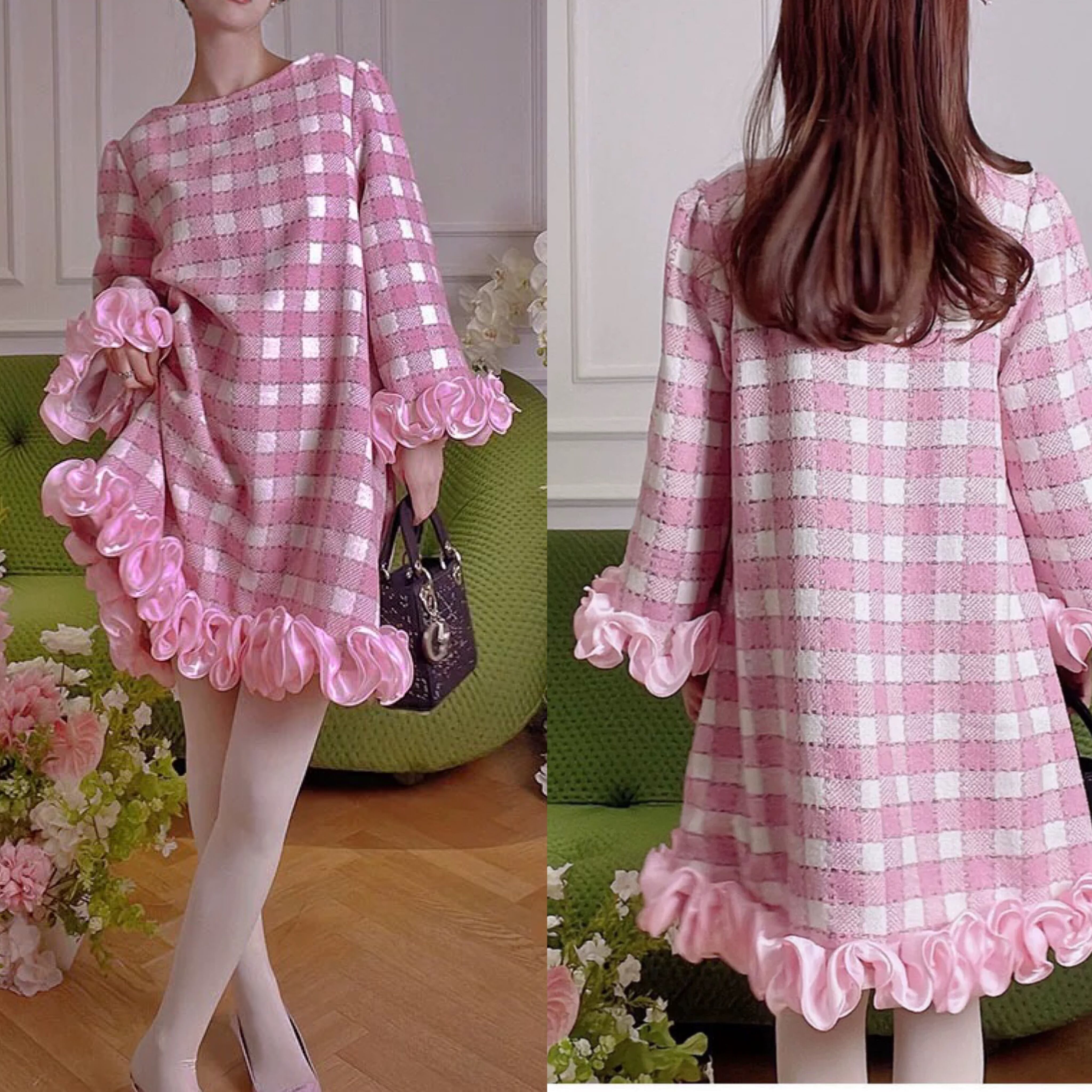 チェック ワンピース ゆったり ピンク カジュアル ブラウス リボン