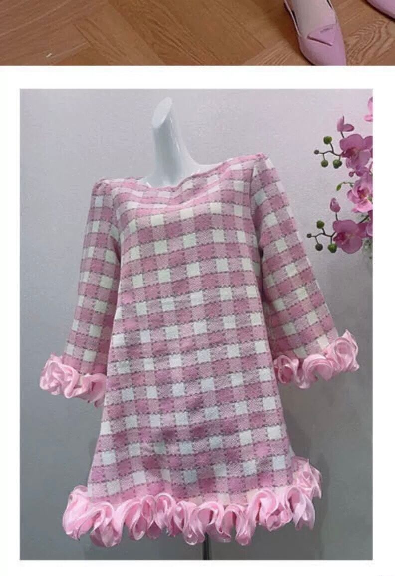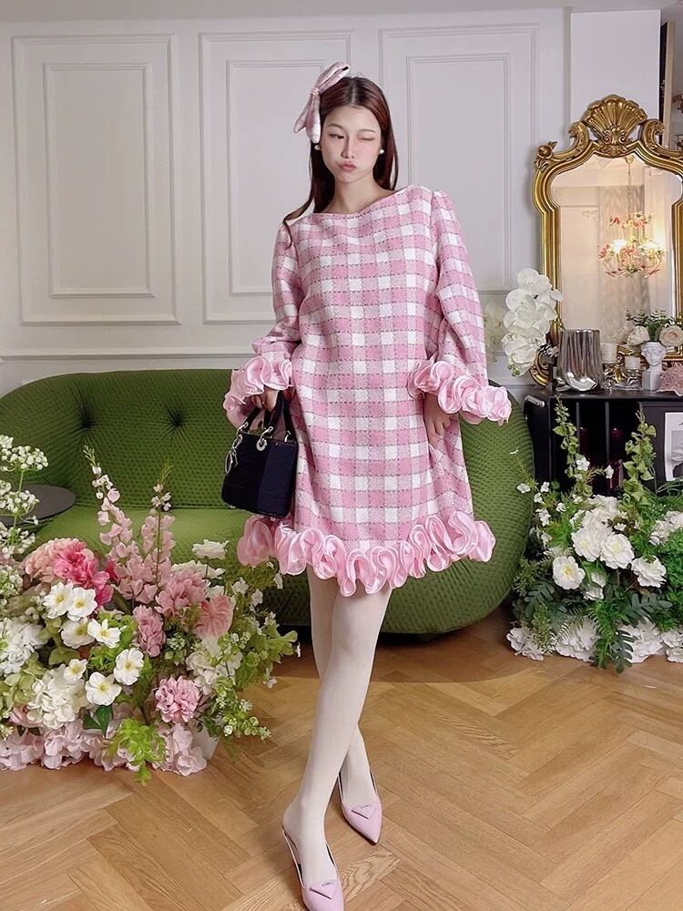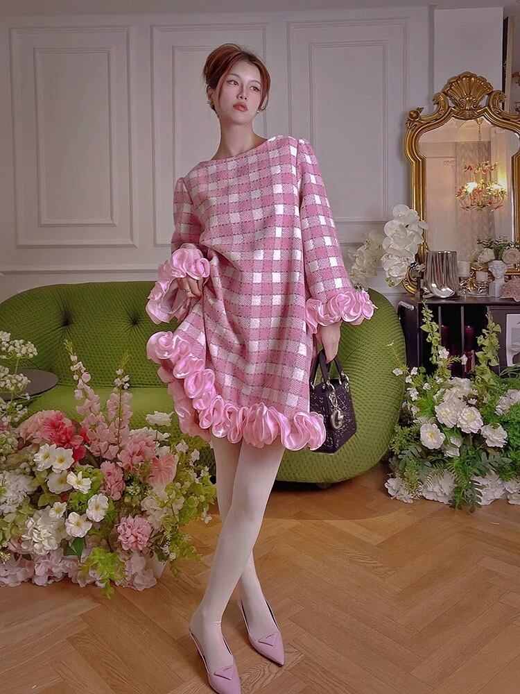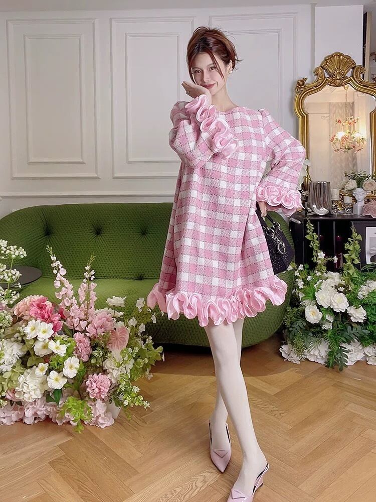 チェック ワンピース ゆったり ピンク カジュアル ブラウス リボン
