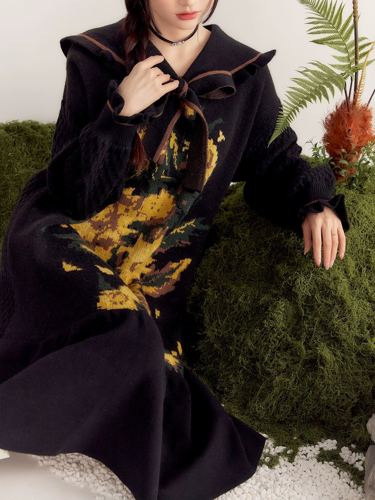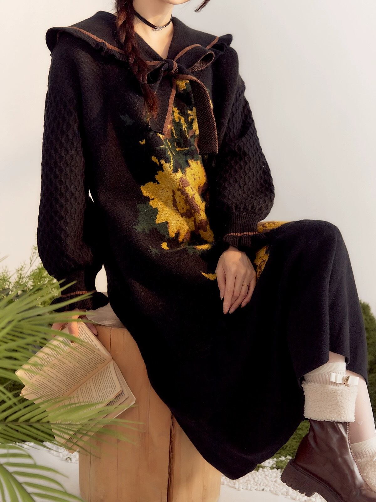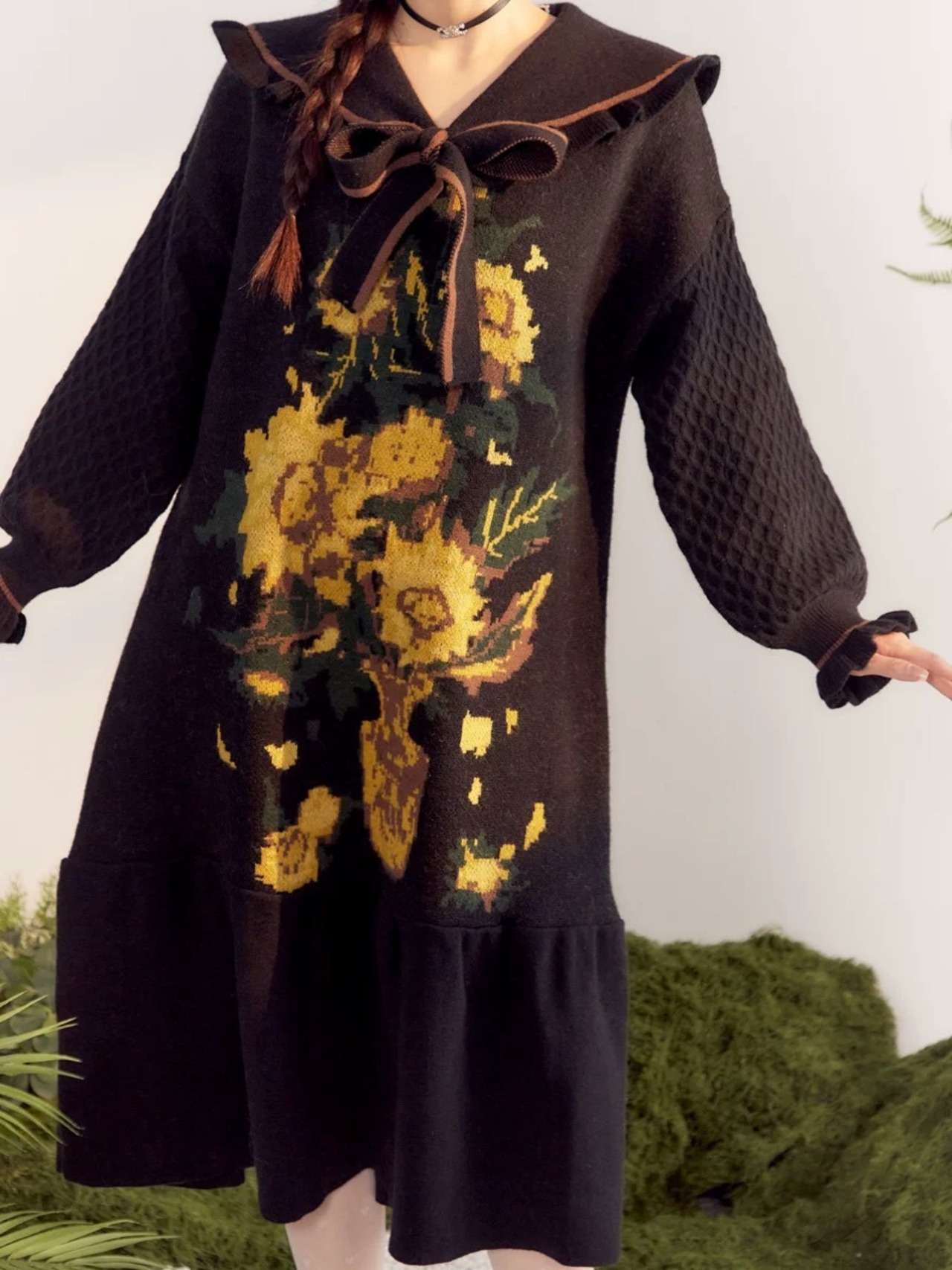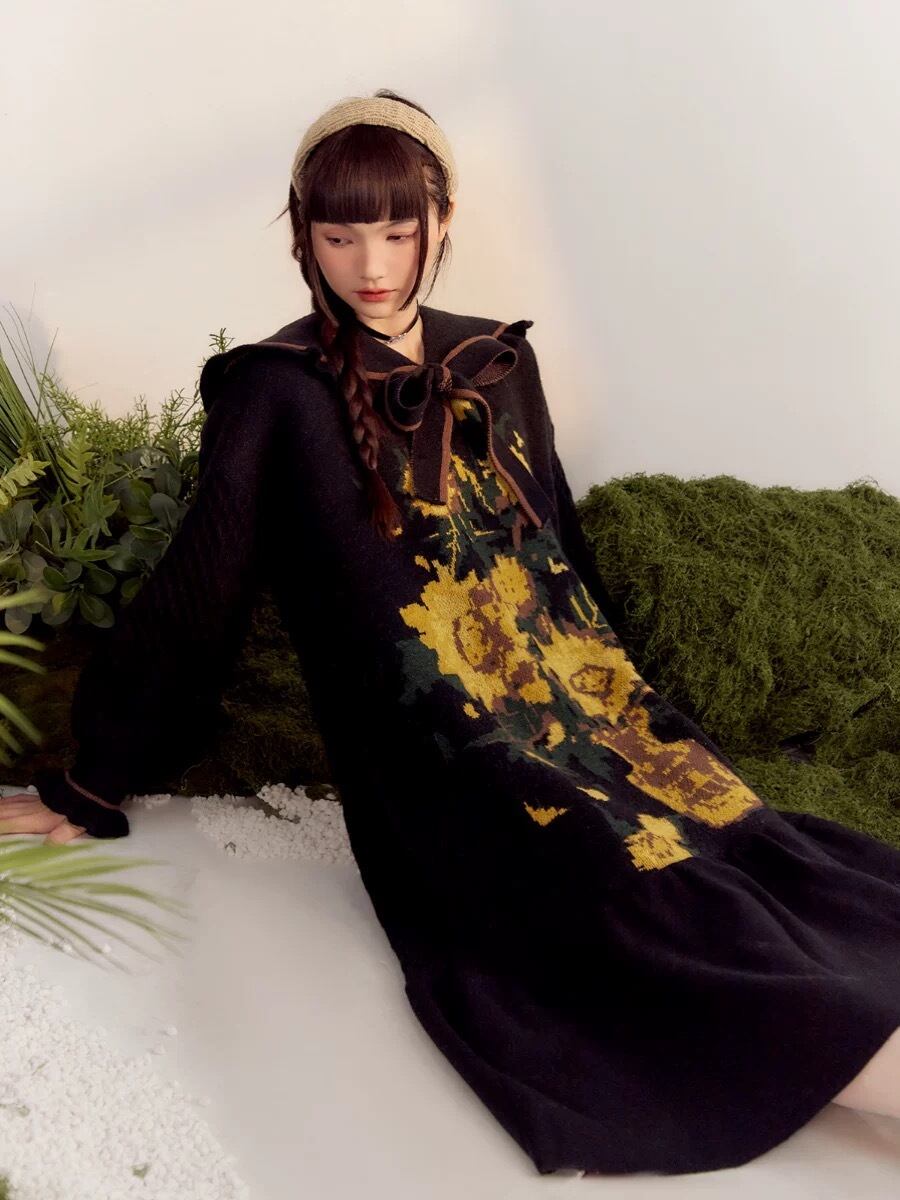 ニット ワンピース 茶色 ガーリー 花柄 黄色 フラワー リボン