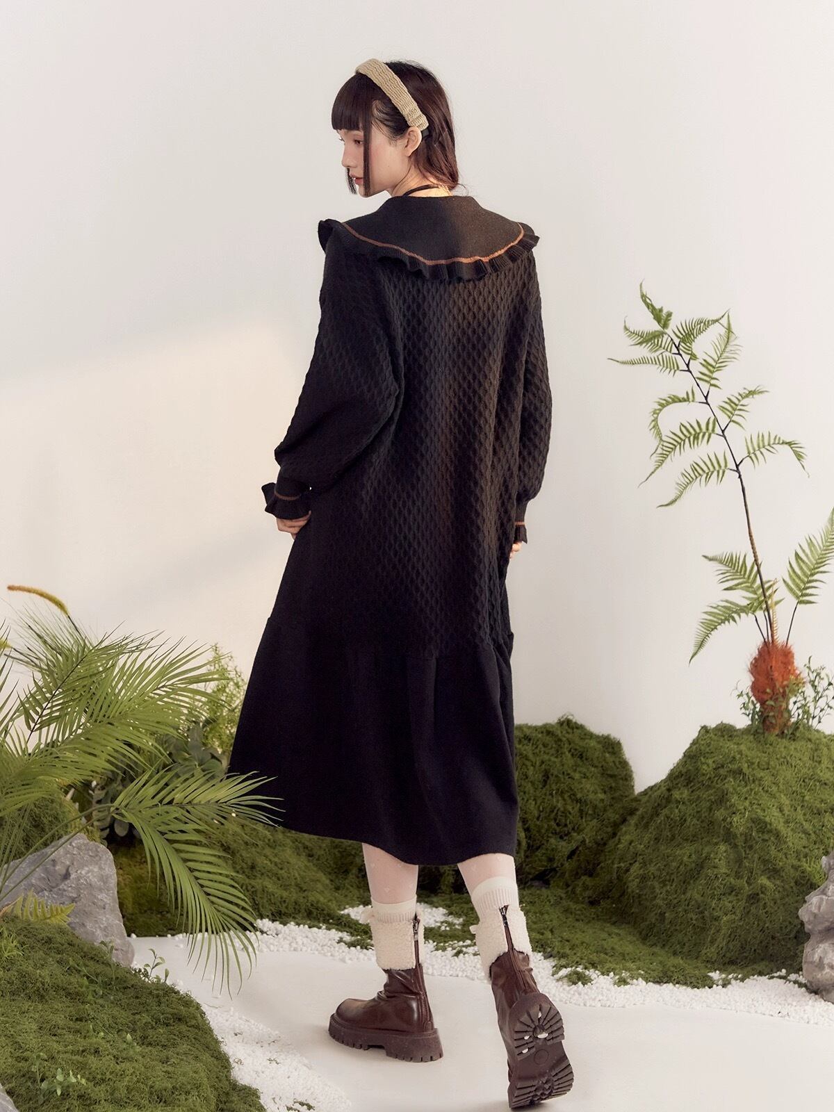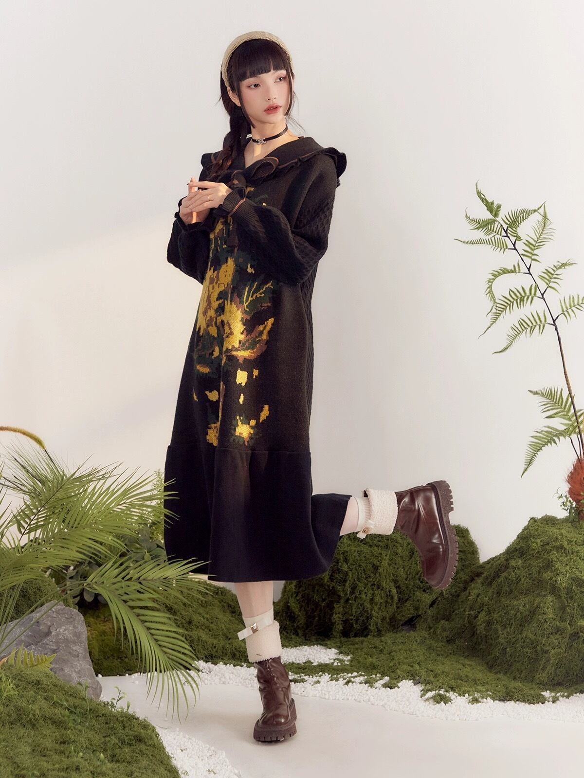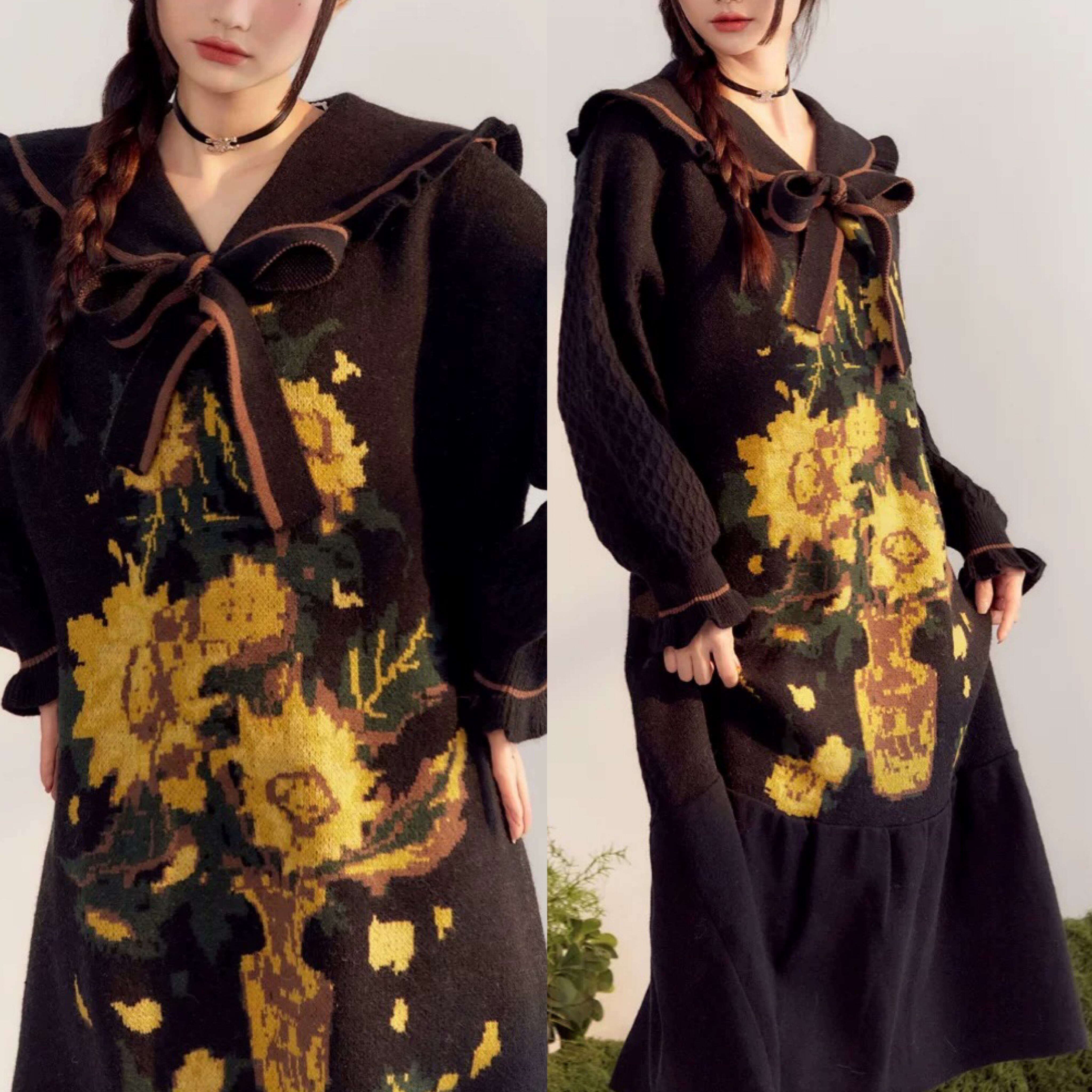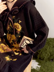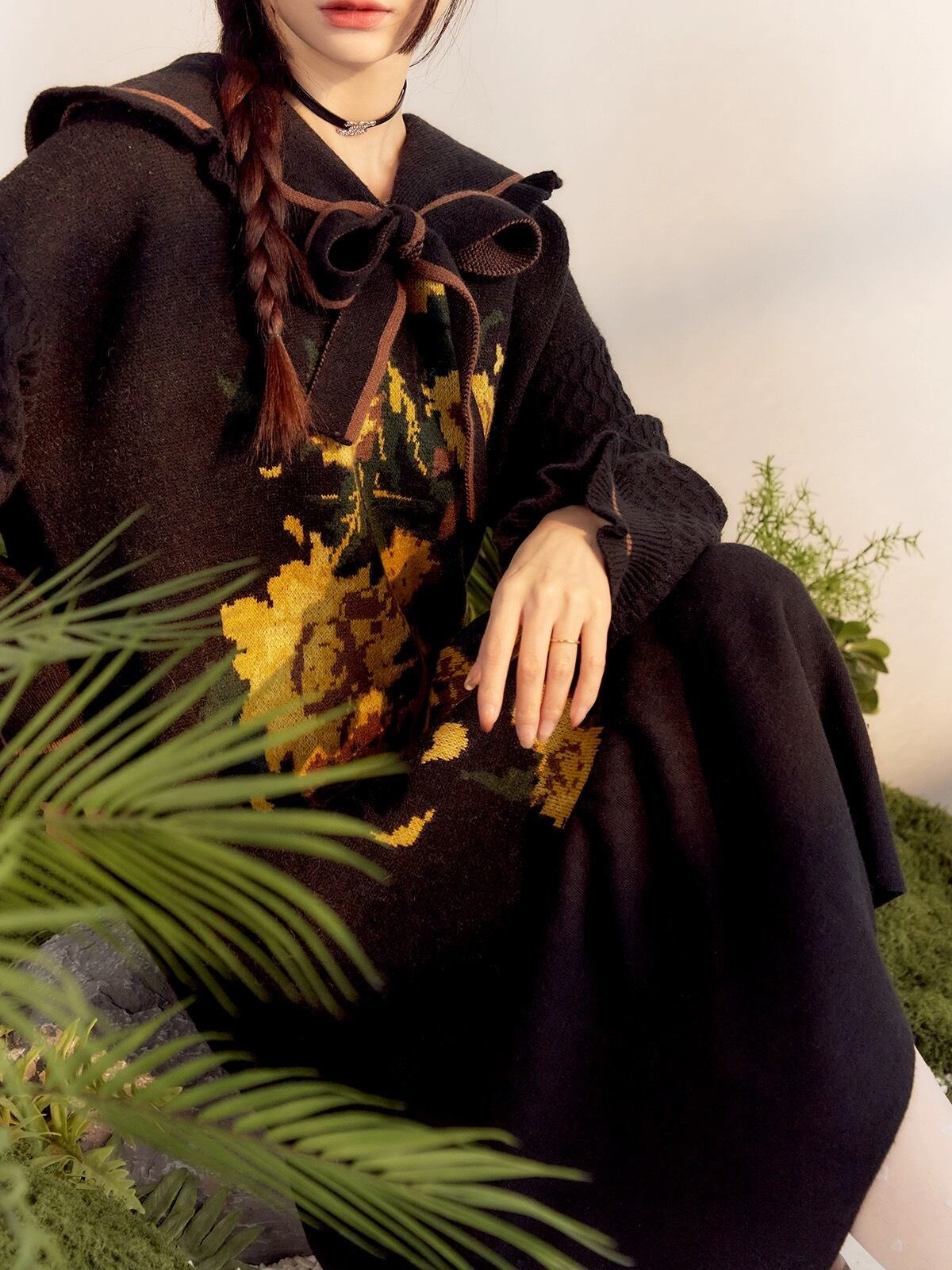 ニット ワンピース 茶色 ガーリー 花柄 黄色 フラワー リボン