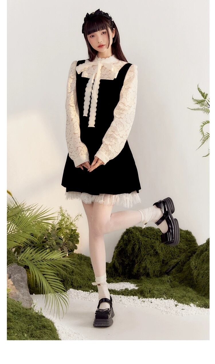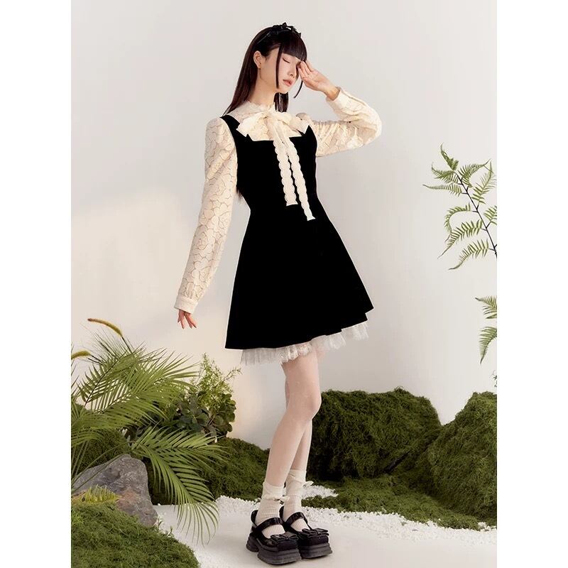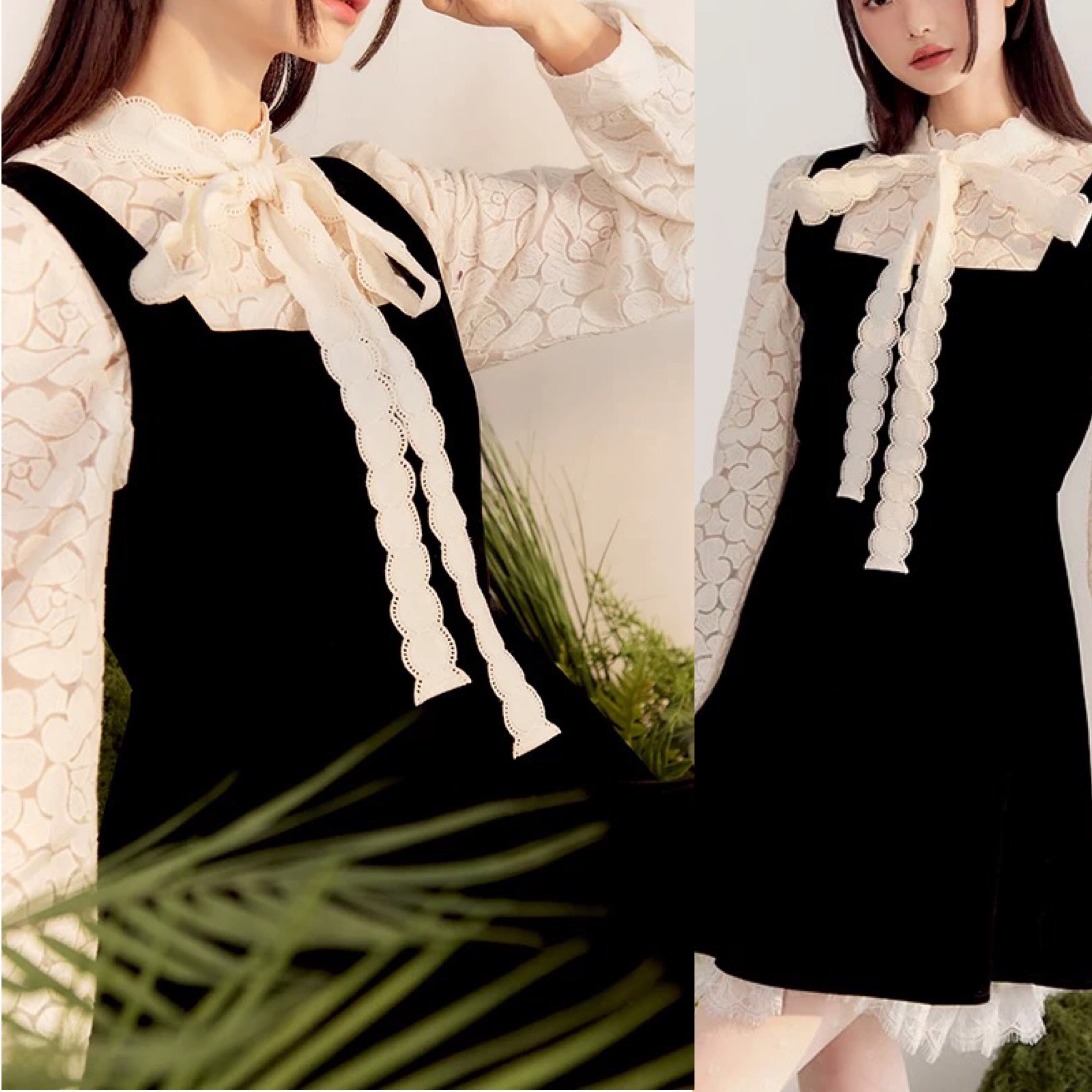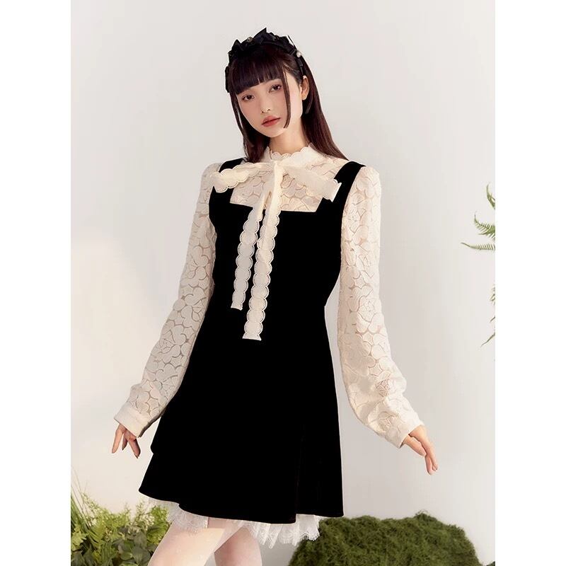 エレガント 黒 ブラウス リボン ワンピース お嬢様 フラワー 花柄