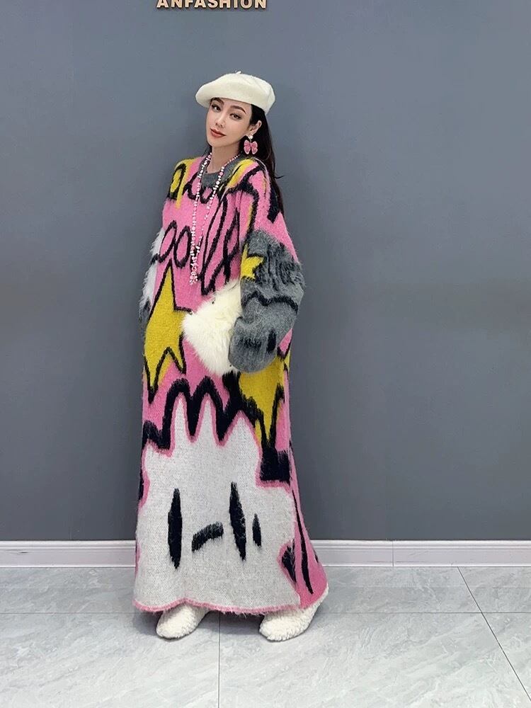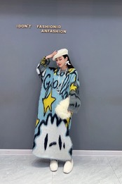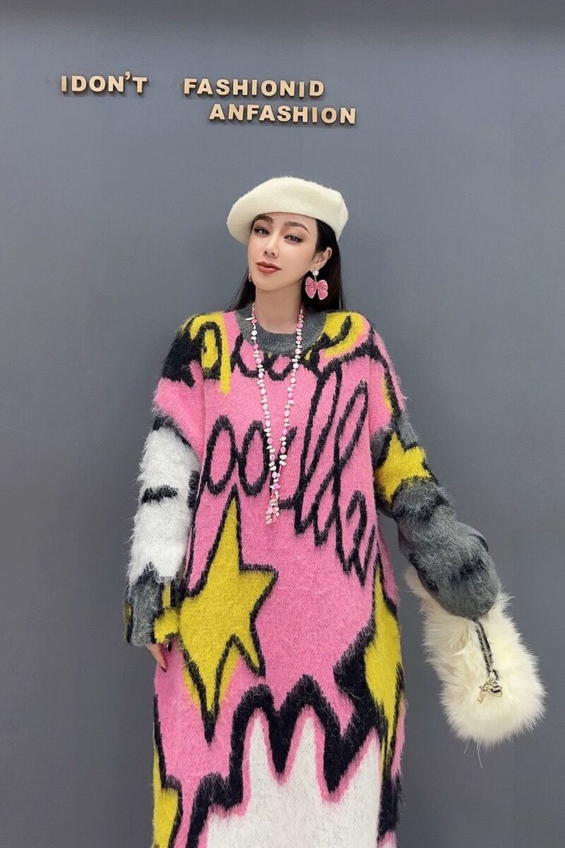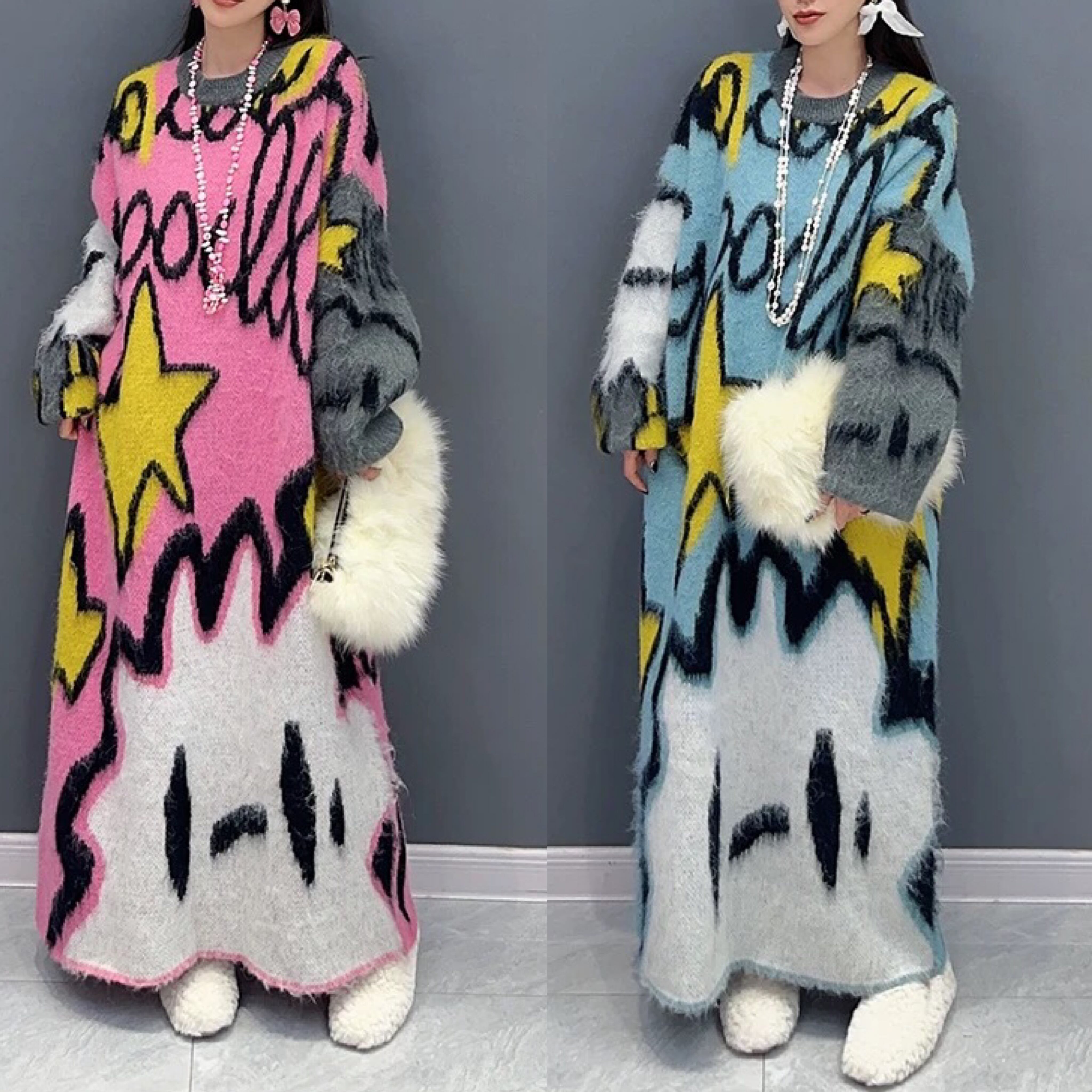 ピンク 水色 カジュアル セーター 原宿 ワンピース マキシ ゆったり カジュアル 黄色 星 スマイル 空 くも
