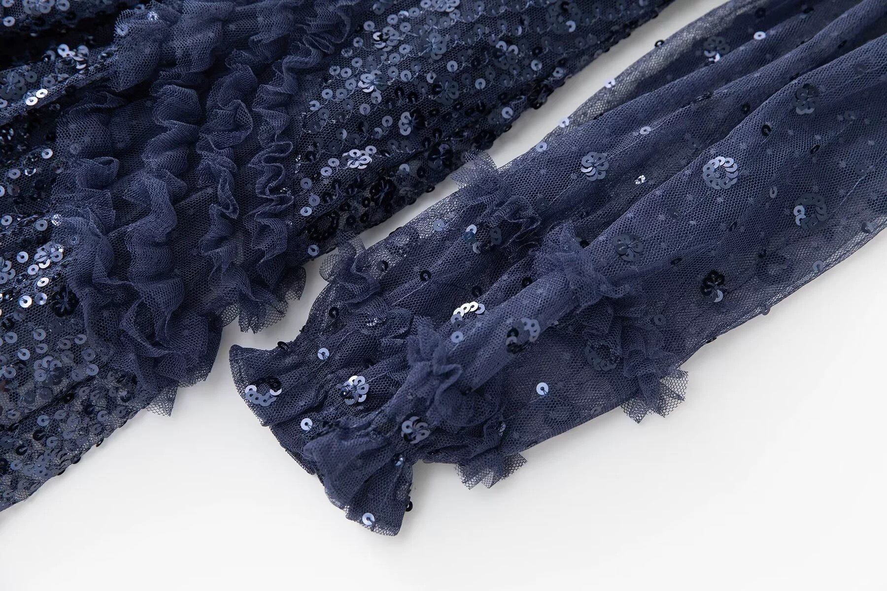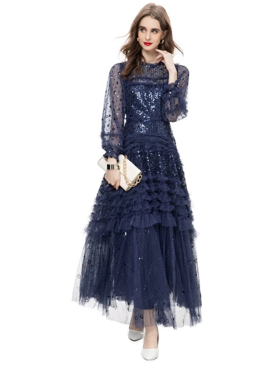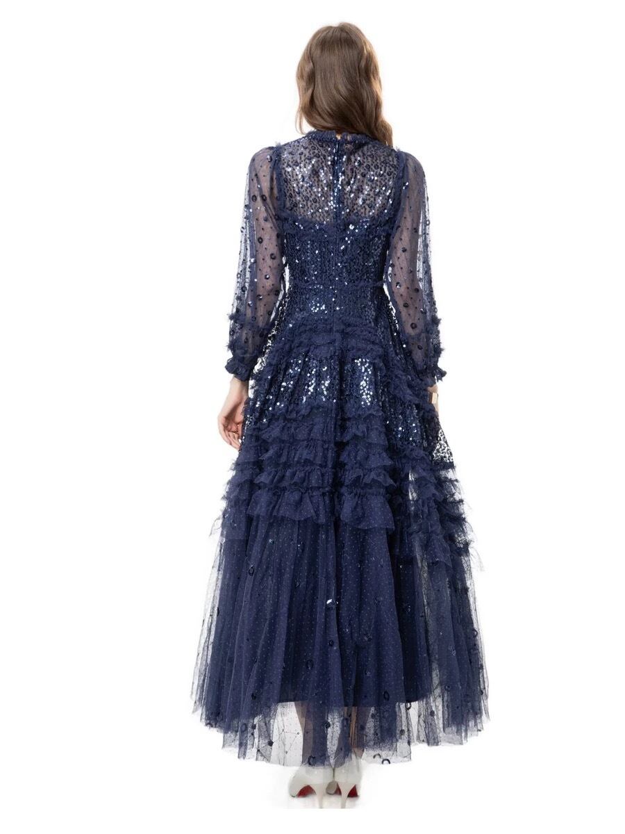 ネイビー ワンピース キラキラ スパンコール ラインストーン シースルー ブラウス スカート ワンピース ドレス XL