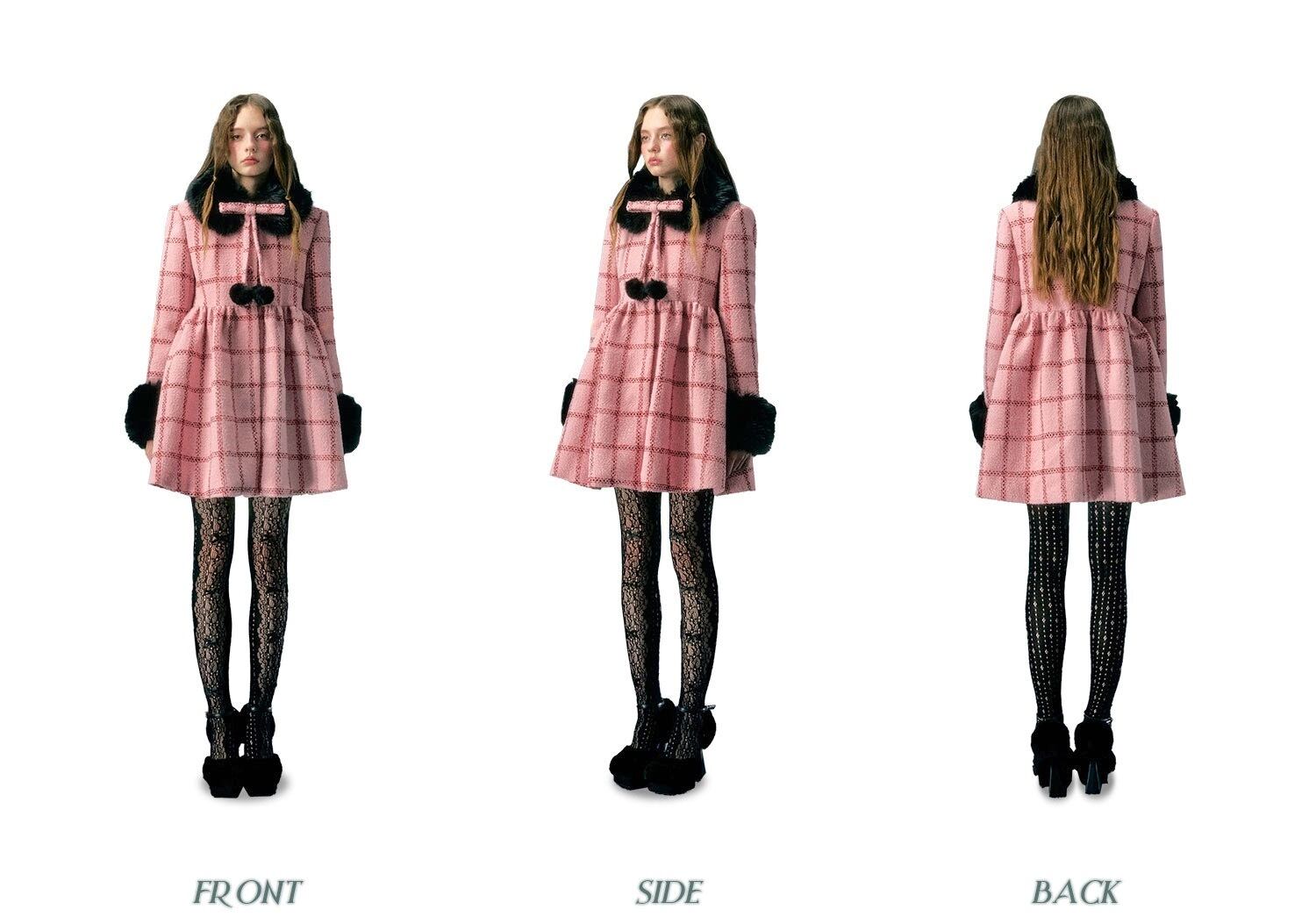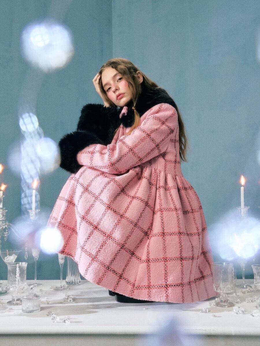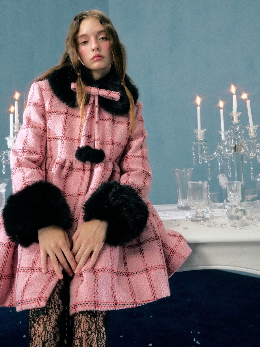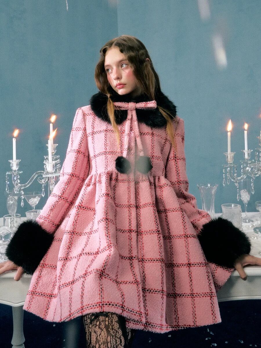 丸襟 ピンク チェック 黒 ファー ワンピース ドレス コート ゴージャス
