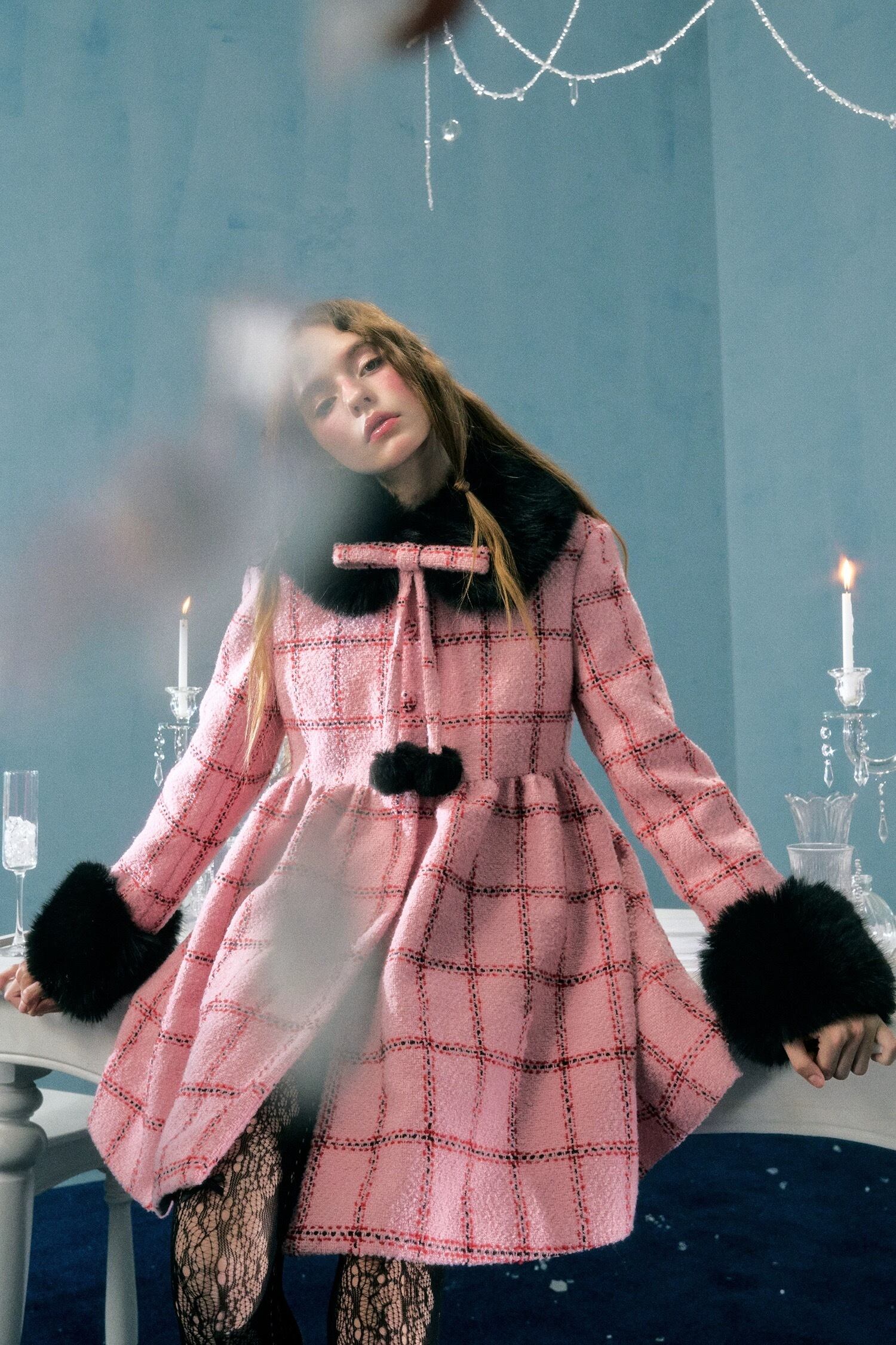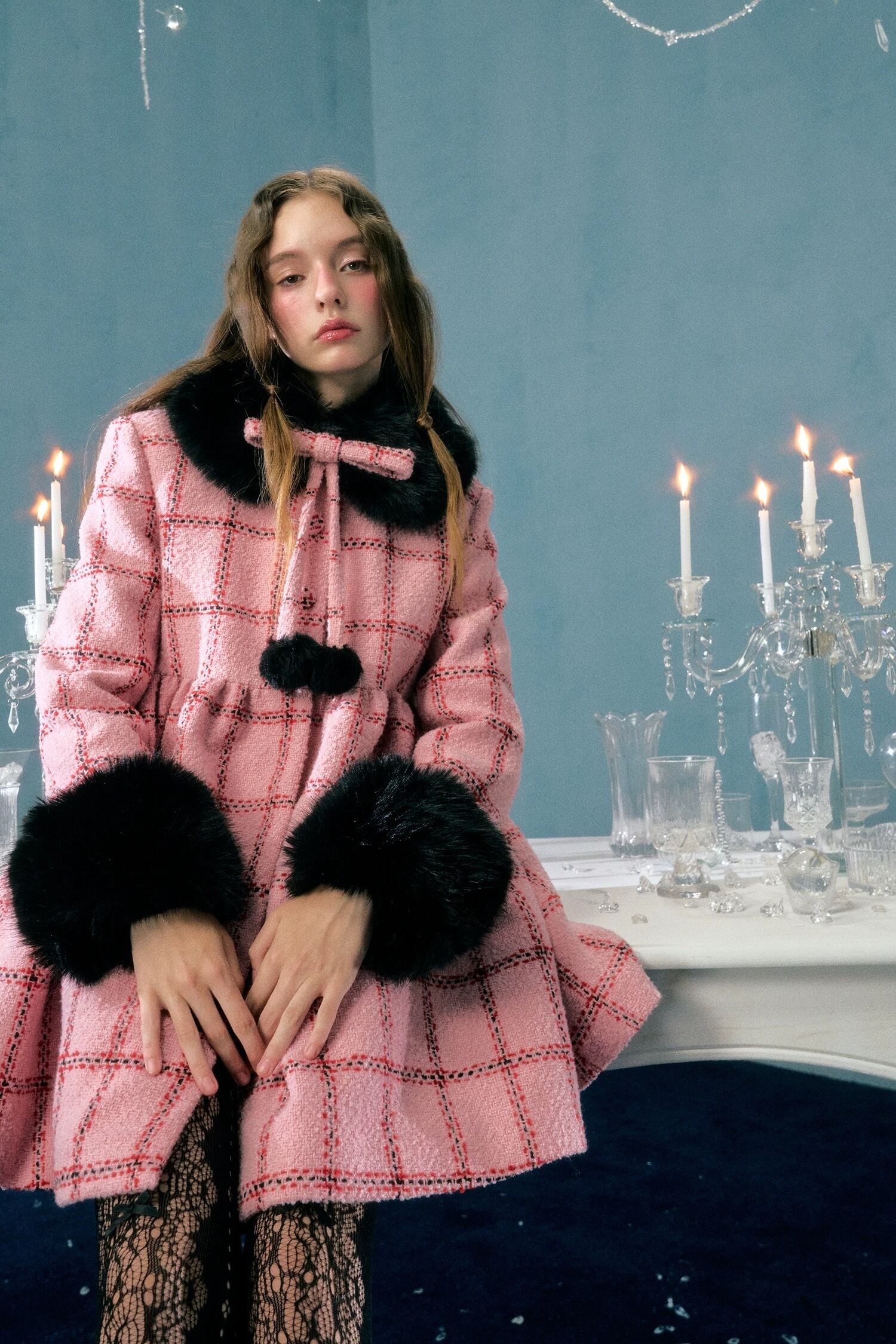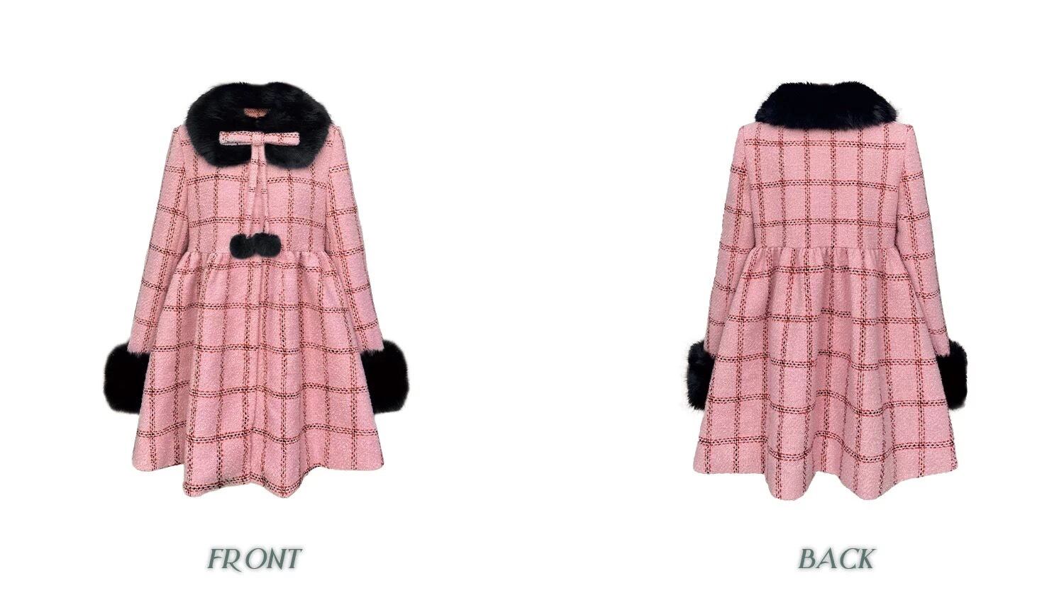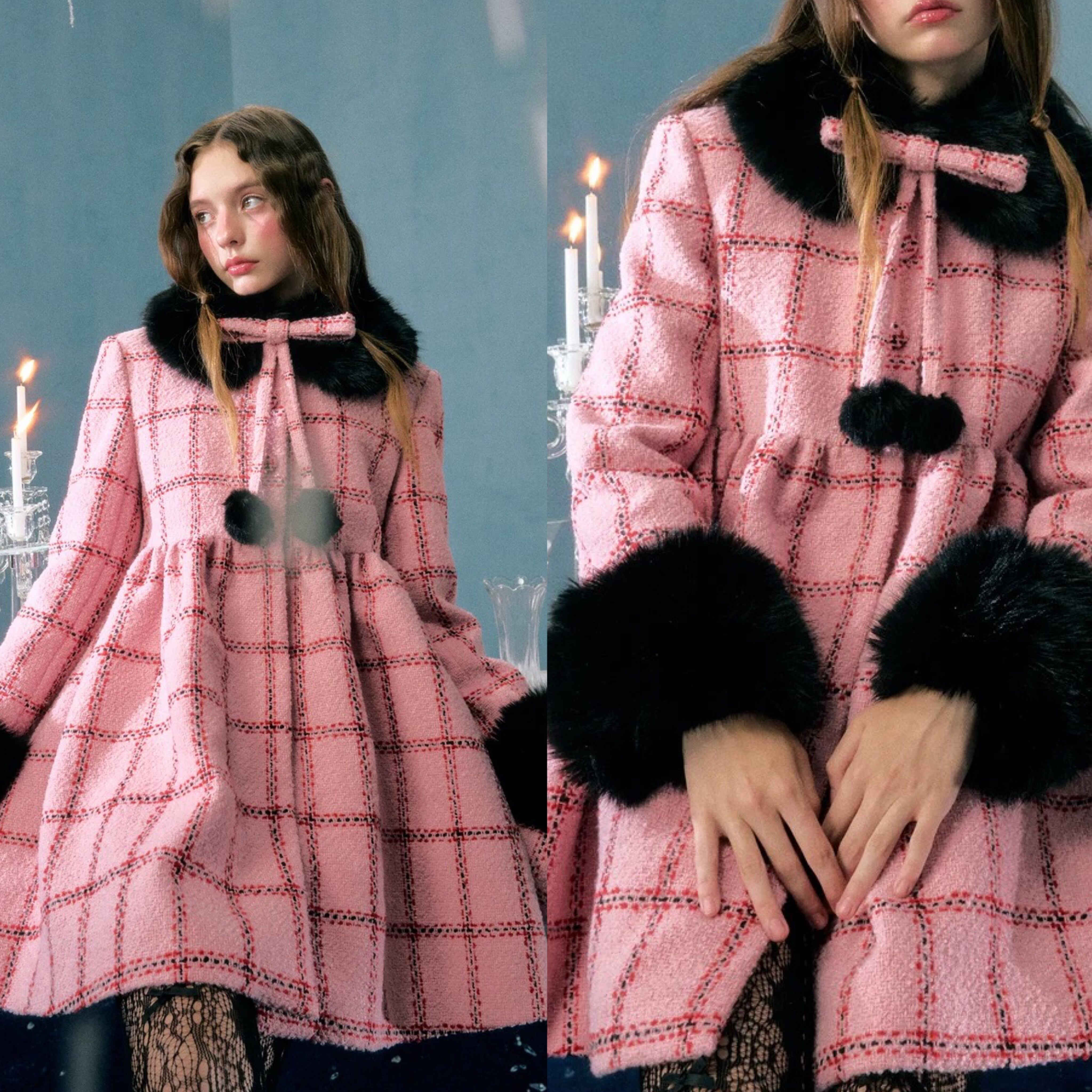 丸襟 ピンク チェック 黒 ファー ワンピース ドレス コート ゴージャス